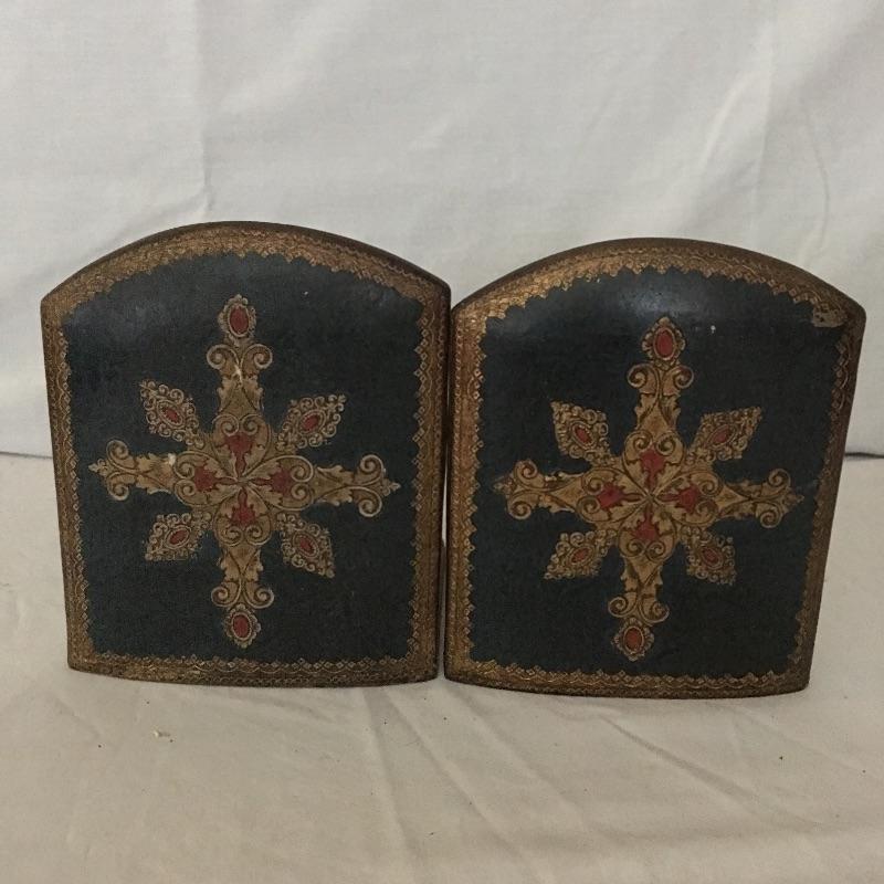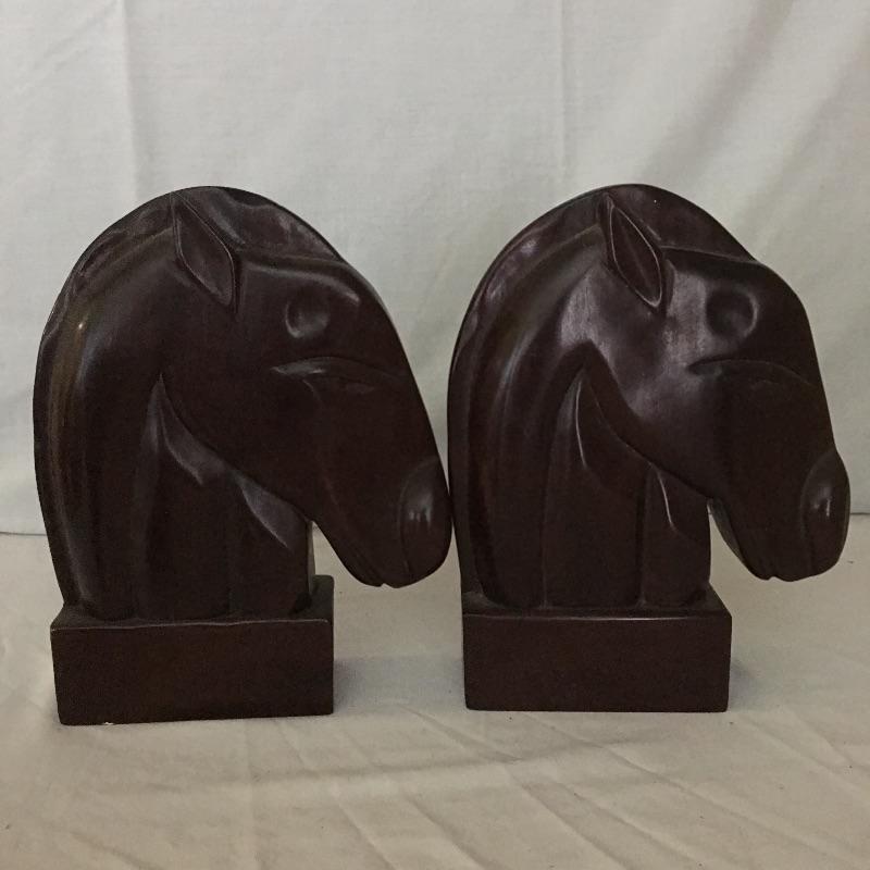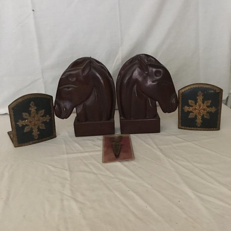 Two pairs of bookends includes hand made mahogany horse heads from Haiti, brass weathervane bookmark and a pair of gilded bookends with an Italian flare. A great way to hold your books and enhance the look of your bookcase. Horse heads measure 7” x 9” x 2.25”.