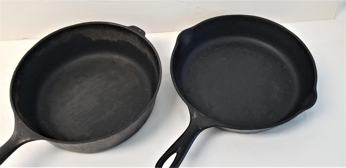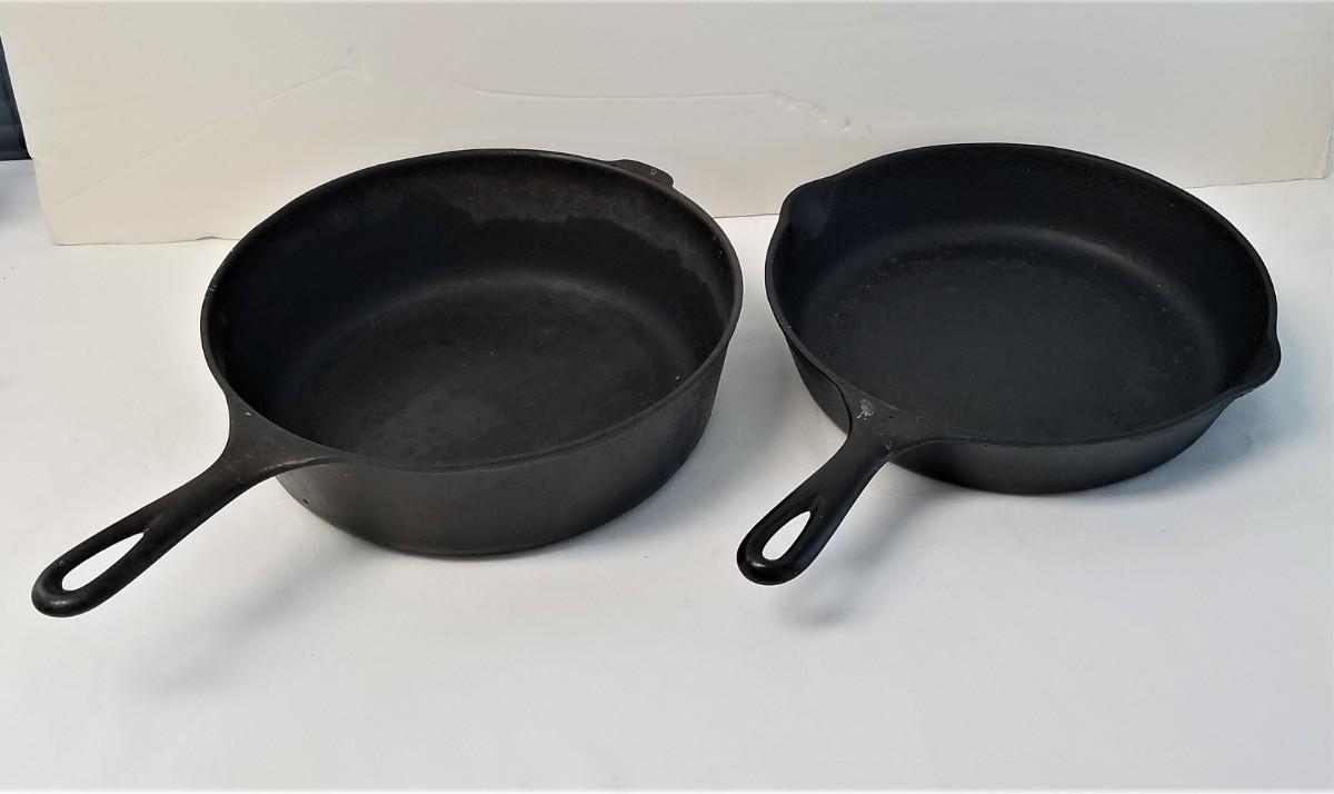 Two good Wagner skillets - one has a pour spout on both sides, 11" across, 2" deep, the other is a deep skillet, 10" across and 3" deep. Both in good used condition.