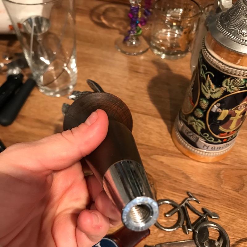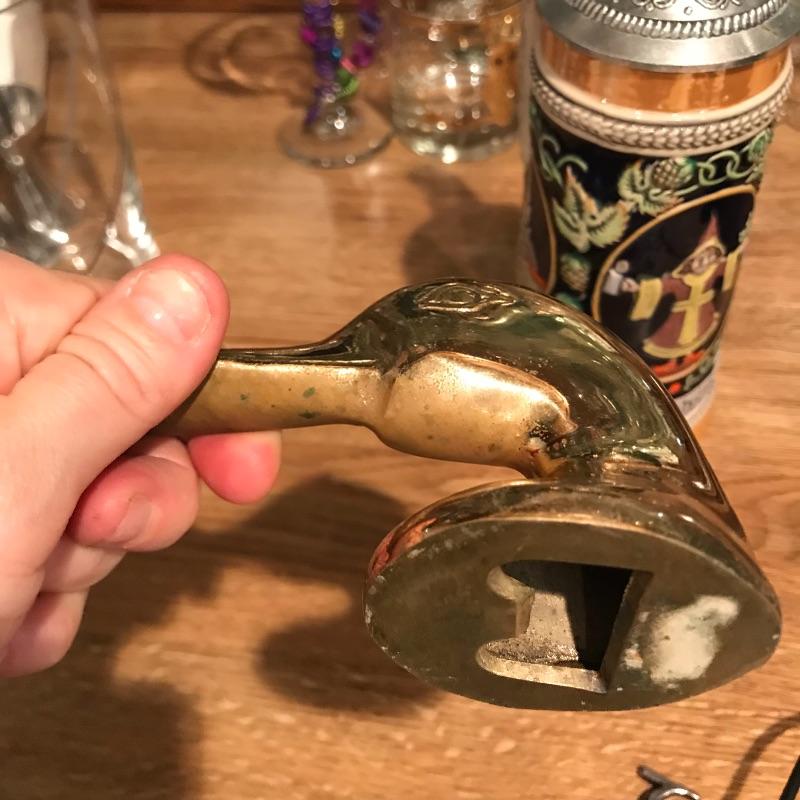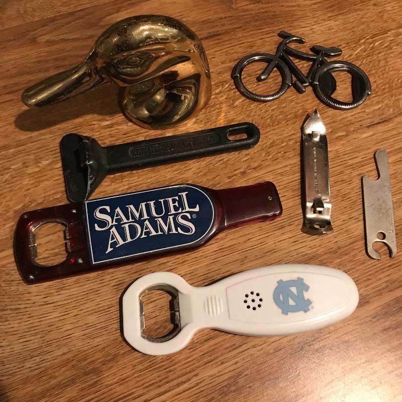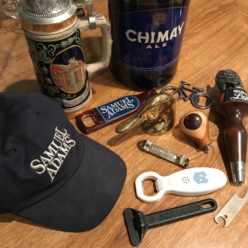 Lot includes a West German Stein, and a variety of useful beer collectibles that include bottle openers of various types and sizes, ball cap, a tap, and a giant empty Chimay Ale Grande Reserve bottle. Shipping available.