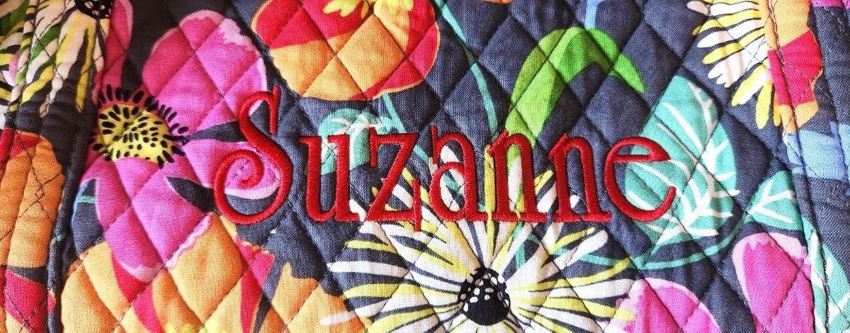 Vera Bradley (authentic) Weekender bag in the Zazzy Blooms pattern. Gently used, clean. Note: has name "Suzanne" embroidered on one side - a monogram place can easily remove this and substitute YOUR name. Perfect for Gym or travel/carry on..