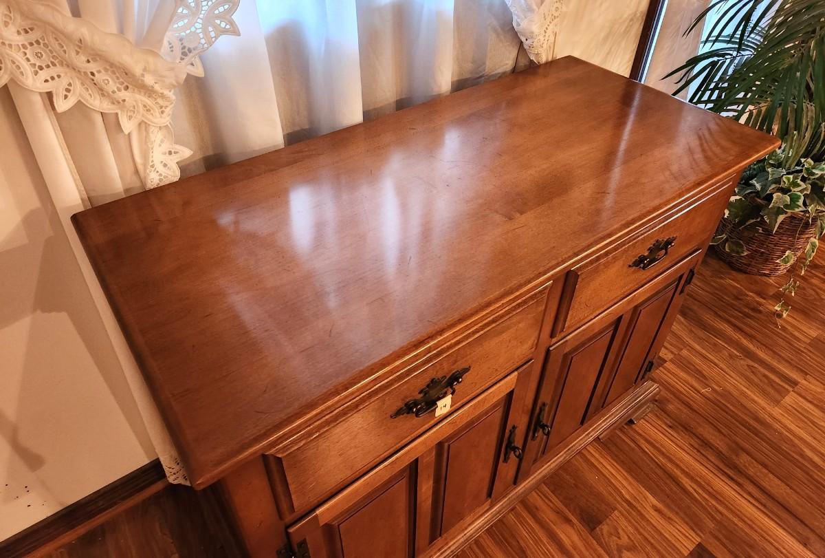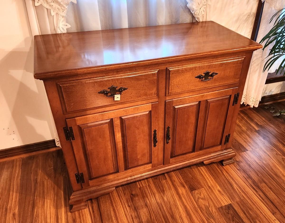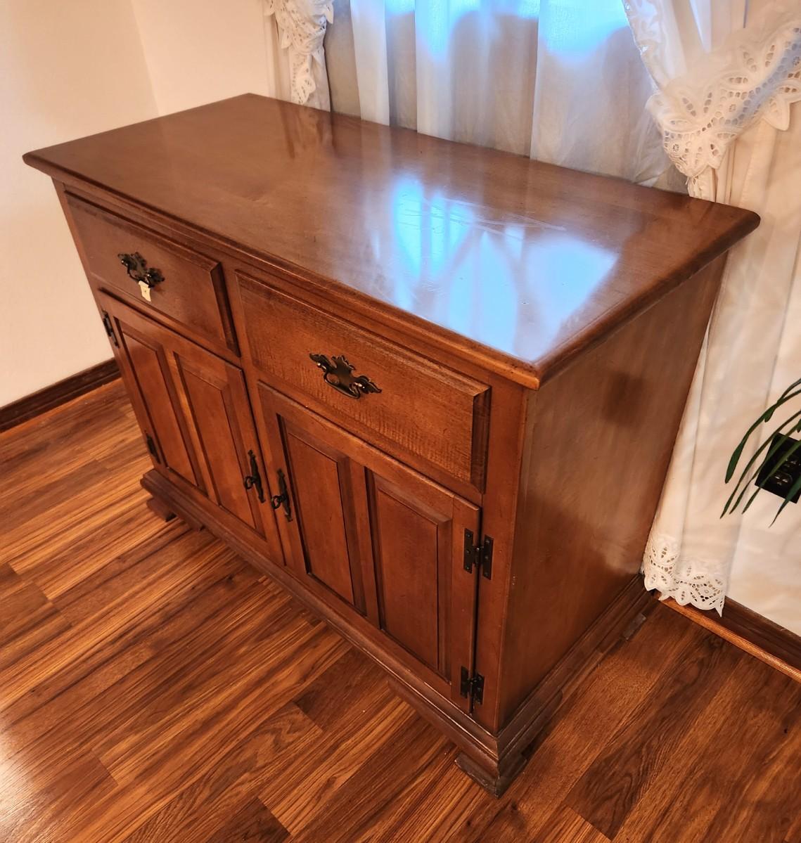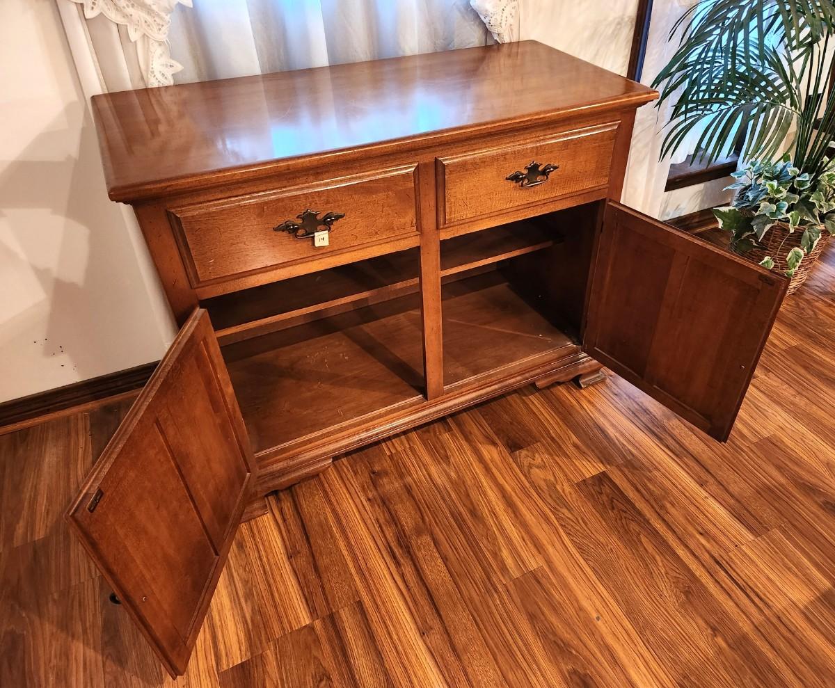 Classic 1970's Colonial style server - 2 drawers - storage beneath, Maple w/cherry finish. Good used condition, 42" across, 19" deep, 32" tall.