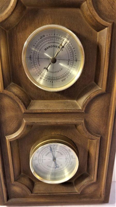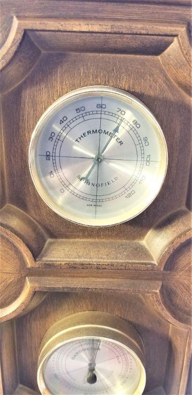 1970's Weather station with barometer, thermometer, humidity gauge - made by Springfield Co. Measures 19.25" x 7.75" wide (length does not count ring at top). Faux wood cabinet. Appears to be in working order - good vintage condition.