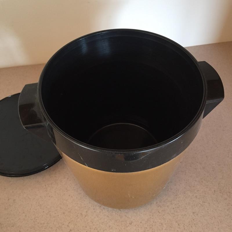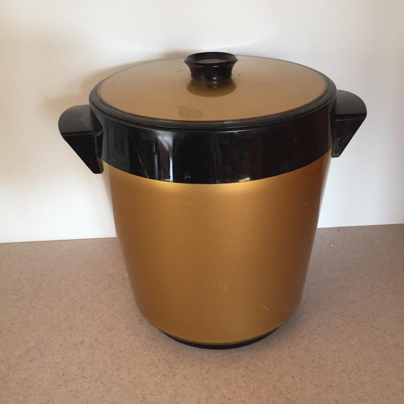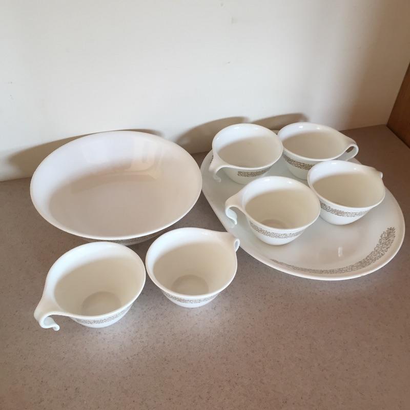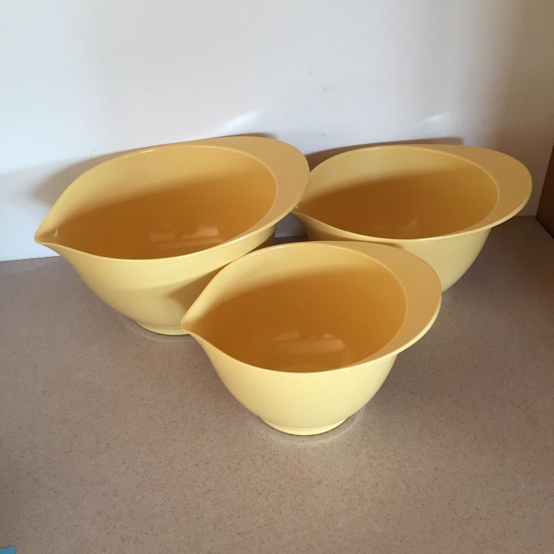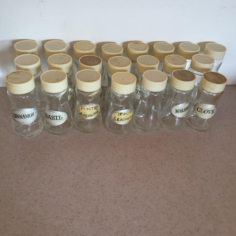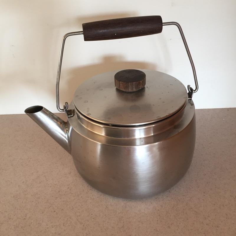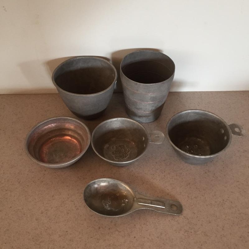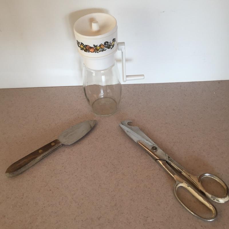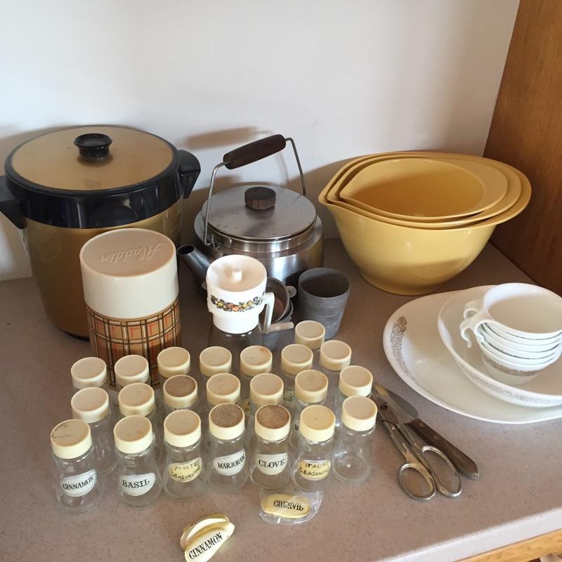 Great array of kitchen essentials including Farberware tea kettle(with wooden handle and top), MCM ice bucket , Williams-Sonoma nesting mixing bowls , old school thermos, glass spice containers, Corelle dishes, aluminum measuring pieces and more. These kitchen utensils will bring back memories. One nesting bowl has chip - see pictures