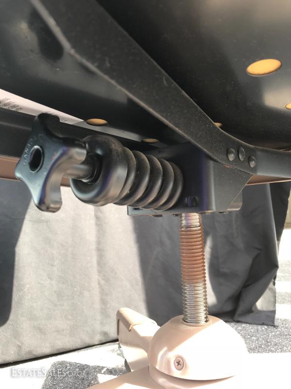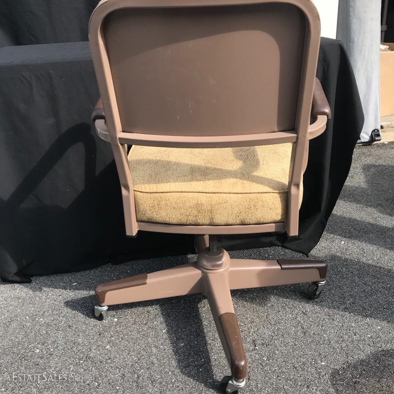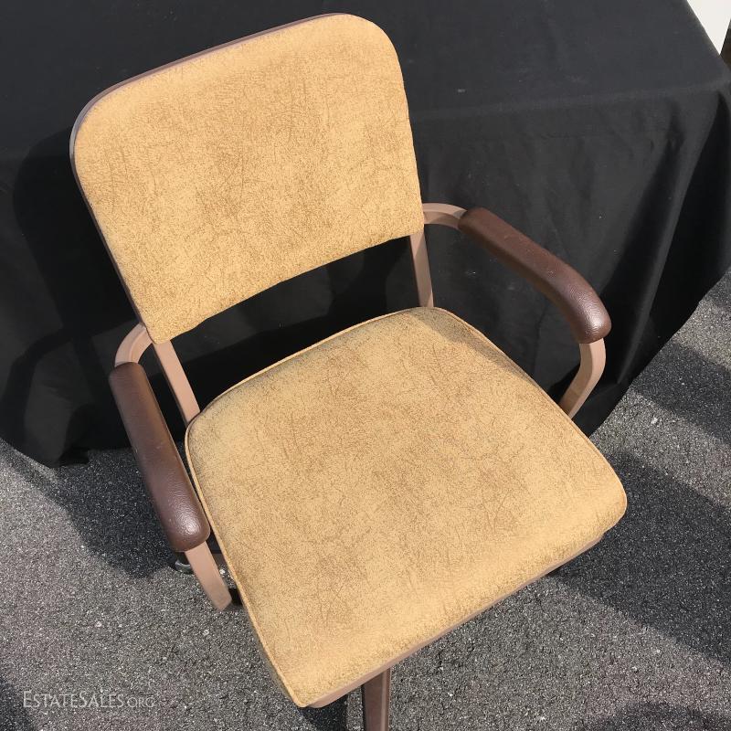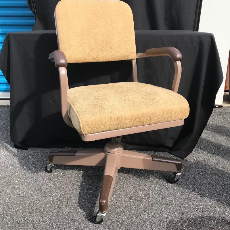 Metal, adjustable rolling and rocking chair with new upholstery, in cream and gold with distressed-looking fabric. Great vintage piece with a modern flare. Chair base measures 21” diameter. This item is available for local pick up in Asheville, NC only.