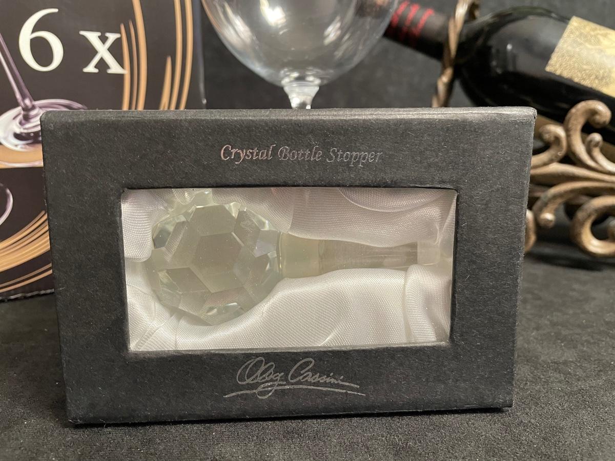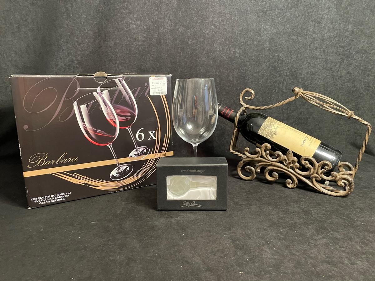 Set of 6 red wine glasses, metal wine bottle stand, crystal bottle stopper
