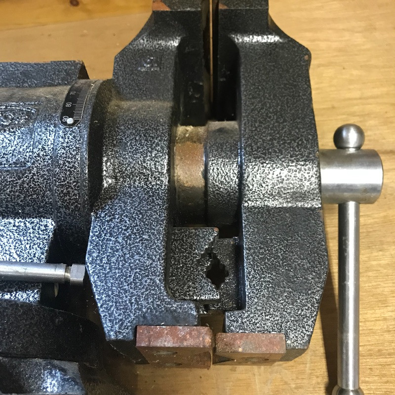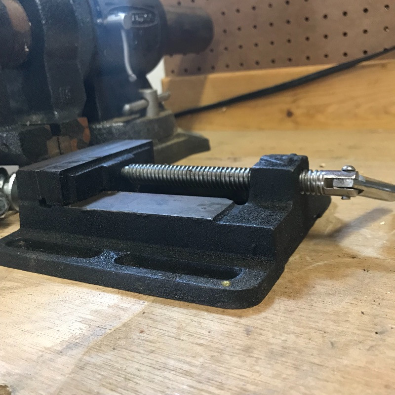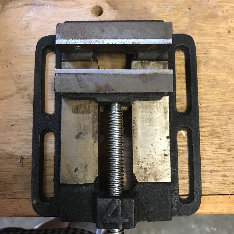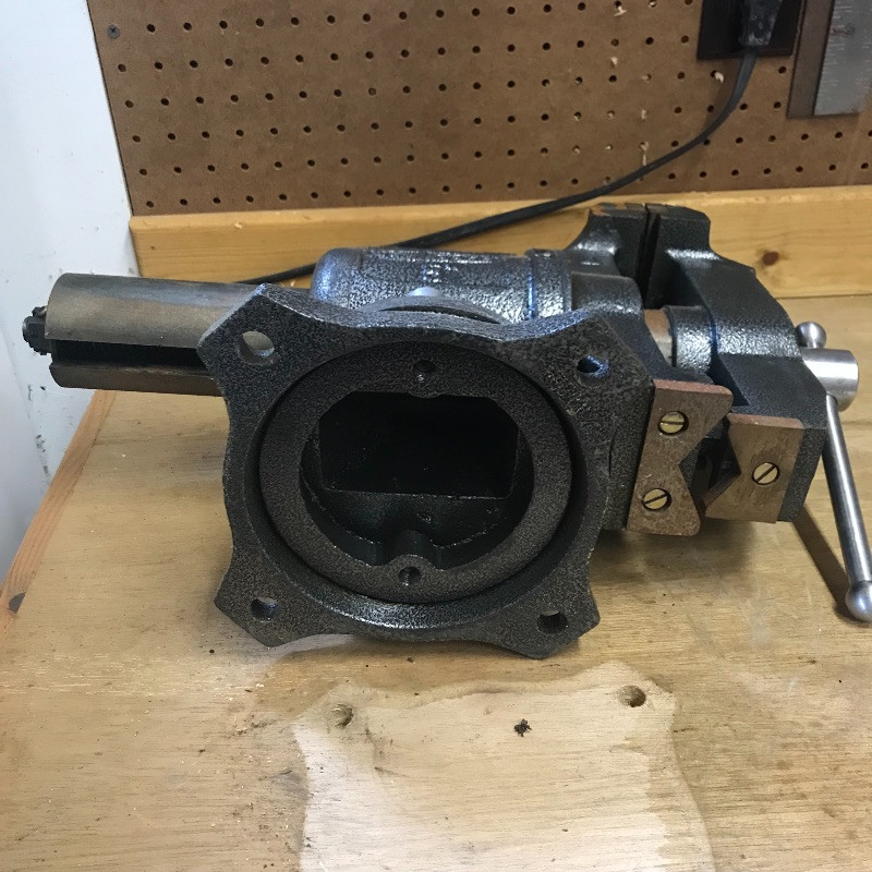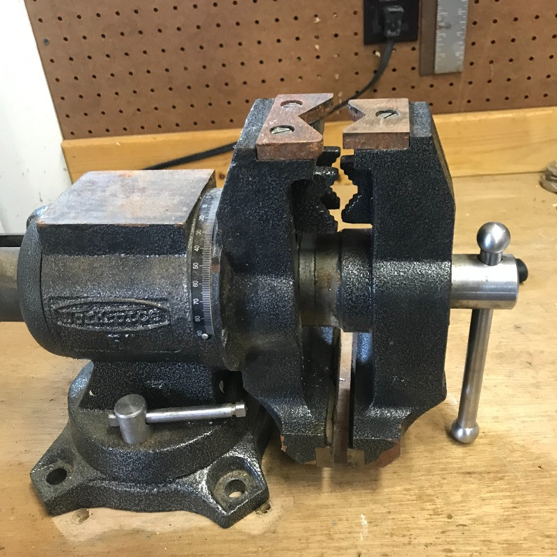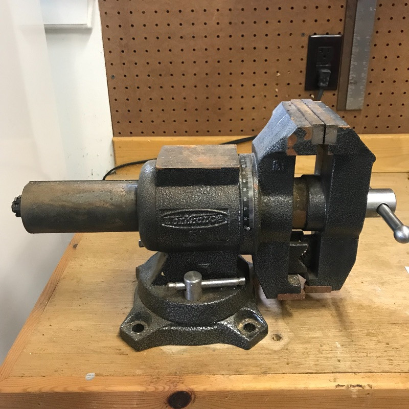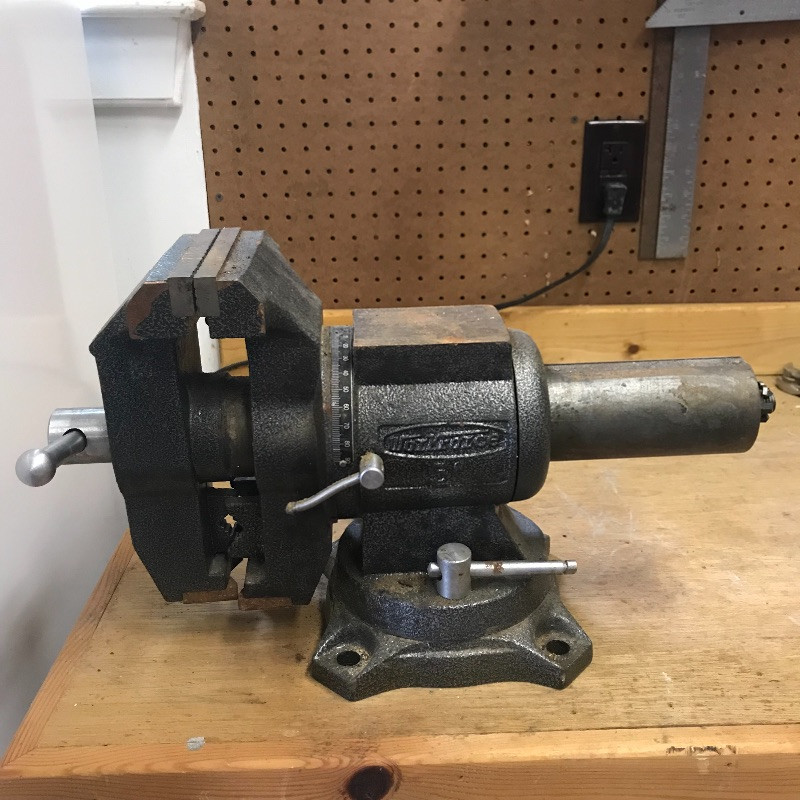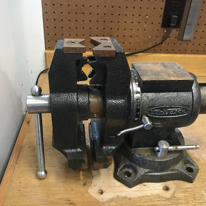 Heavy duty rotating WorkForce 5 Bench Vise. Handles moves and rotates easily, it appears to be in great condition. Comes with four large nuts and bolts to attach it to your work bench. This iece is very heavy and very sturdy. Second 4” Vise is smaller for more precision and stamped 4. It also appears to be in fine shape.