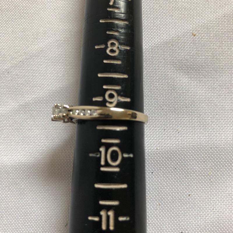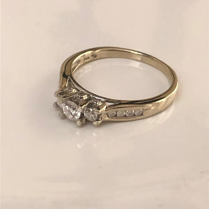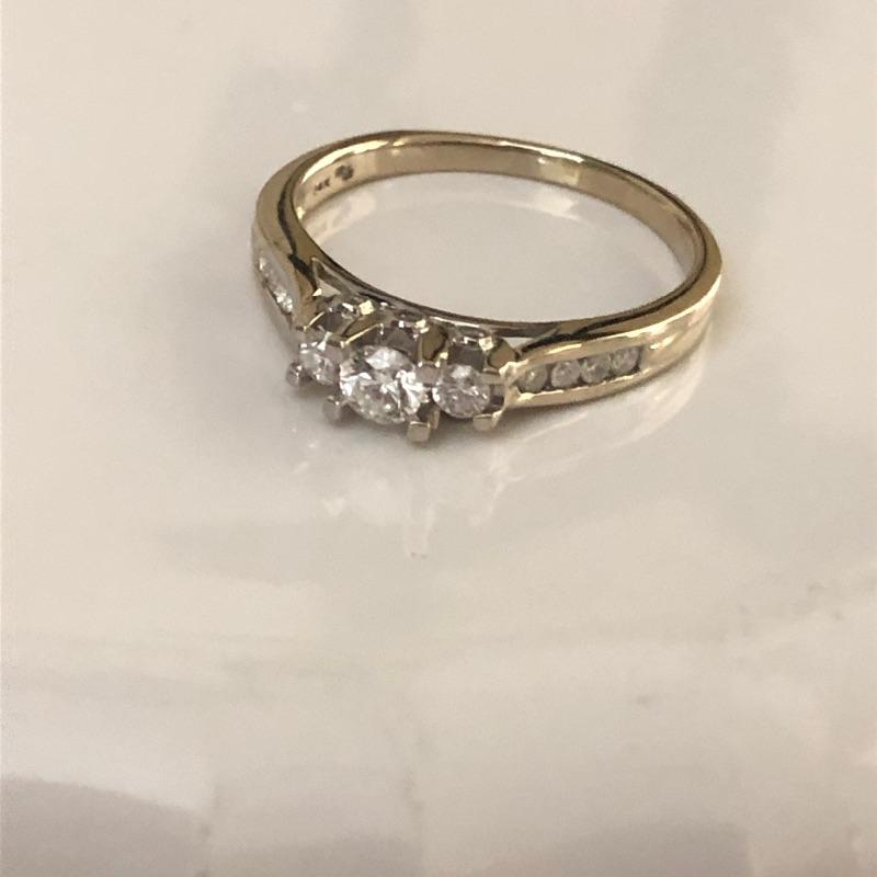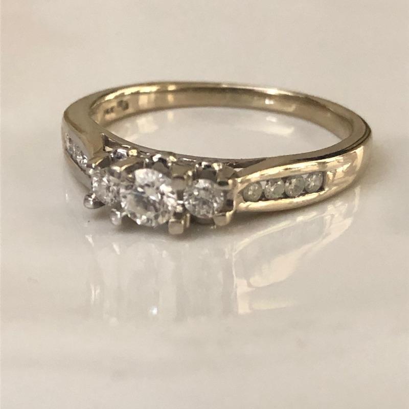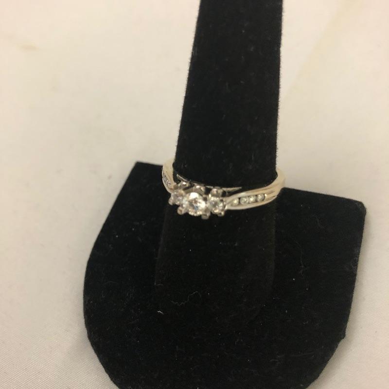 This is such a pretty ring, set in a 14K band, three simulant diamond stones are flanked by 4 smaller stones on either side provide a nice bit of bling. See images for marks and size.