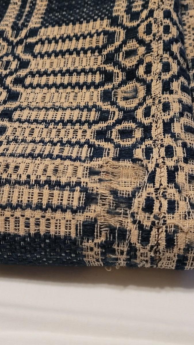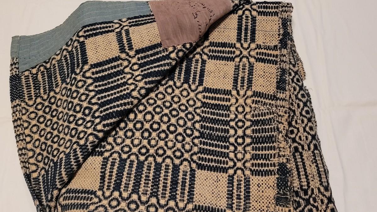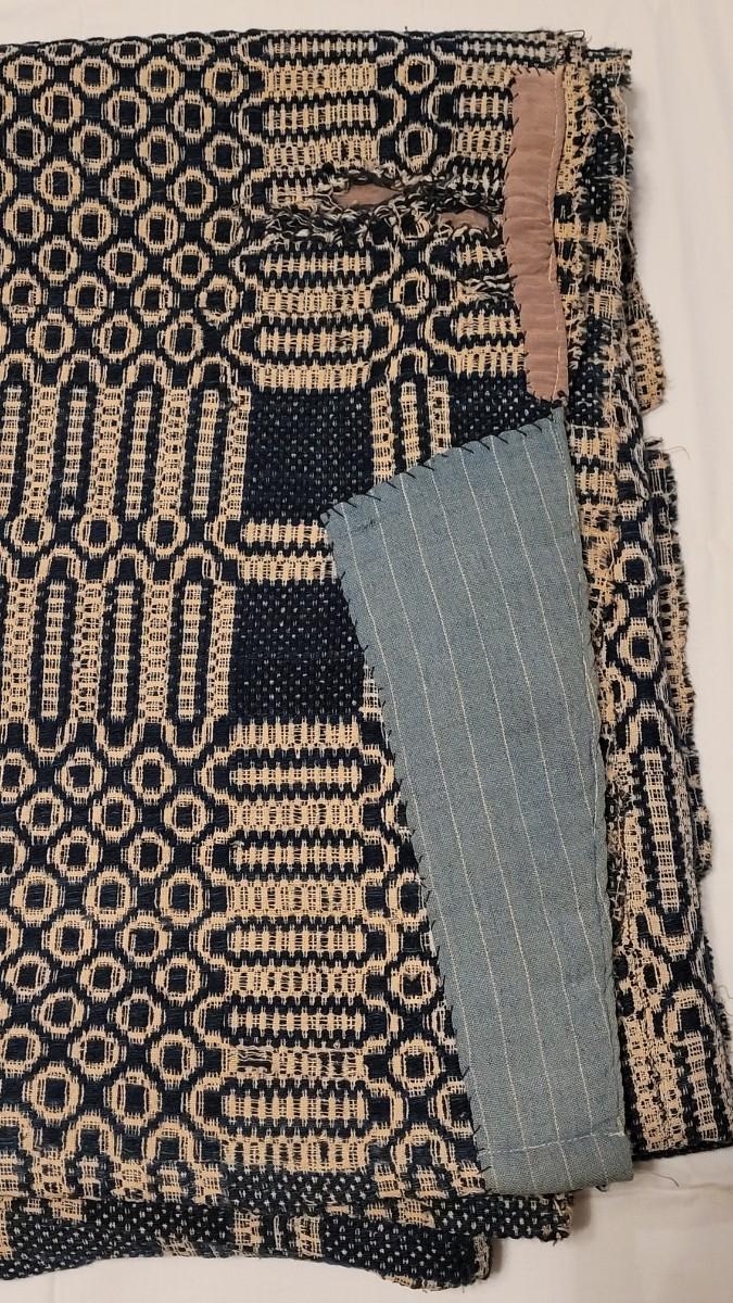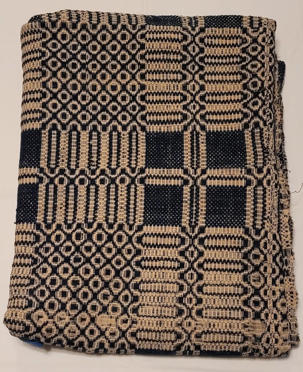 Lot 140: Antique 19th Century Dark Blue and Aged White Jacquard Coverlet