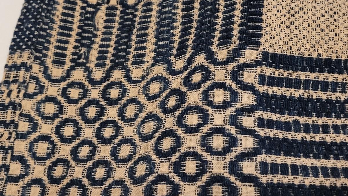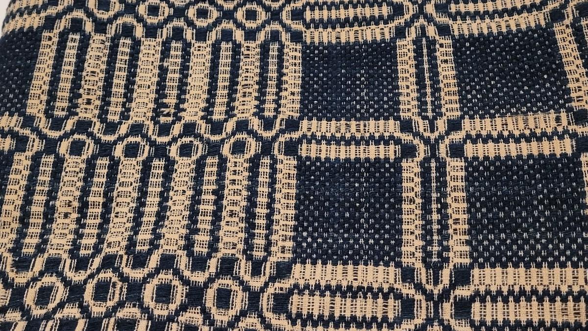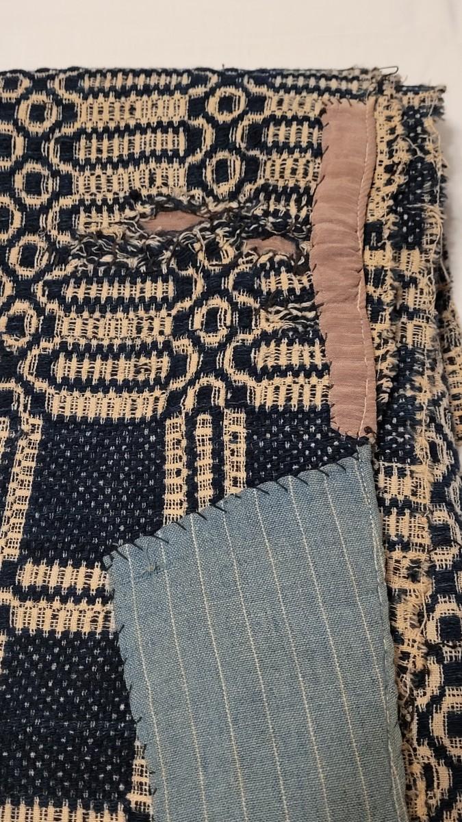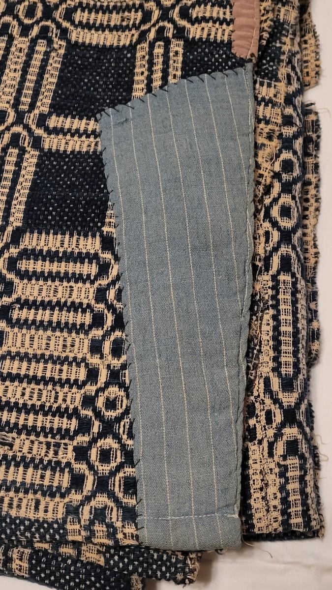Lot 140: Antique 19th Century Dark Blue and Aged White Jacquard Coverlet