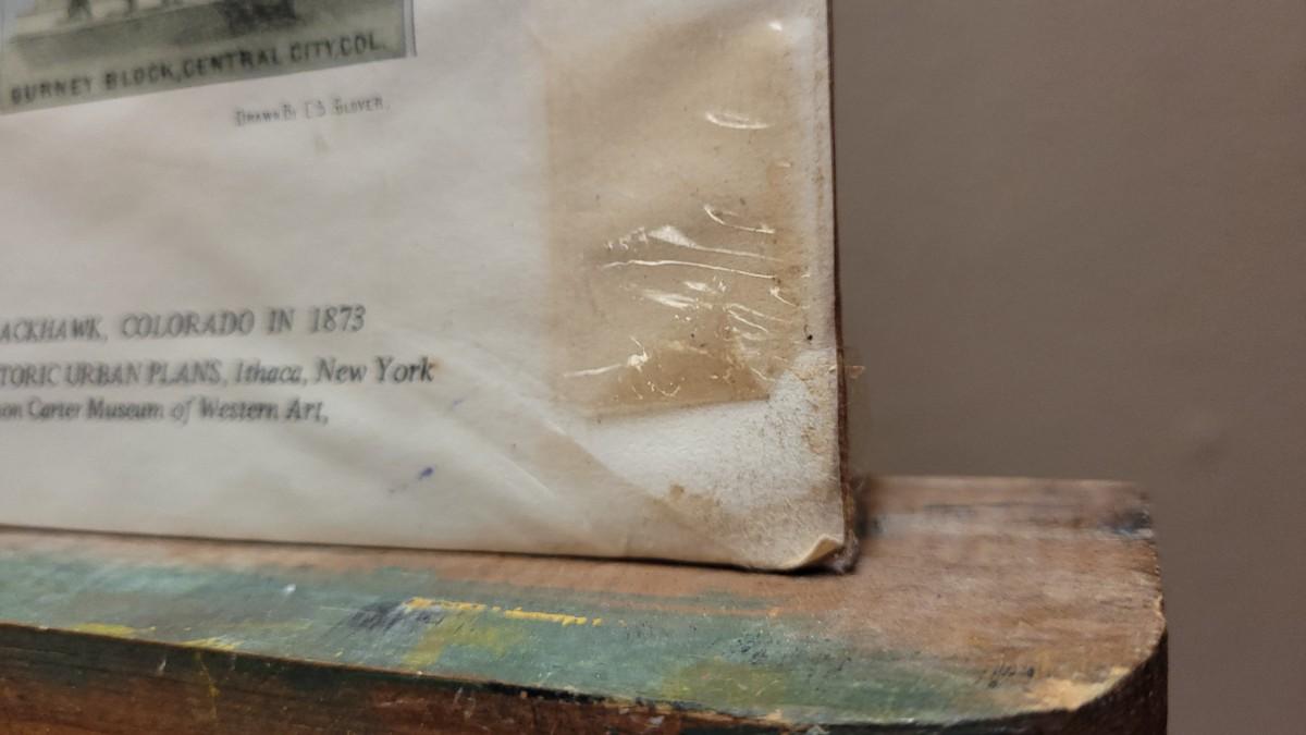 This Vintage poster depicts a reproduction of a Lithograph in the archives of the Amon Carter Museum of Western Art which artistically details the state of affairs in the year 1873 in the towns of Blackhawk and Central City Colorado. Loads of reference information and building samples such as GURNEY BLOCK and the ROWORTH & CO. Store. The poster retains a protective plastic wrap and is currently being backed by a piece of cardboard. The blue spots shown towards the top appear to be on the poster as a sign of age. Easily could be framed and mounted professionally to showcase properly. 20.5" x 17.5".