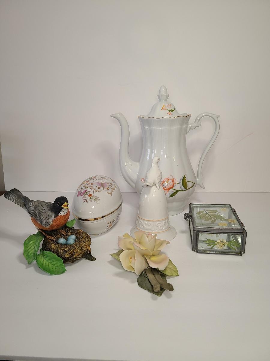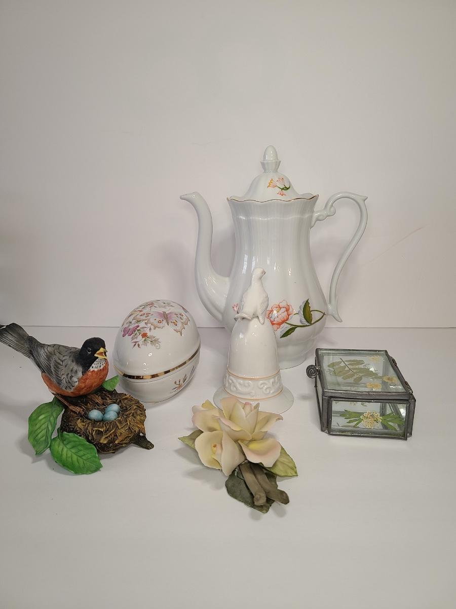 Lovely lot of collectibles. The teapot has a small chip in rim. Please see all pictures as they are the best representation of the items. The pictures show condition, measurements if taken, and what is included in the lot. Due to the large amount that we photograph and the time frame, we are not always able to take measurements. All items unless noted, are pre-owned and have been used. If you purchased furniture, you must bring help. We do not allow one person to carry large furniture out on their own. Bring help, tools and a truck for the safety of our client’s homes, and your personal safety. Any damages that result to the property including walls, and floors due to moving of the furniture will be charged to the buyer. Company policy. Thank you.