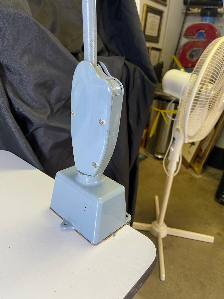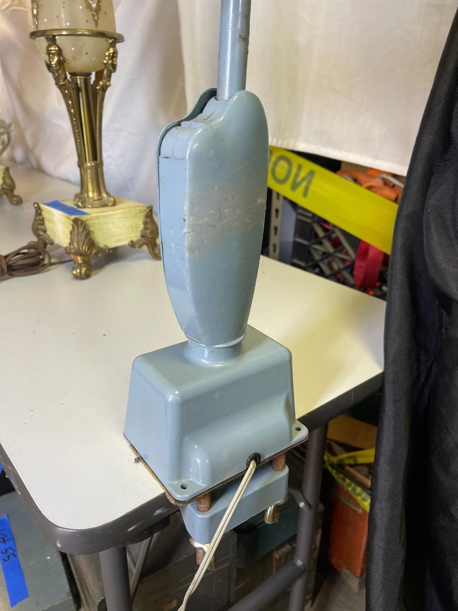 Light blue metal, industrial, mid century, clamp-on lamp.