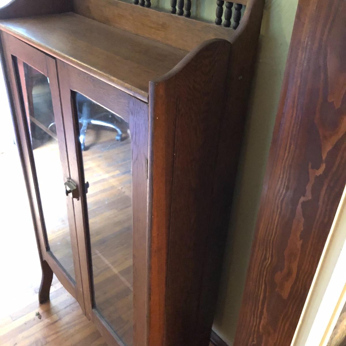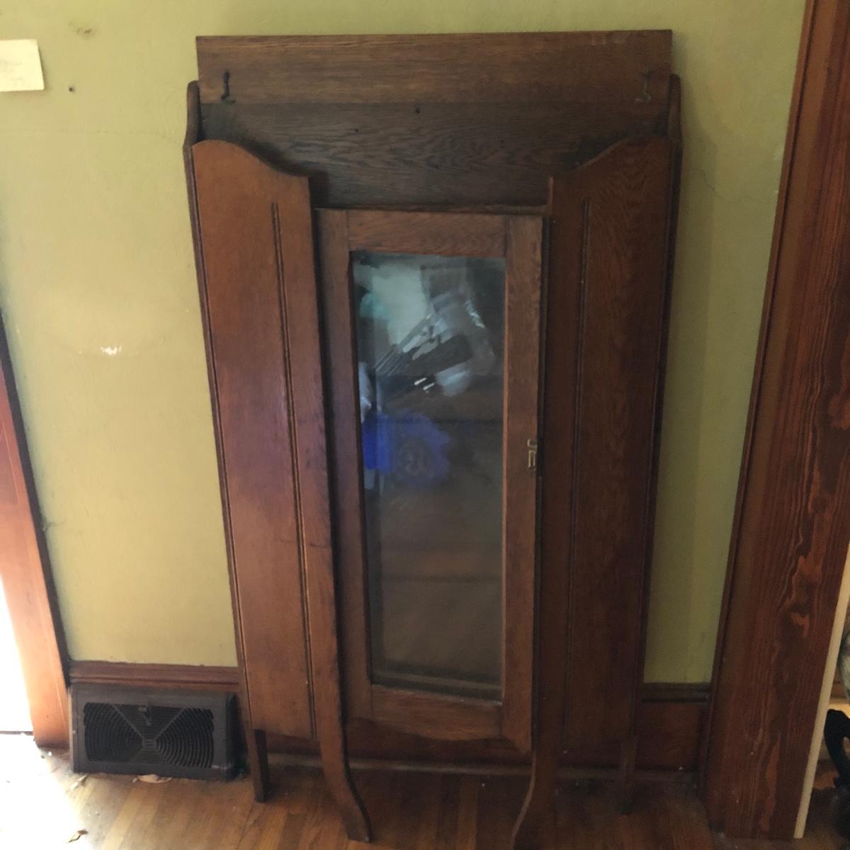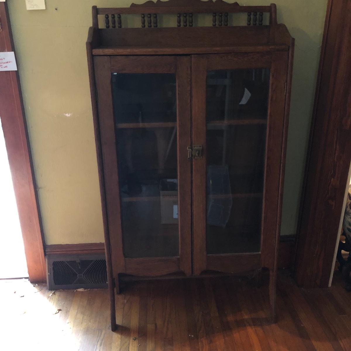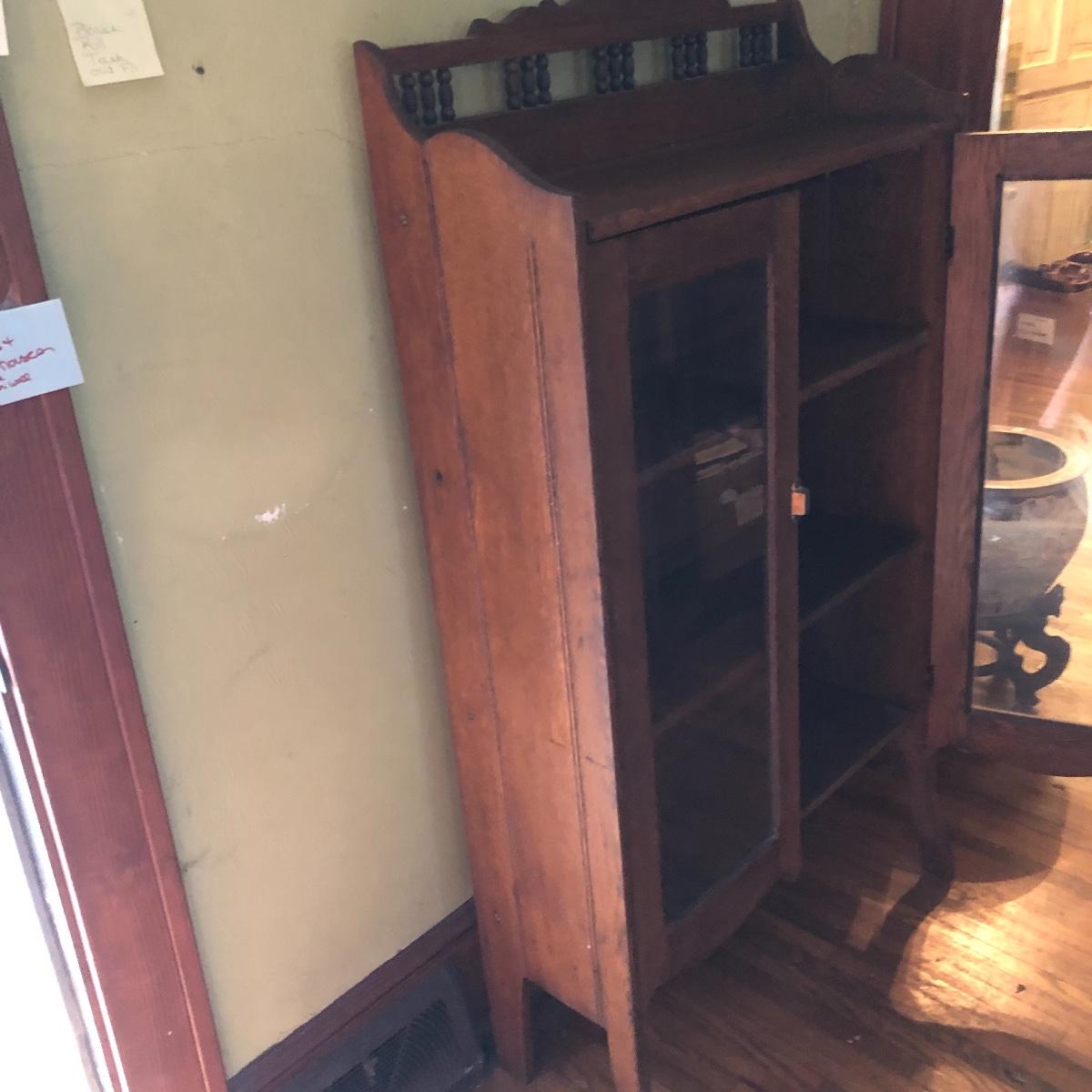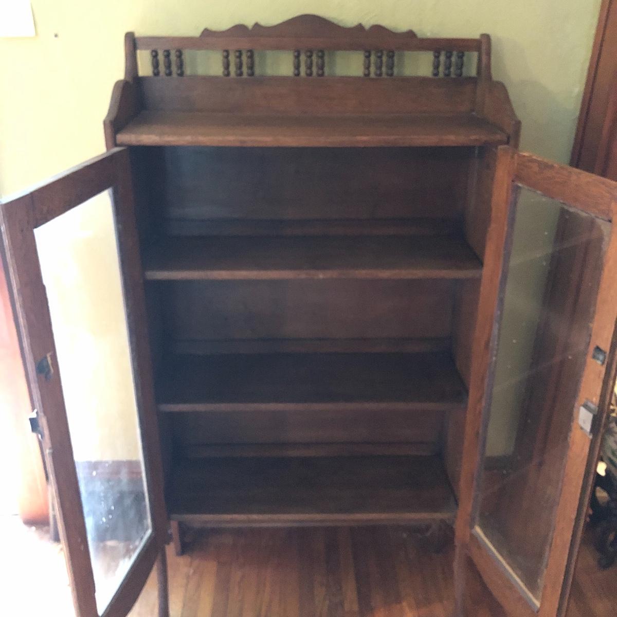 This is a beautiful antique wooden bookcase with glass front. It actually has latch ads and hinges that function to collapse the unit into itself for storage or transport. Bookcase has three shelves inside and one on top with with wooden doors with glass inserts. Bookcase measures 11” x 30” x 55” when open and 6” x 30” x 56” when collapsed.
