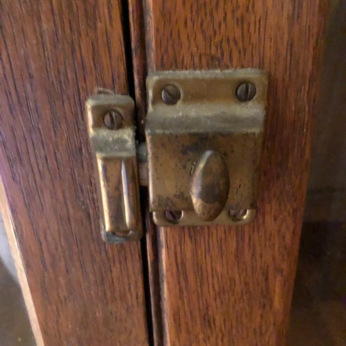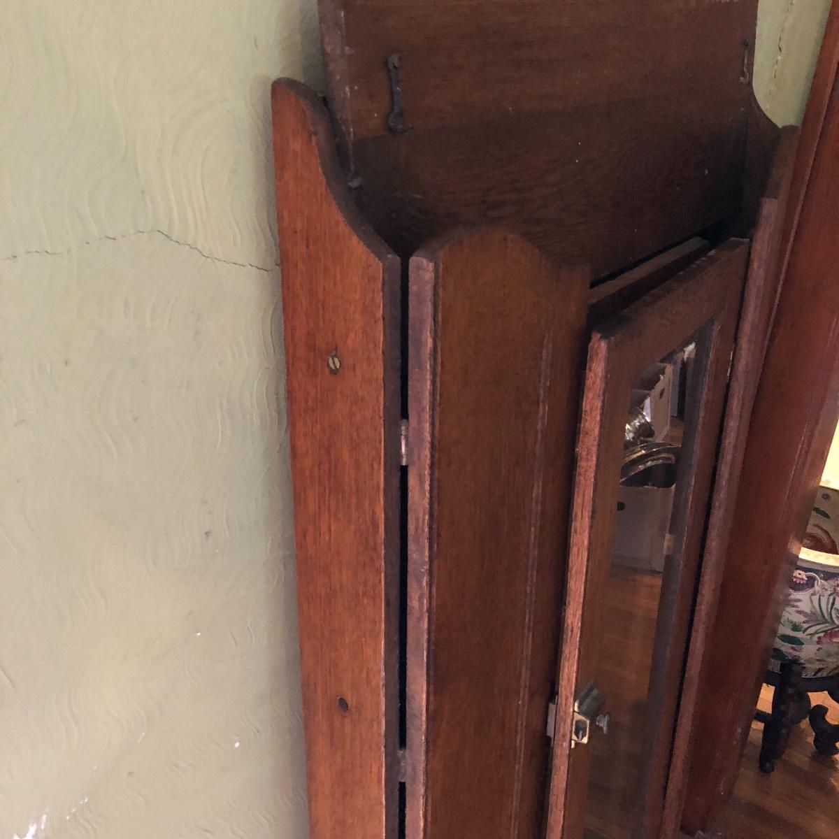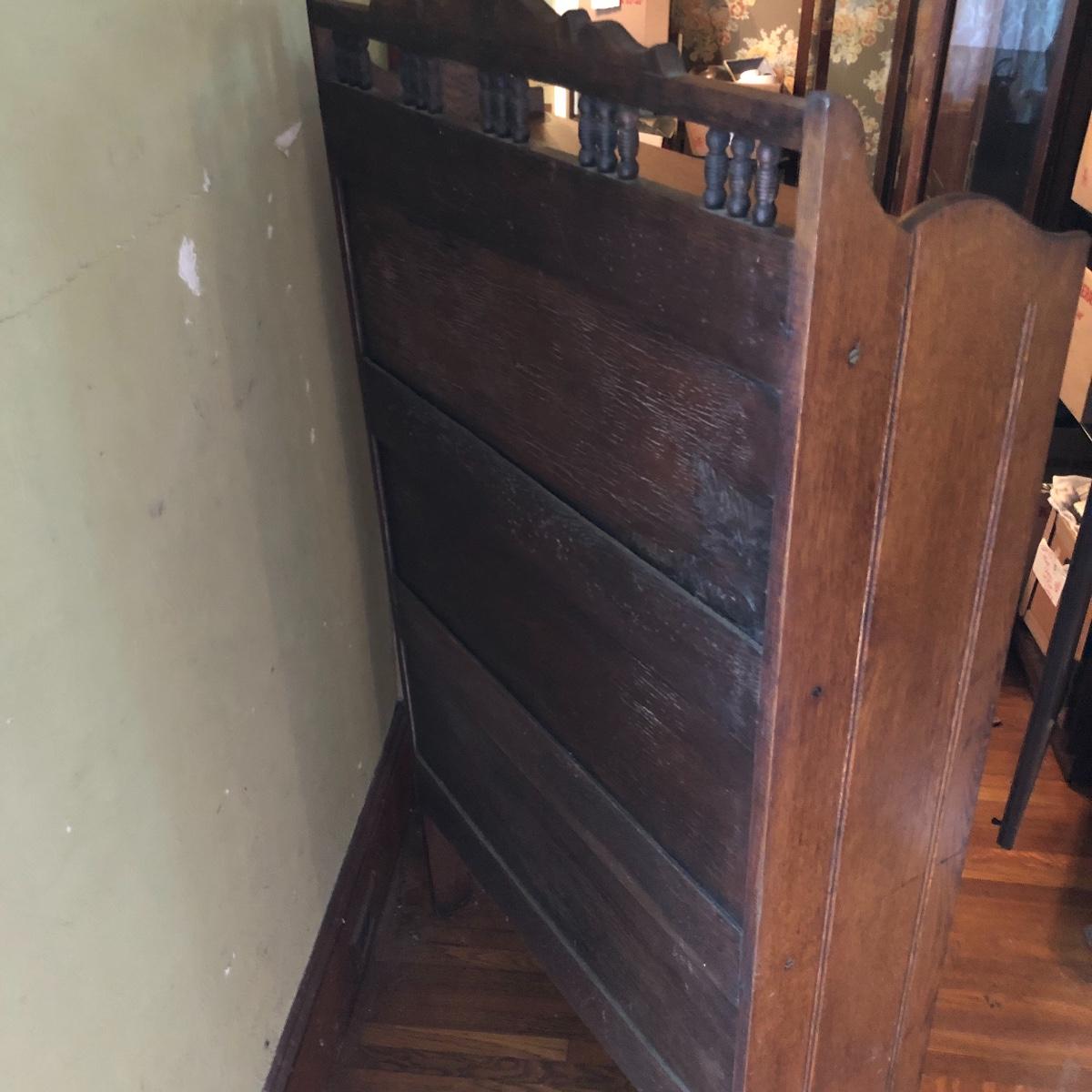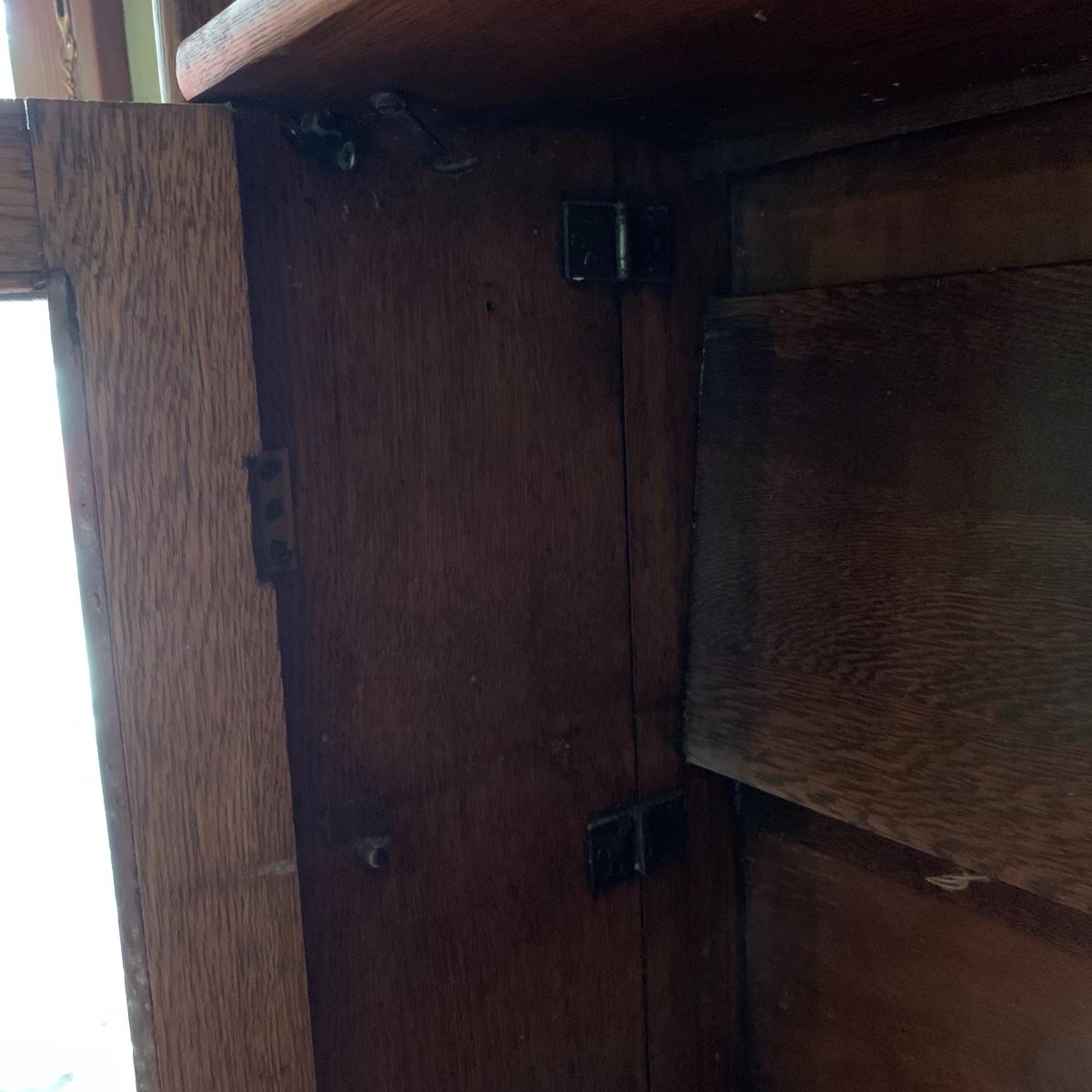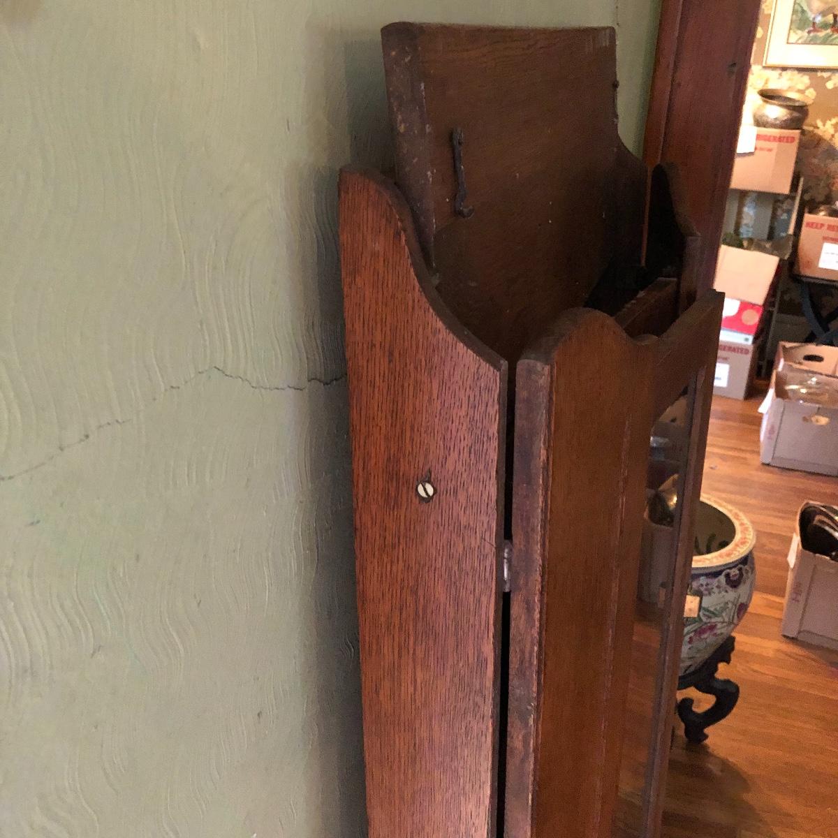 This is a beautiful antique wooden bookcase with glass front. It actually has latch ads and hinges that function to collapse the unit into itself for storage or transport. Bookcase has three shelves inside and one on top with with wooden doors with glass inserts. Bookcase measures 11” x 30” x 55” when open and 6” x 30” x 56” when collapsed.