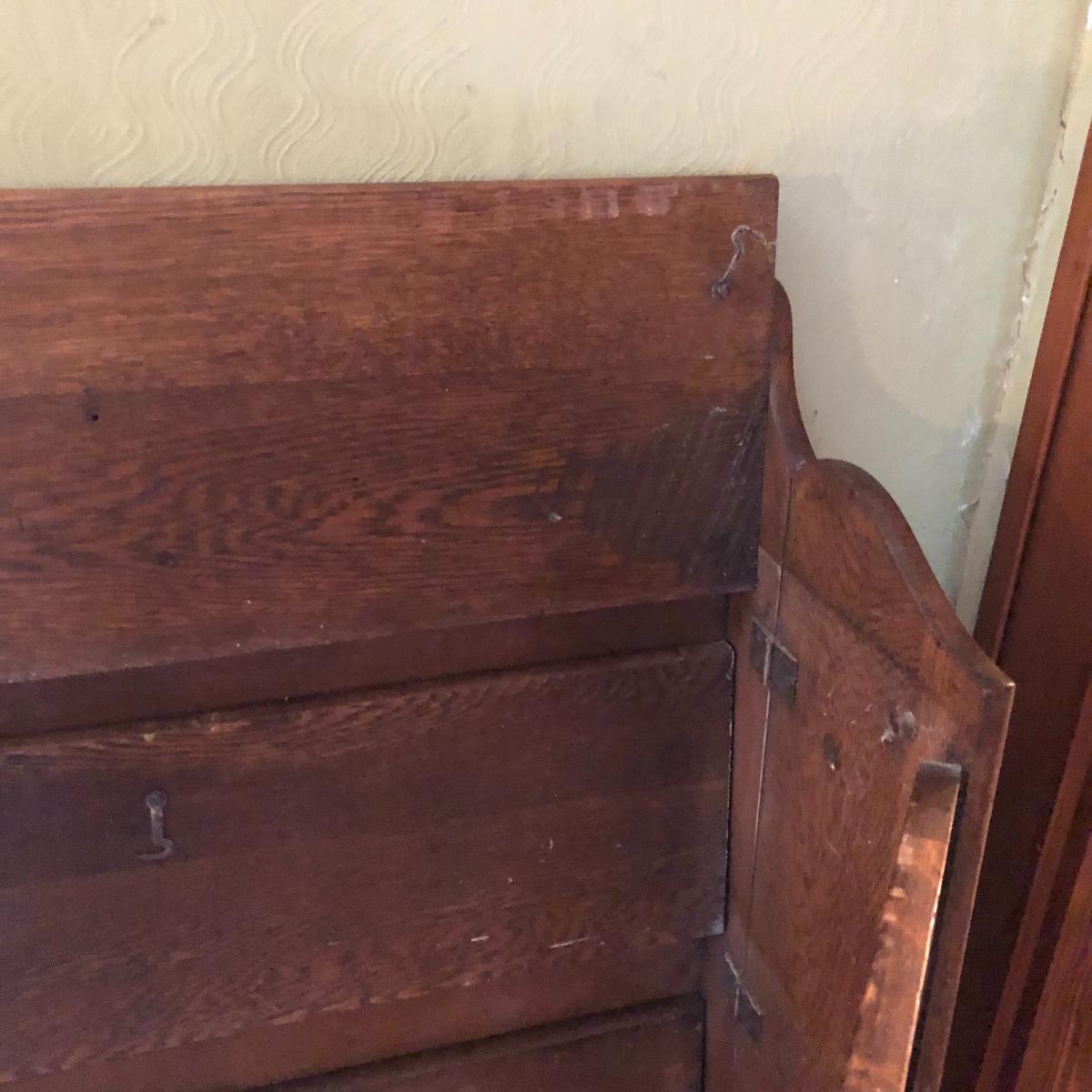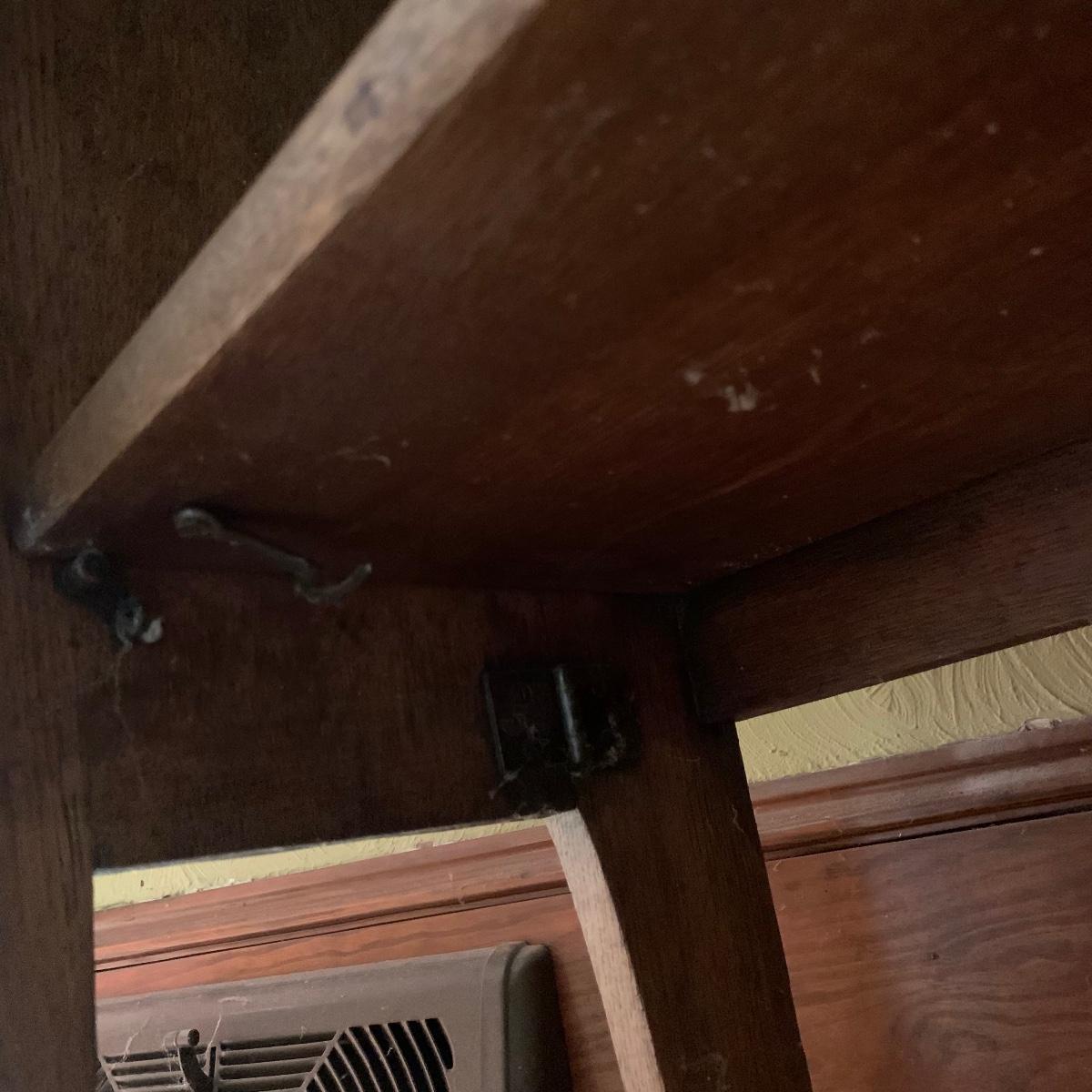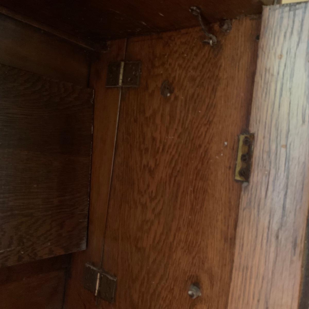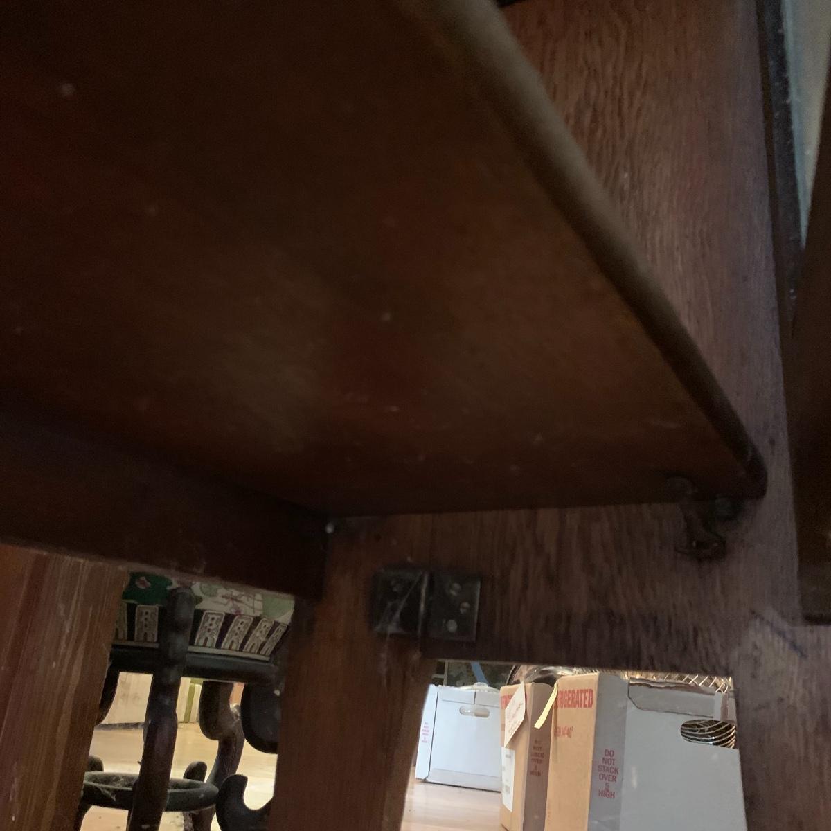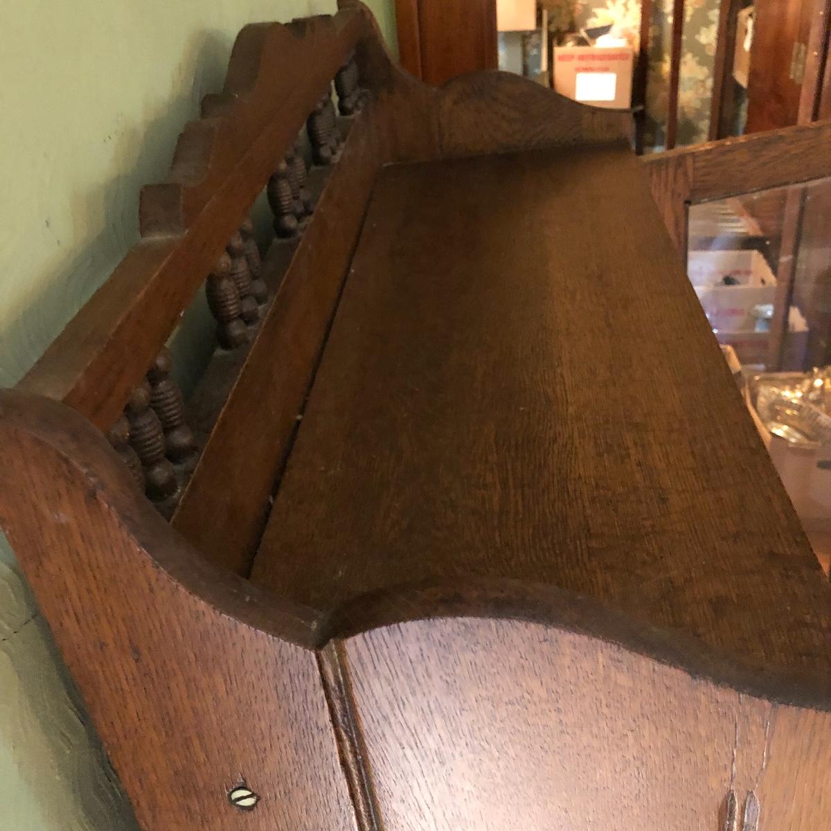 This is a beautiful antique wooden bookcase with glass front. It actually has latch ads and hinges that function to collapse the unit into itself for storage or transport. Bookcase has three shelves inside and one on top with with wooden doors with glass inserts. Bookcase measures 11” x 30” x 55” when open and 6” x 30” x 56” when collapsed.