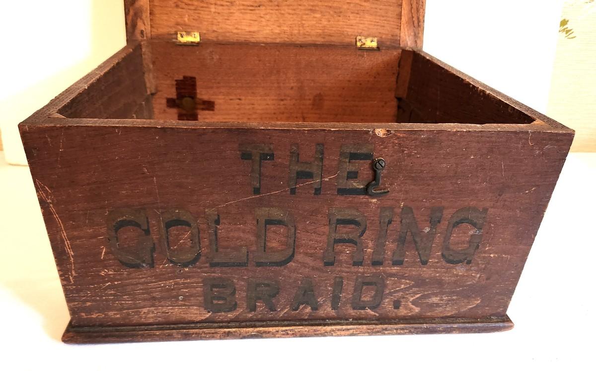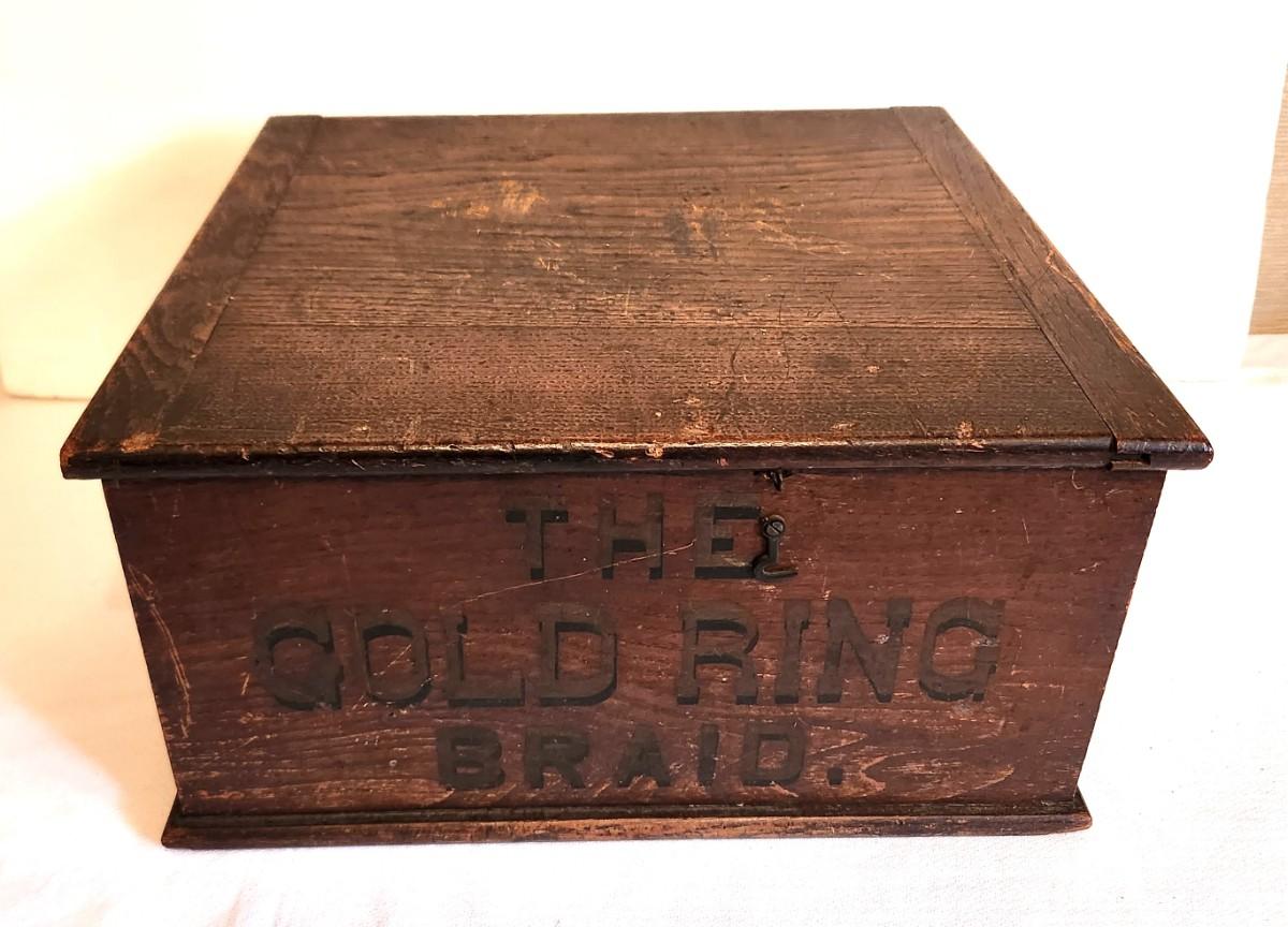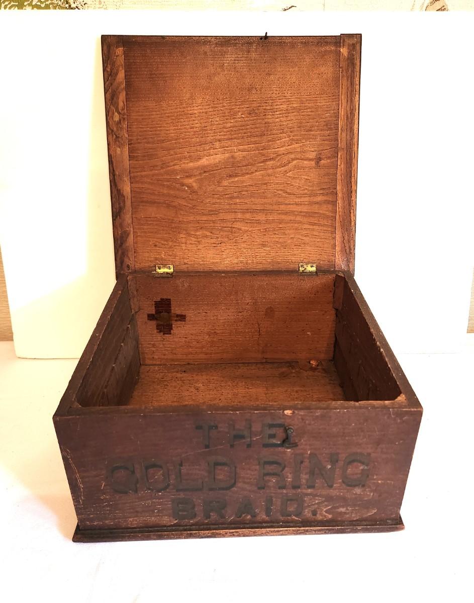 Antique (turn of the century) Gold Ring brand wooden box store display - 14" x 13" x 7" - I believe this was a tobacco product. Good looking piece.