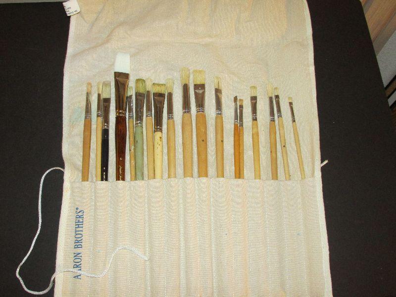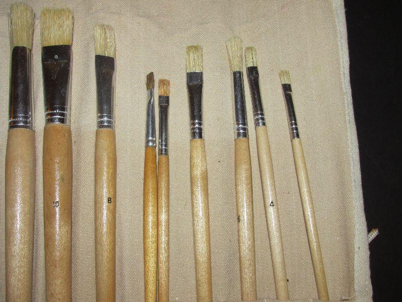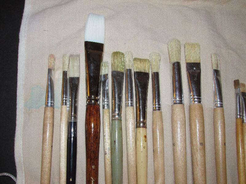 Collection of numerous used paintbrushes of different sizes in cloth wrap carrying case.