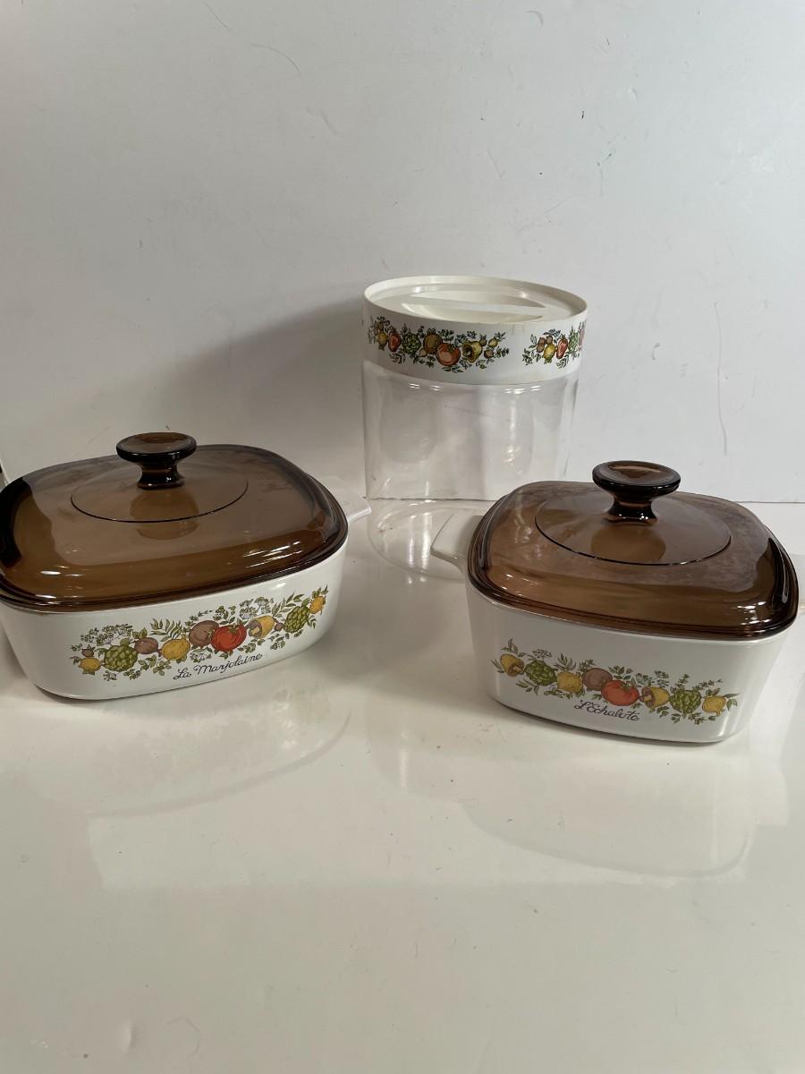Lot 140  Corning Ware with Lids.  Mushroom & Vegetable Pattern.