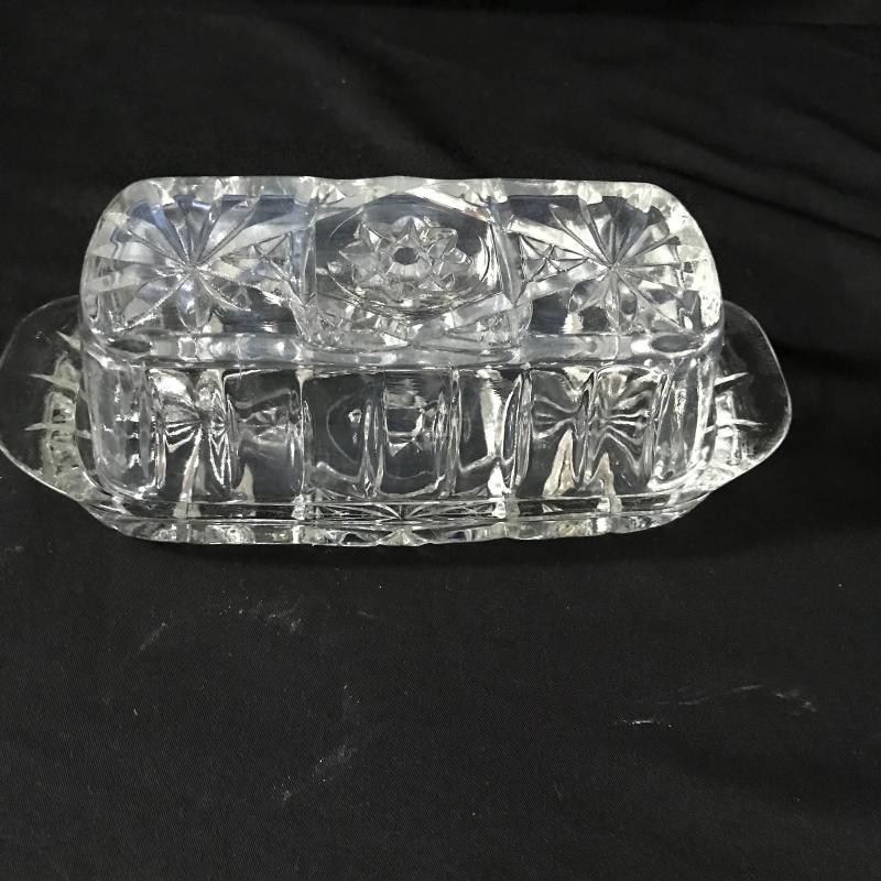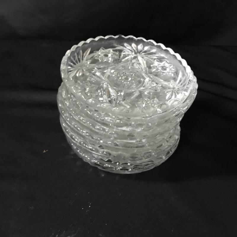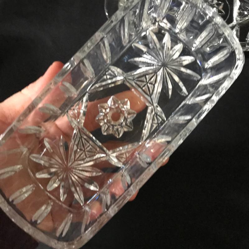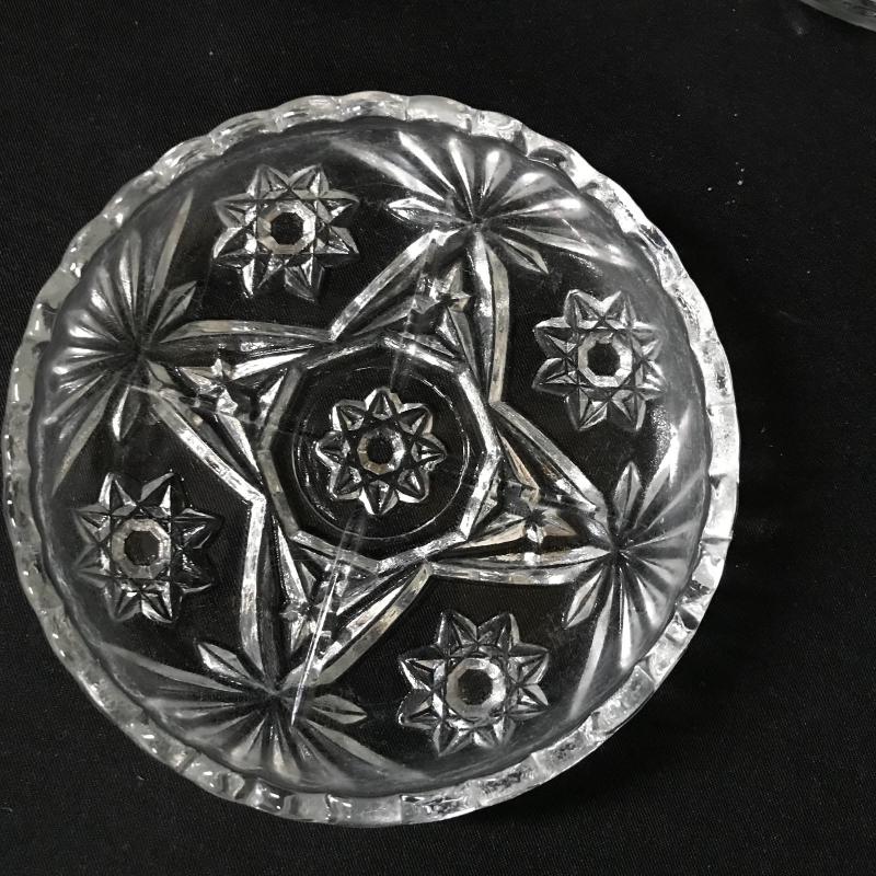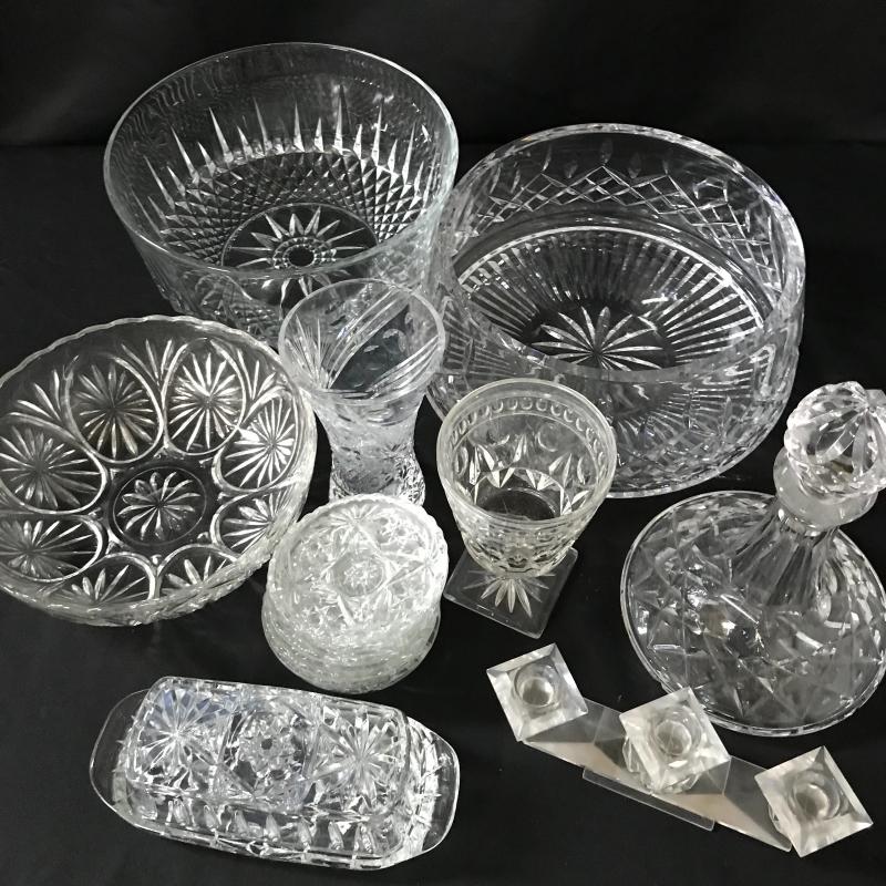 This assortment of crystal serving dishes includes three bowls, one small vase, one candy dish, one candle holder, a butter dish, a decanter, and six coasters.