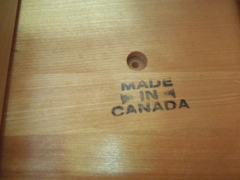 Very well constructed lightly varnished pine. Made in Canada. No scratches or gouges. Like new!