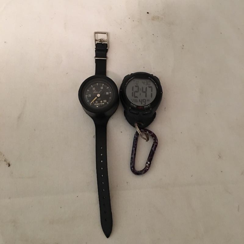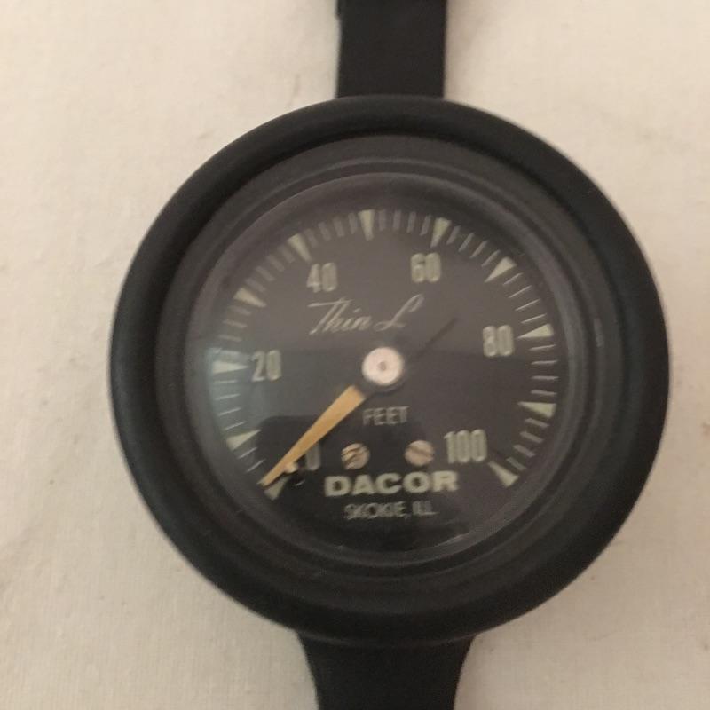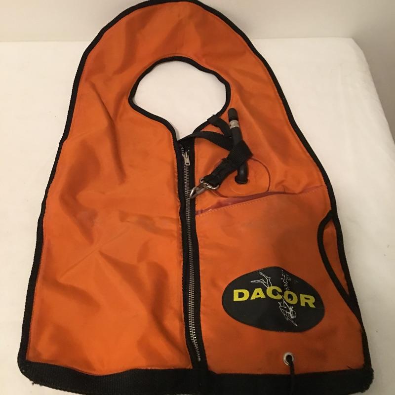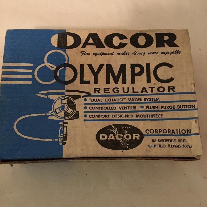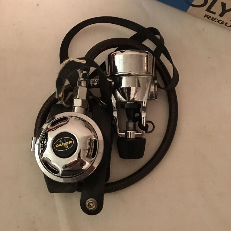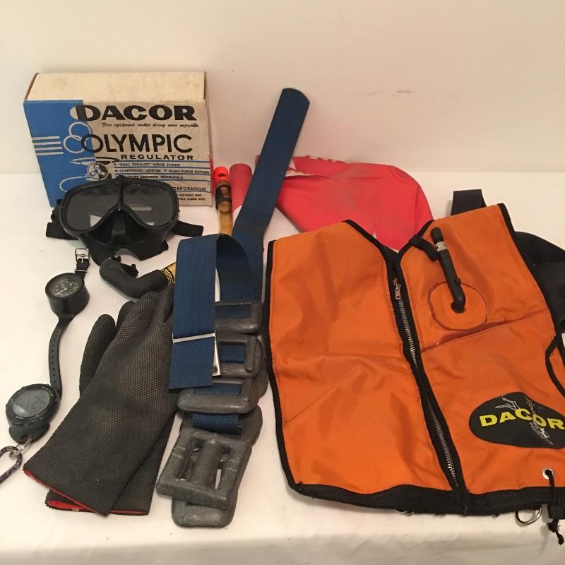 Diving lot includes Dacor 100’ depth gauge, Dacor Olympic regulator, Diver down buoy and flag,Dacor weight belt and more.