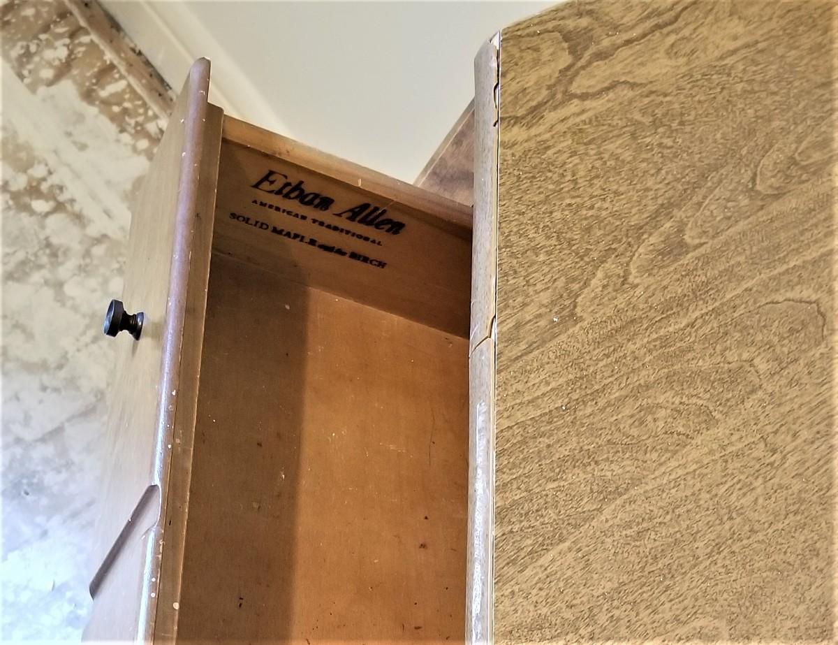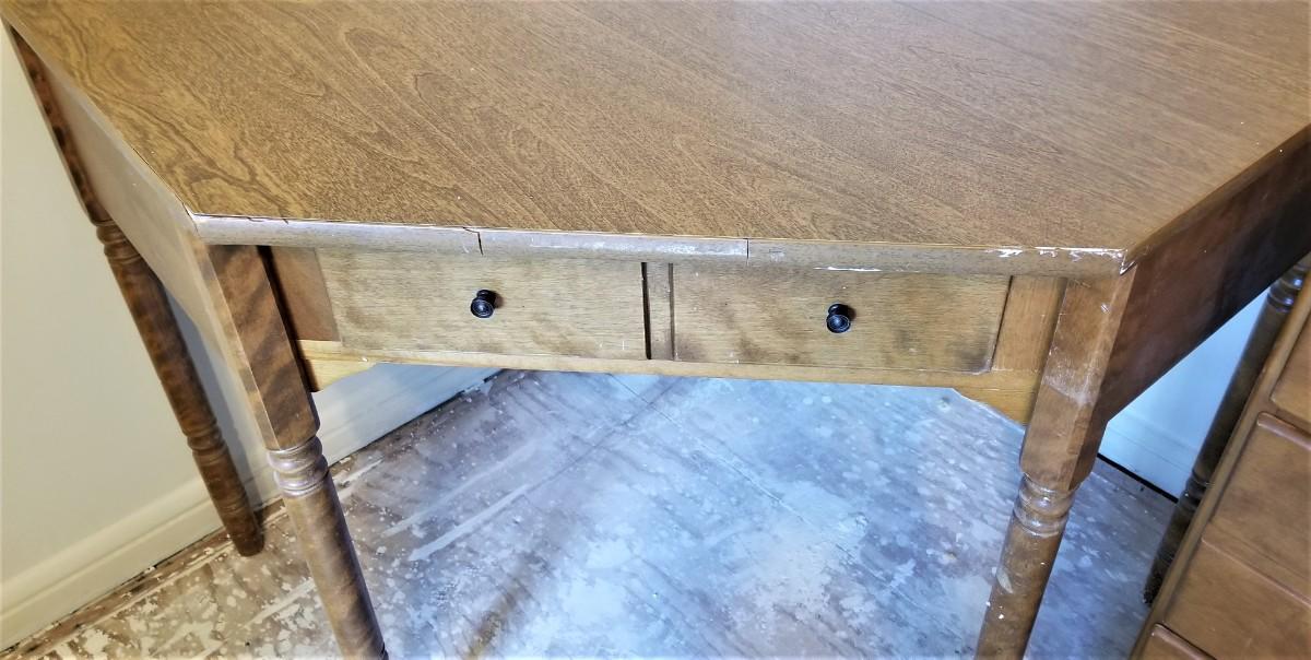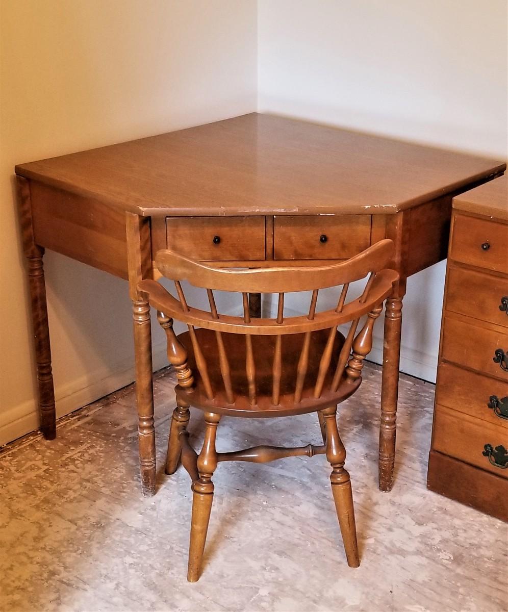 Early 1970's Ethan Allen maple/birch corner desk with drawer, matching chair. Solid wood. Used, has come wear. Good spot for a desktop computer - home schooling. 30.5" tall, Measures 48" across, 37" deep. Chair is in good condition and measures 29" tall. Some of the trim is loose/damaged. on the desk.