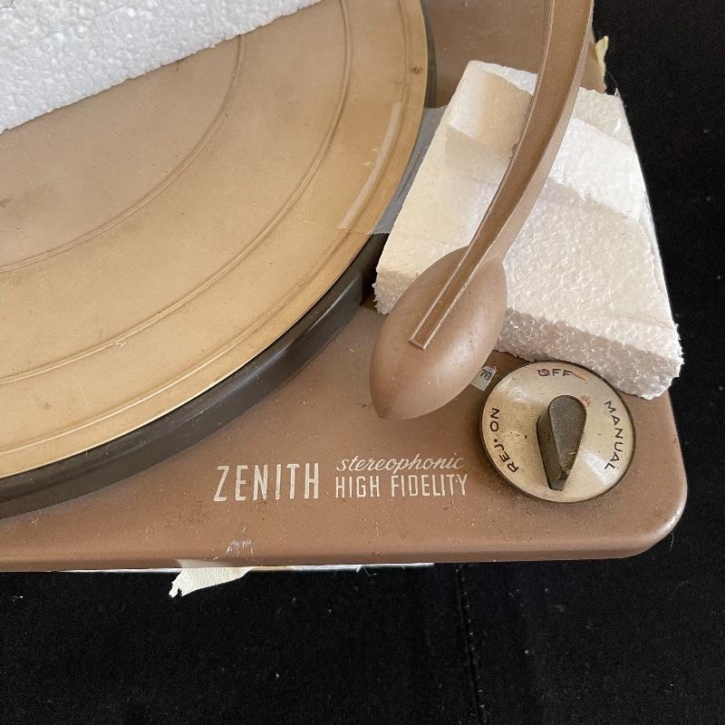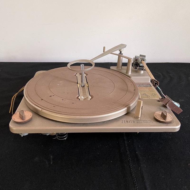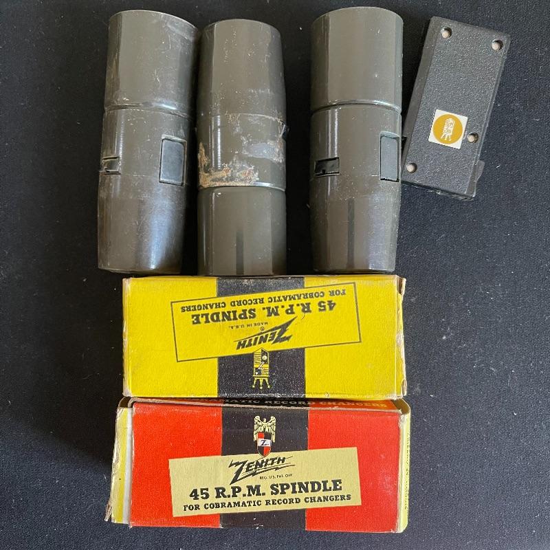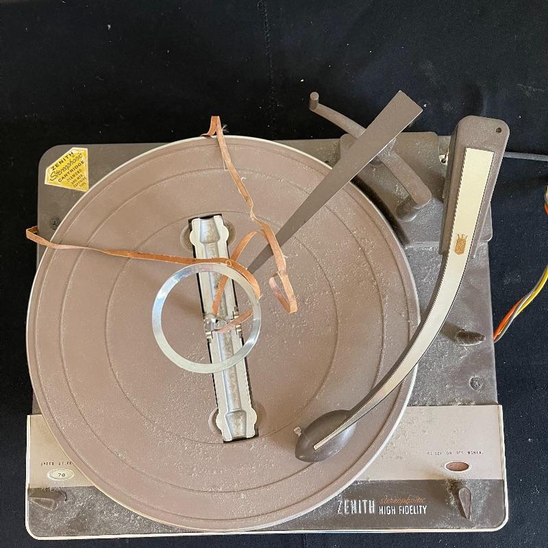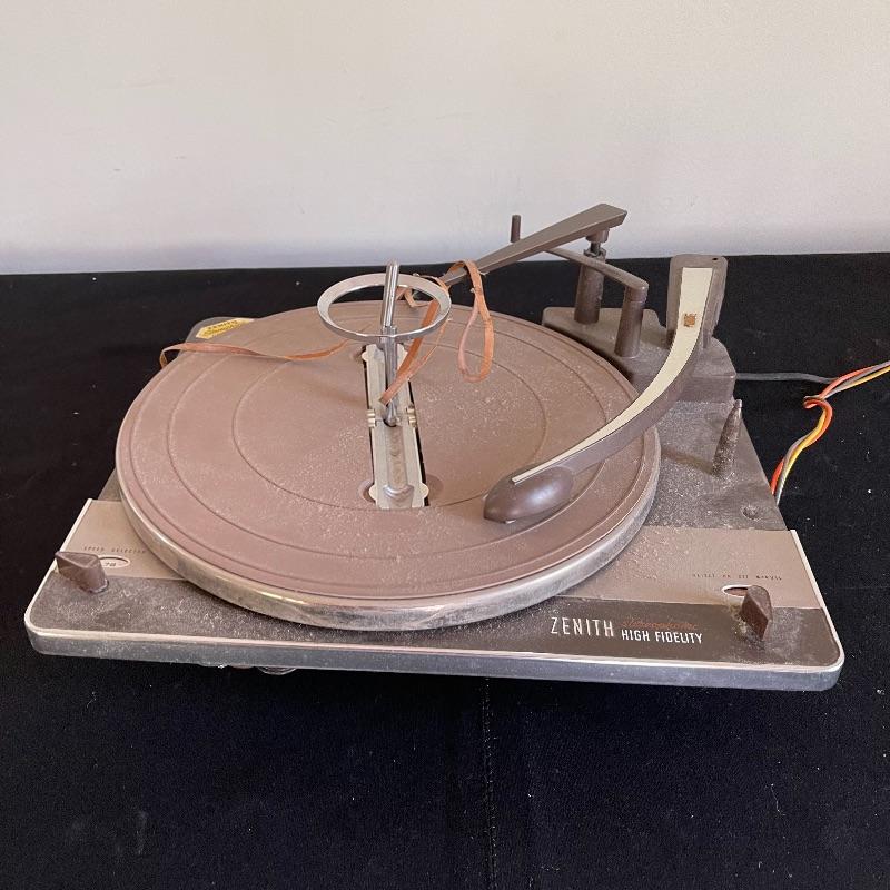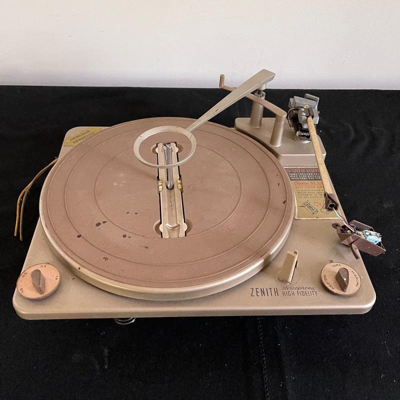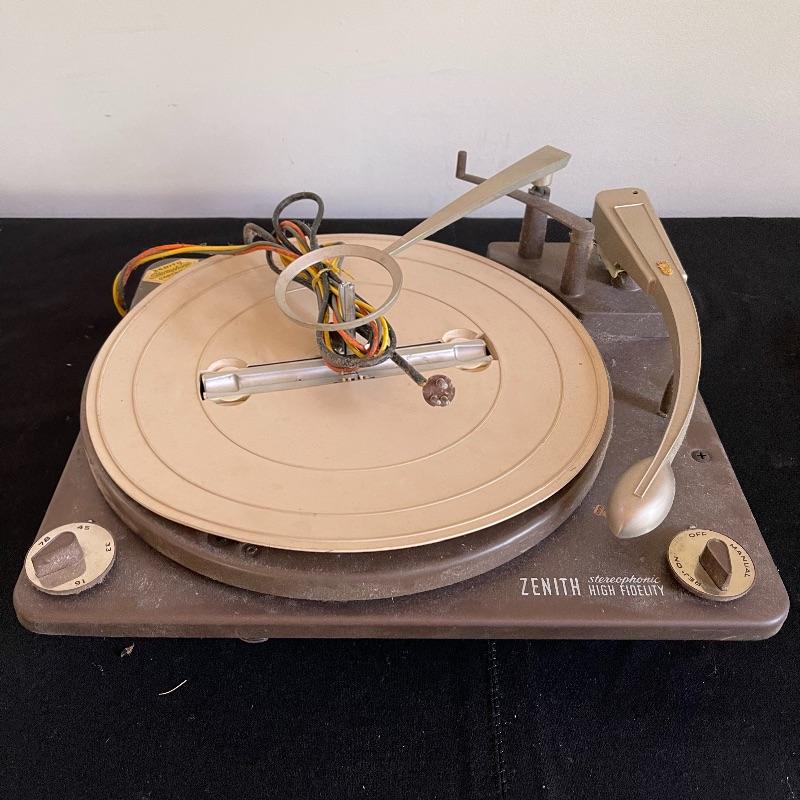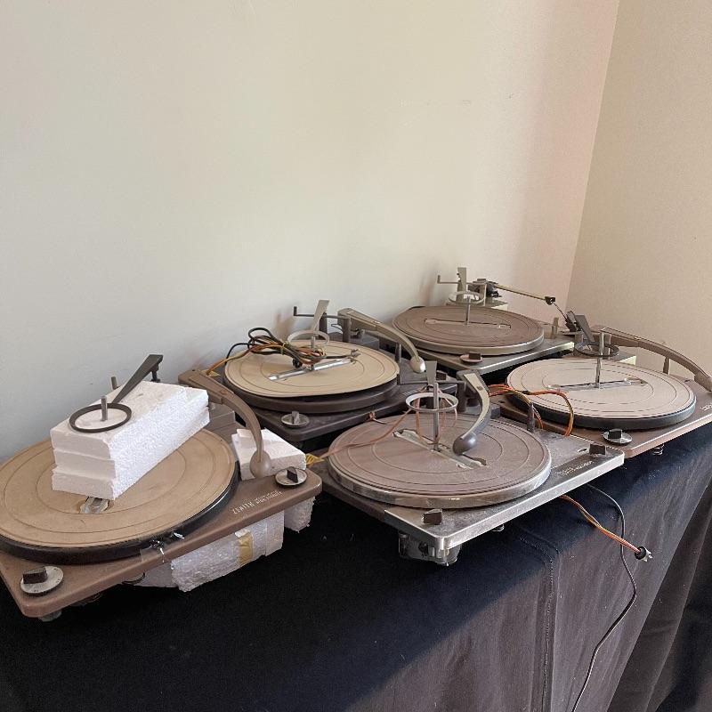 Five Zenith High Fidelity Stereophonic turntables. Turntables were not tested as they do not have plugs. Includes 45 spindles and a few spare parts. One has broken arm.