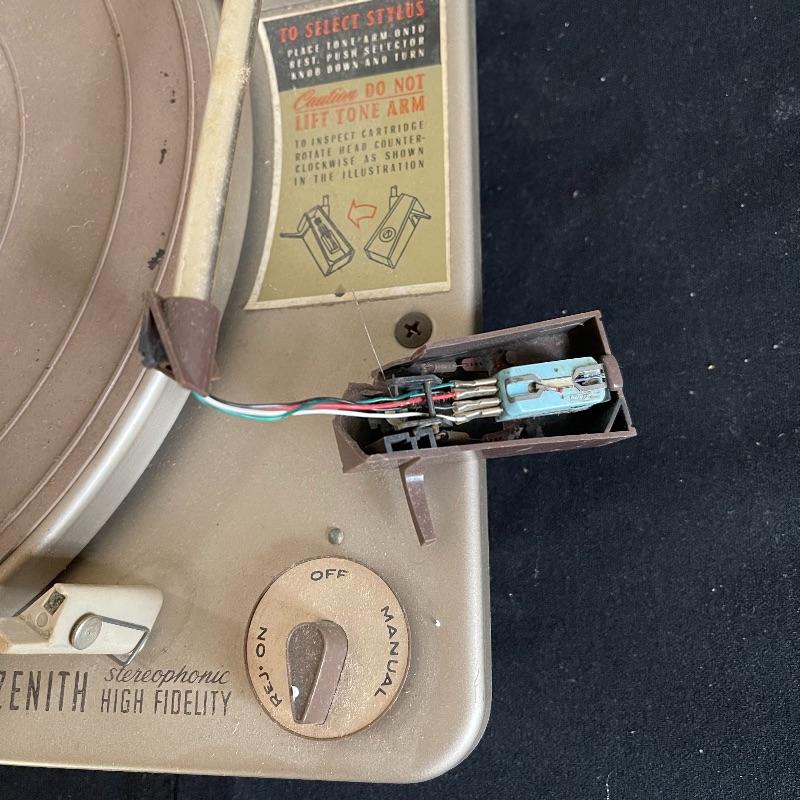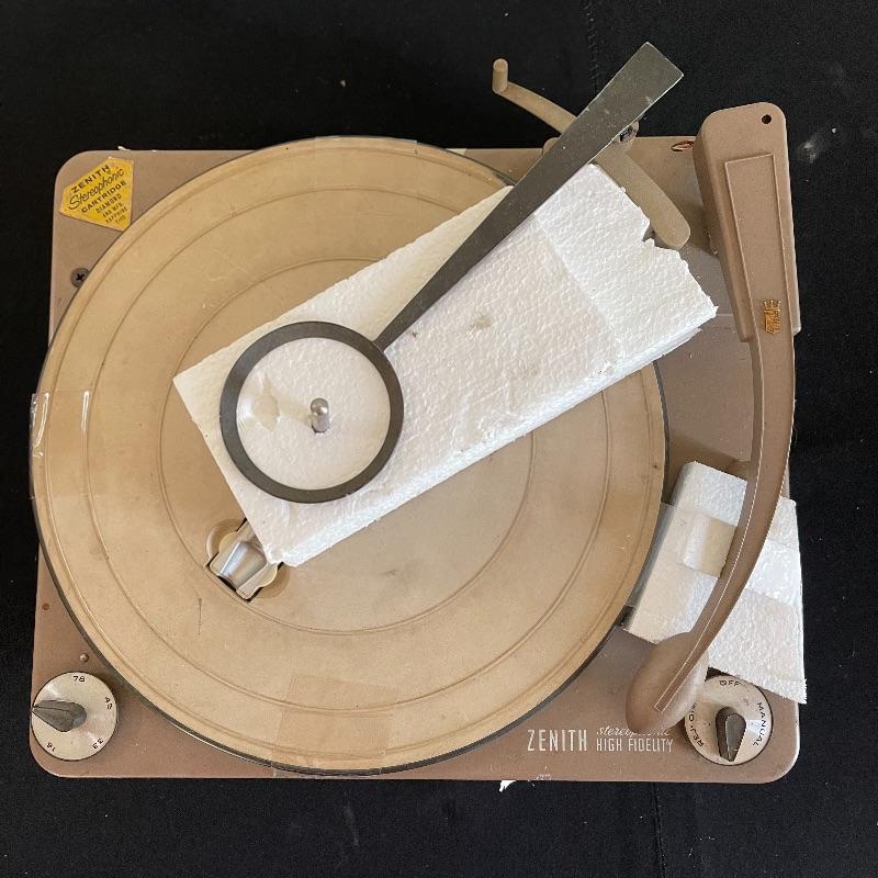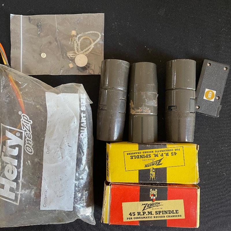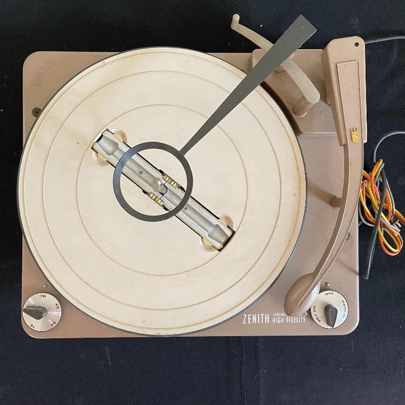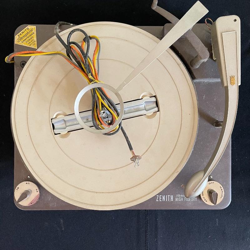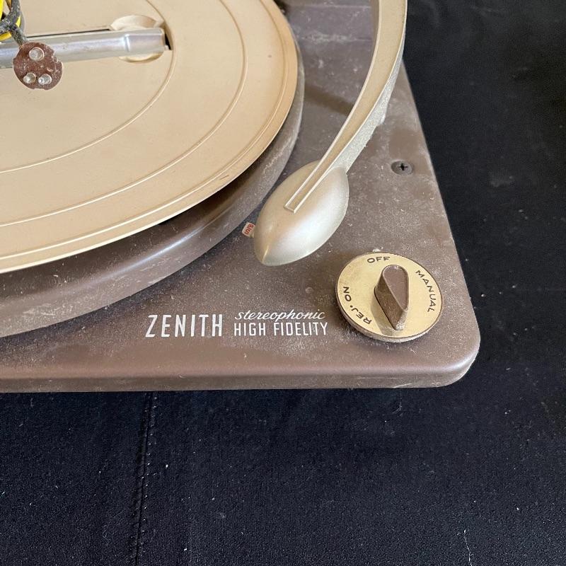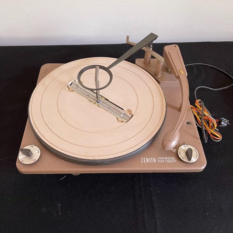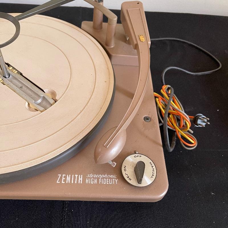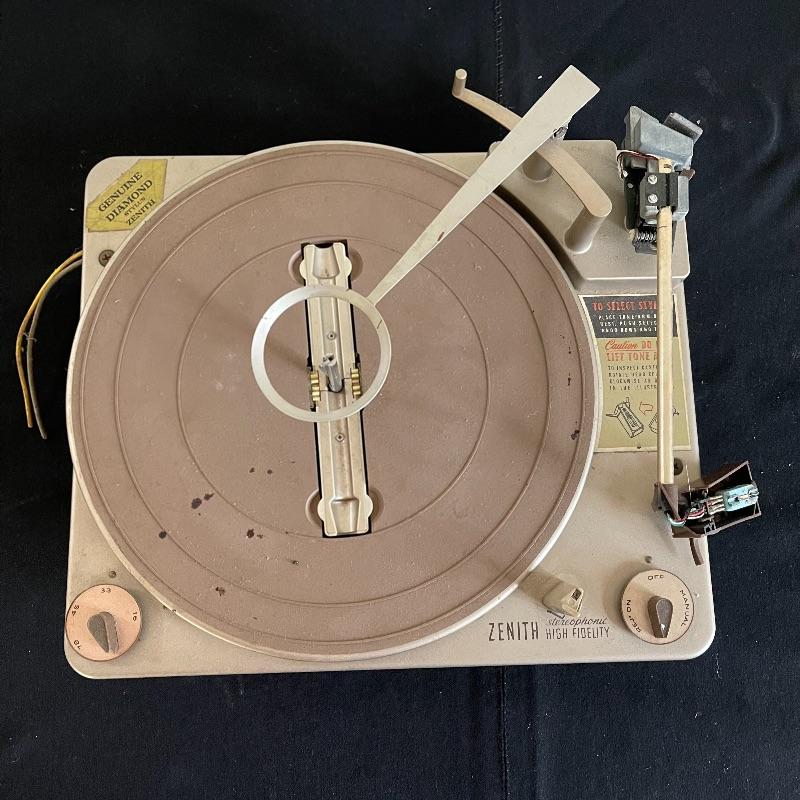 Five Zenith High Fidelity Stereophonic turntables. Turntables were not tested as they do not have plugs. Includes 45 spindles and a few spare parts. One has broken arm.