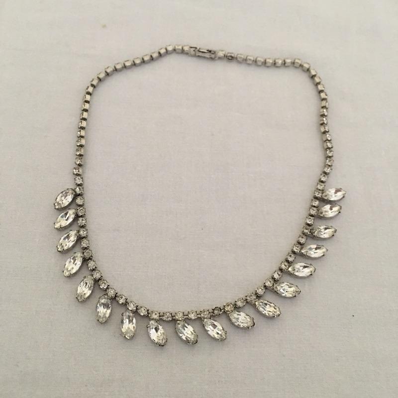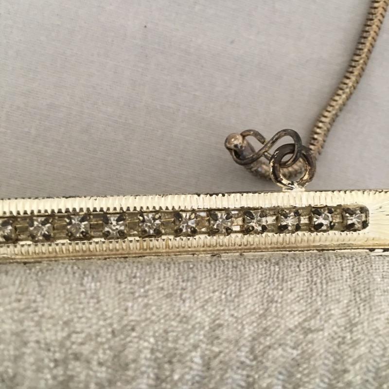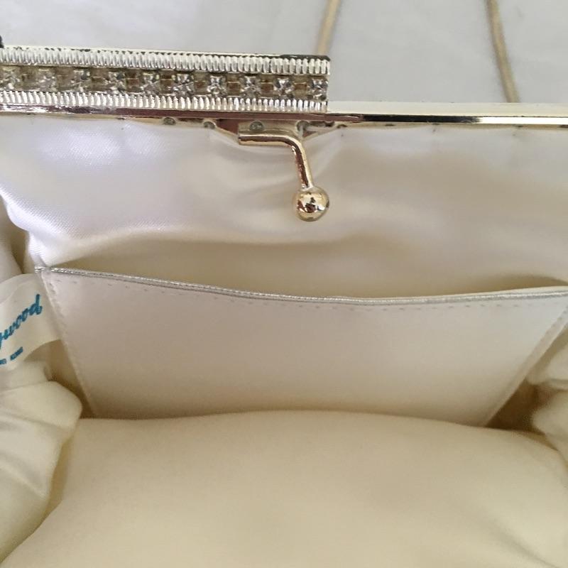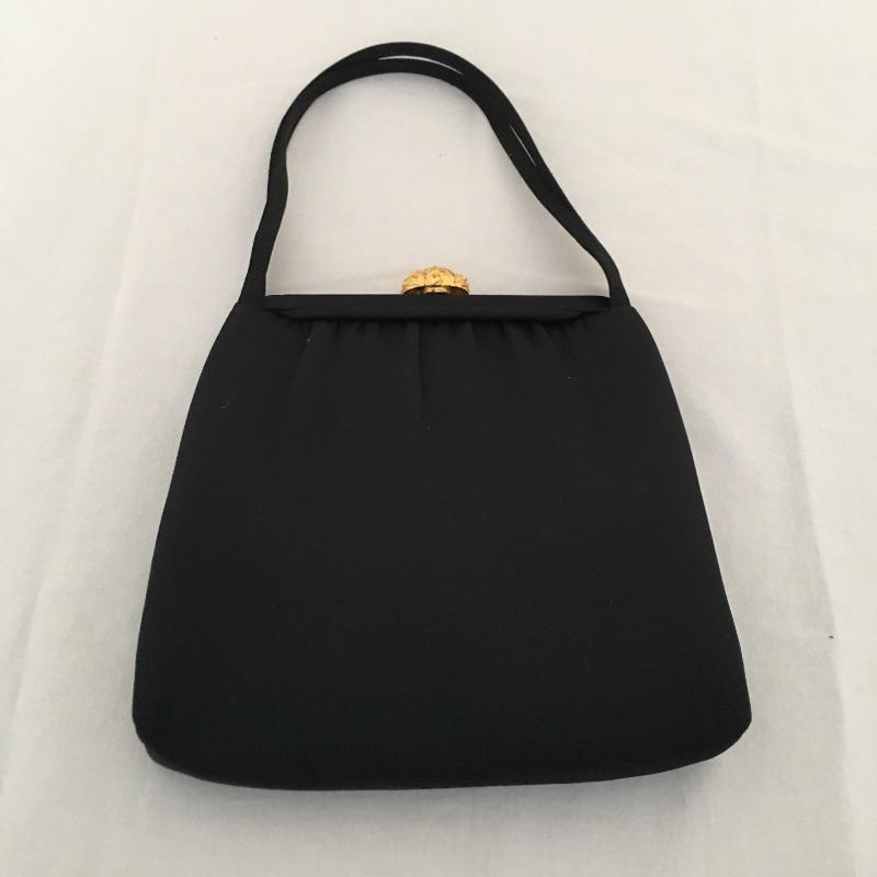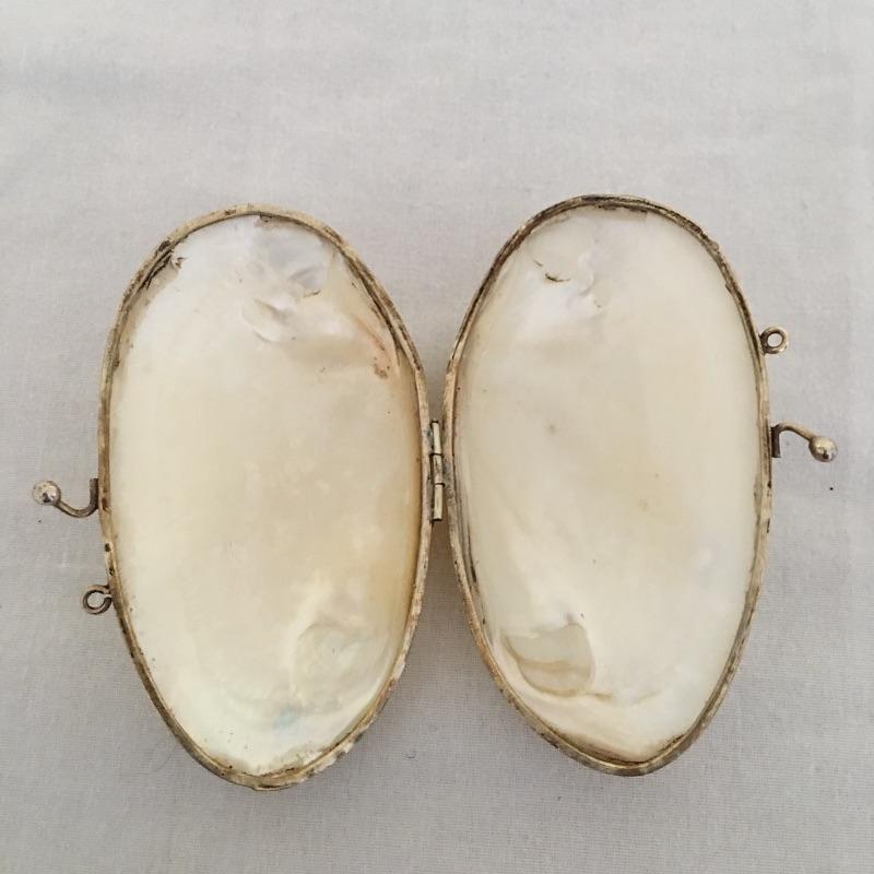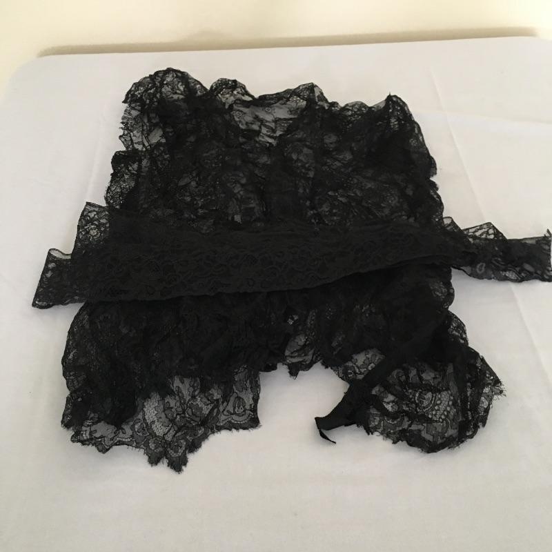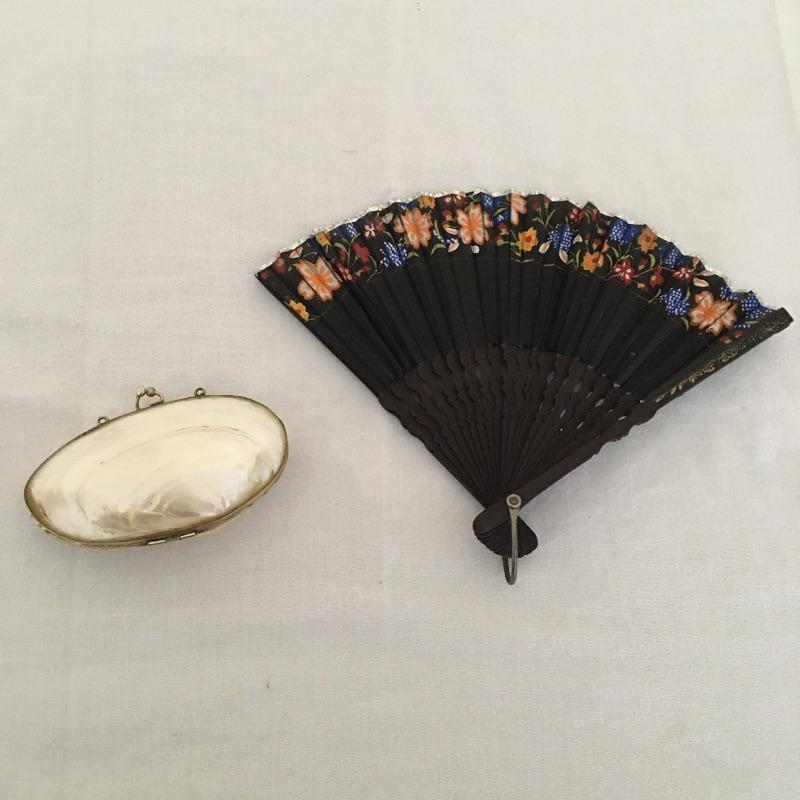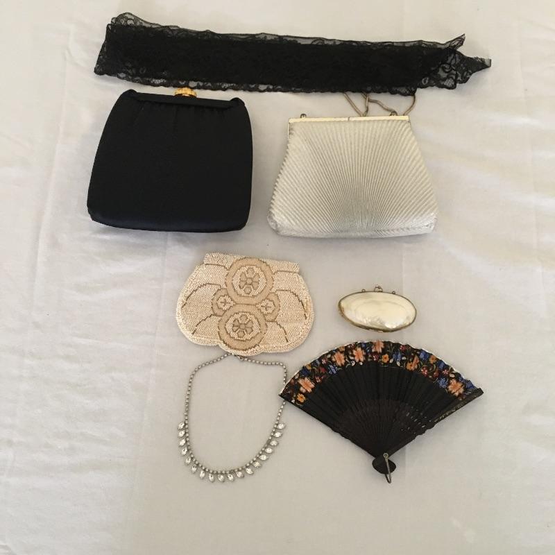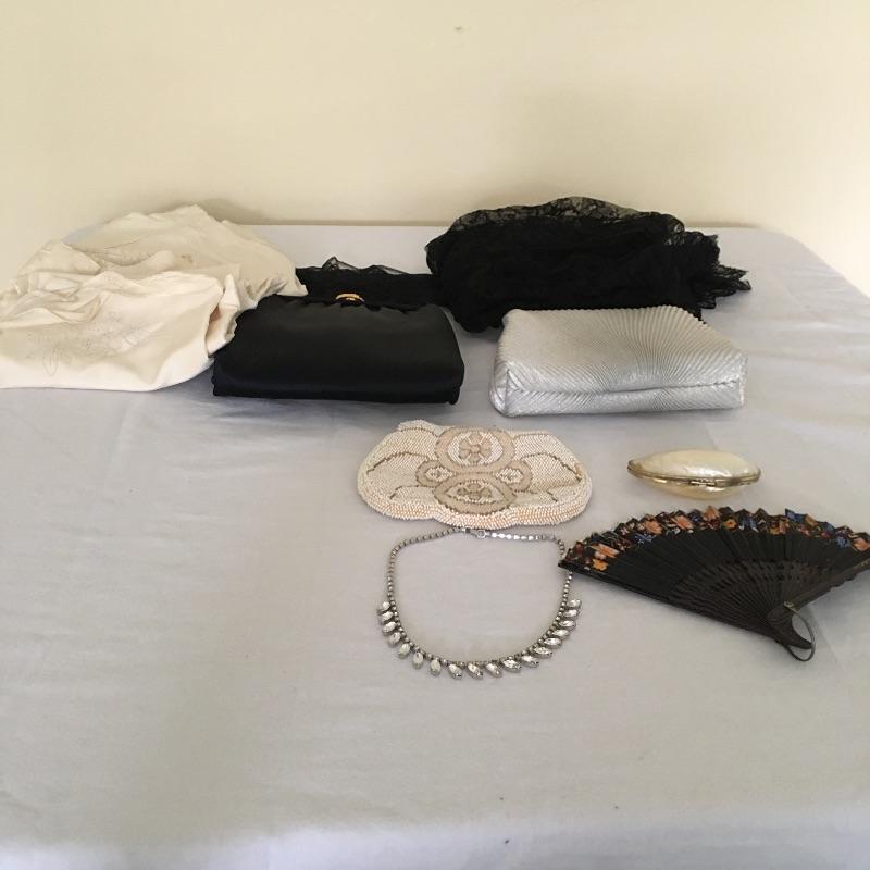 This array of purses includes a small black purse, beaded purse, silver purse and a oyster shell purse. Also includes black lace top and shawl, fan and rhinestone necklace. Be ready for a night on the town with this cool collection. Black purse measures 7” x 7.25” x 1”.