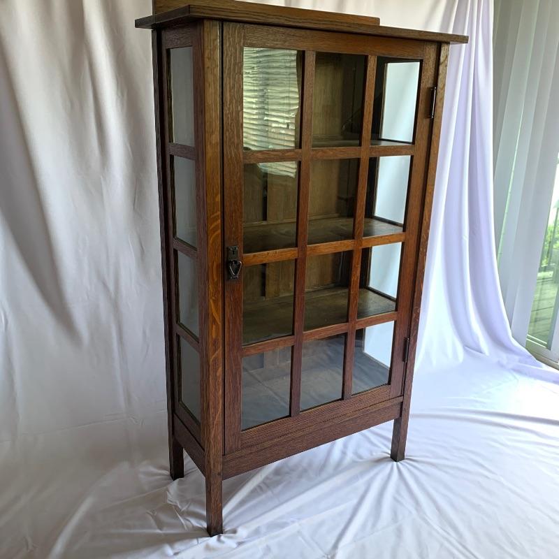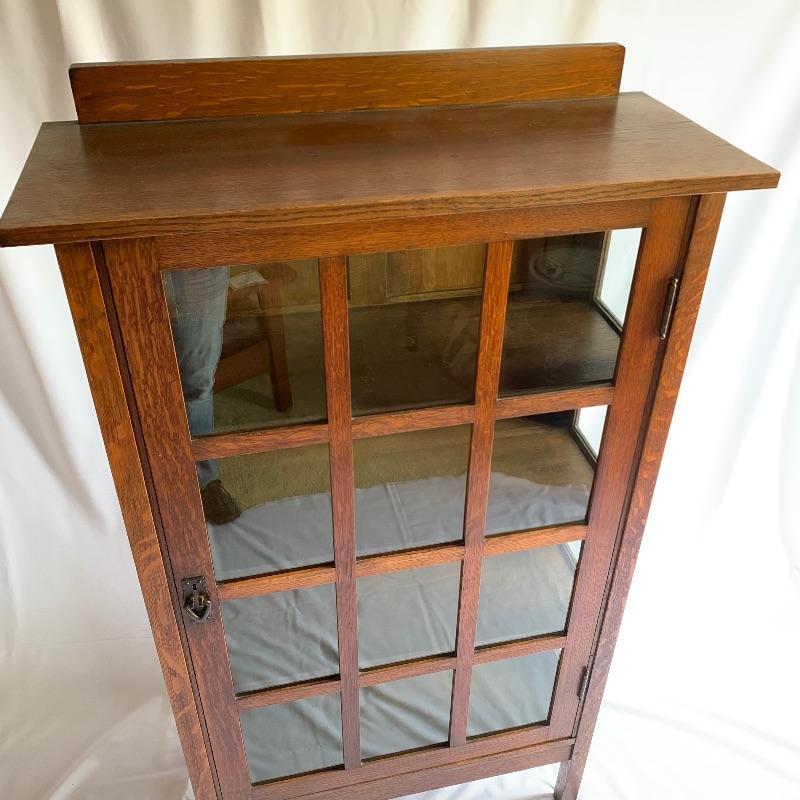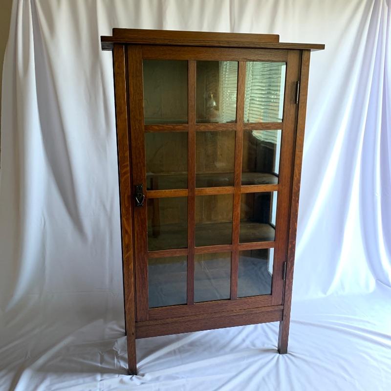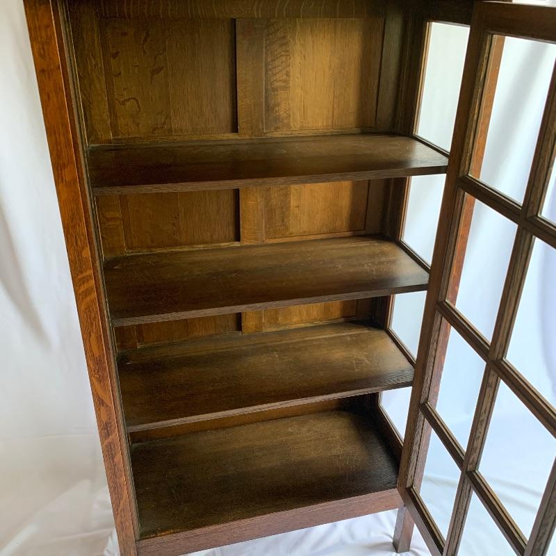 Gustav Stickley China Cabinet No. 820. Oak china cabinet with a twelve pane single door & 4 glass panels on the sides with back splash. Original finish & original hardware. Dish wells on top three interior shelves. Signed with the Gustav Stickley branded compass.