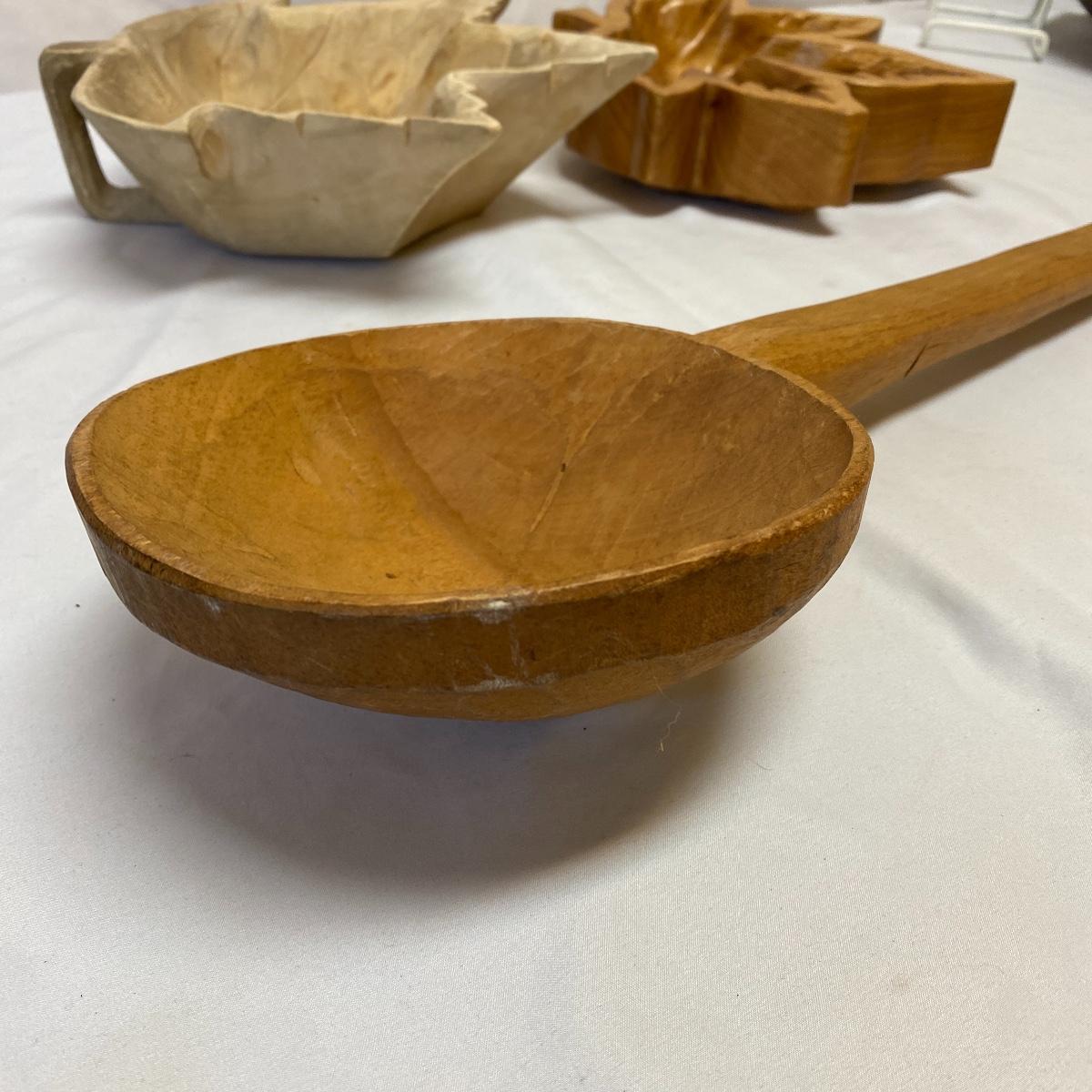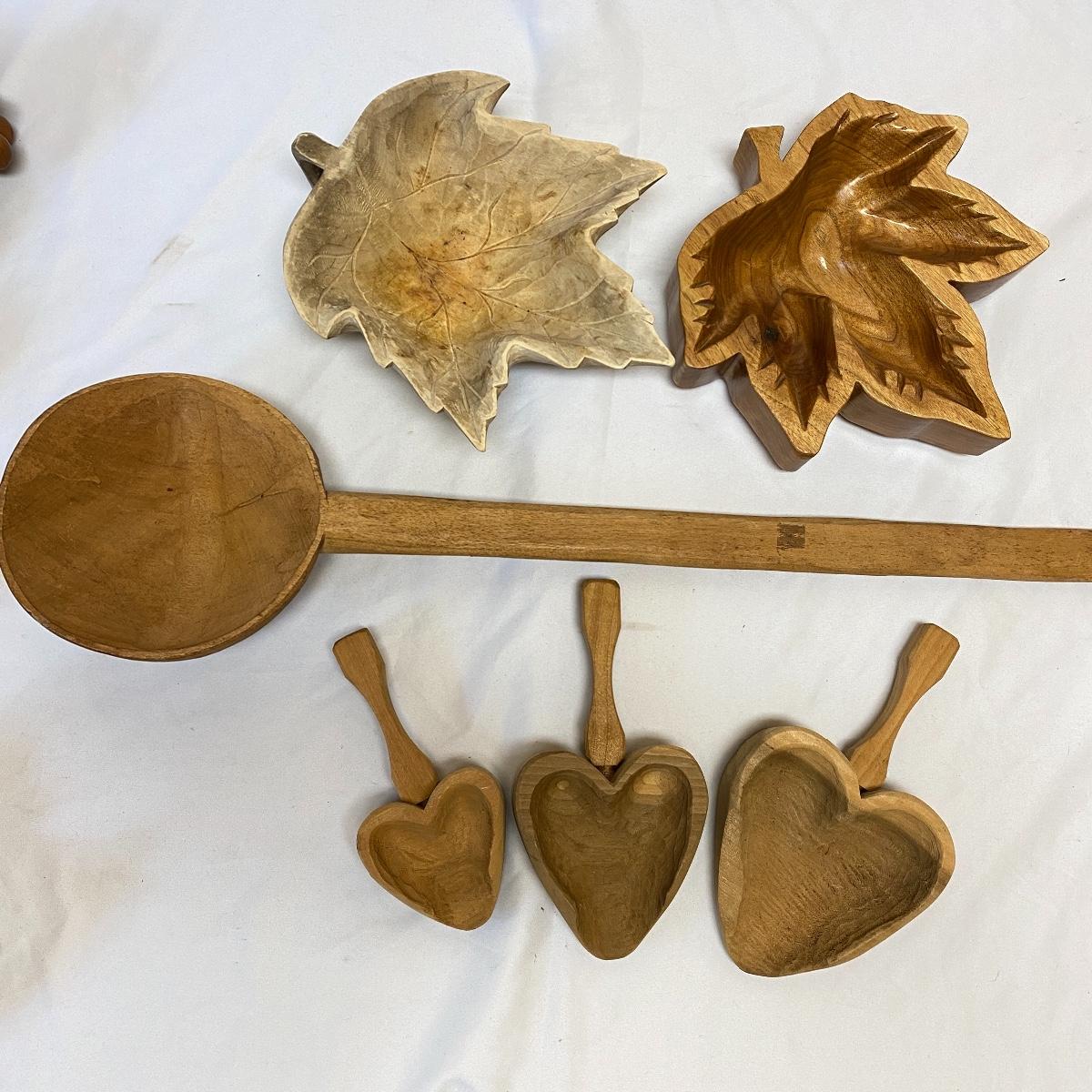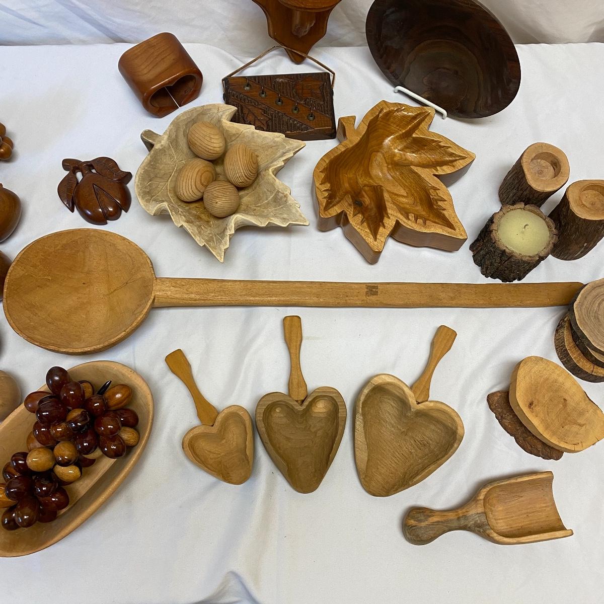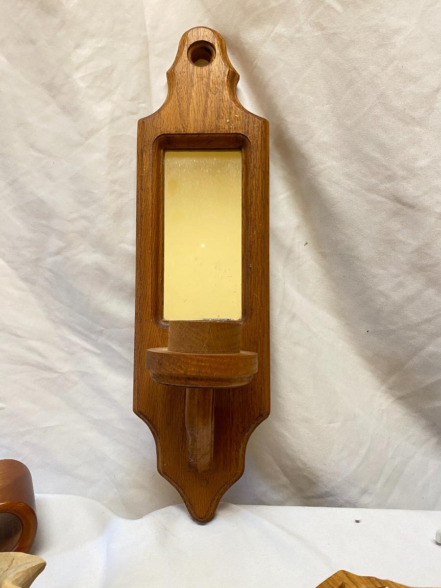 Great craftsmanship in these wooden pieces that include carved scoops, large wooden ladle (29” long), wooden fruit, carved maple leaf bowls, wooden candleholders and hooks. There is also a great selection of wooden fruit including grapes, apples and eggs. Some are unfinished wood. Photos of signed pieces included. Mirrored wall candle holder measures 5” x 5” x 19”.