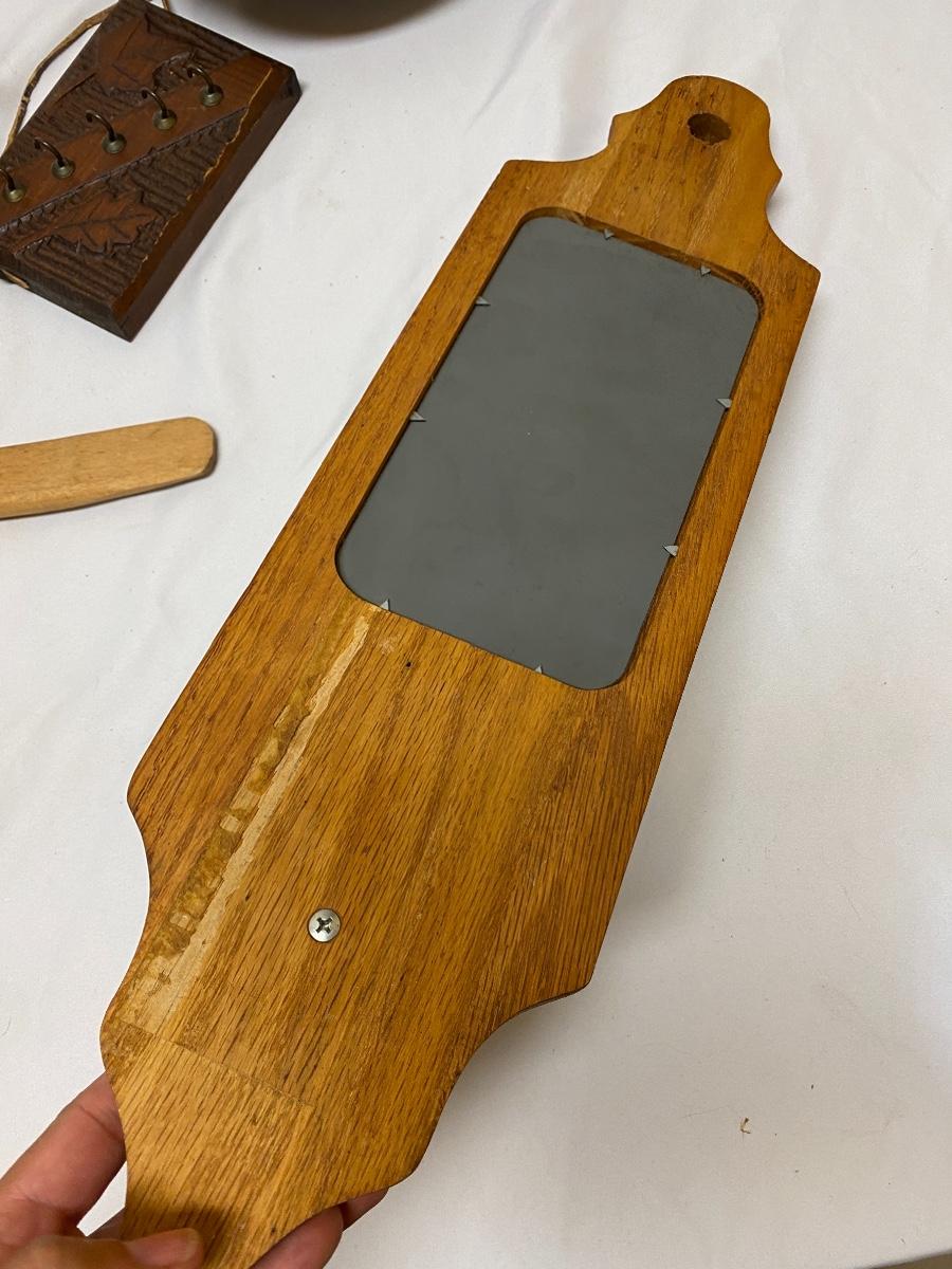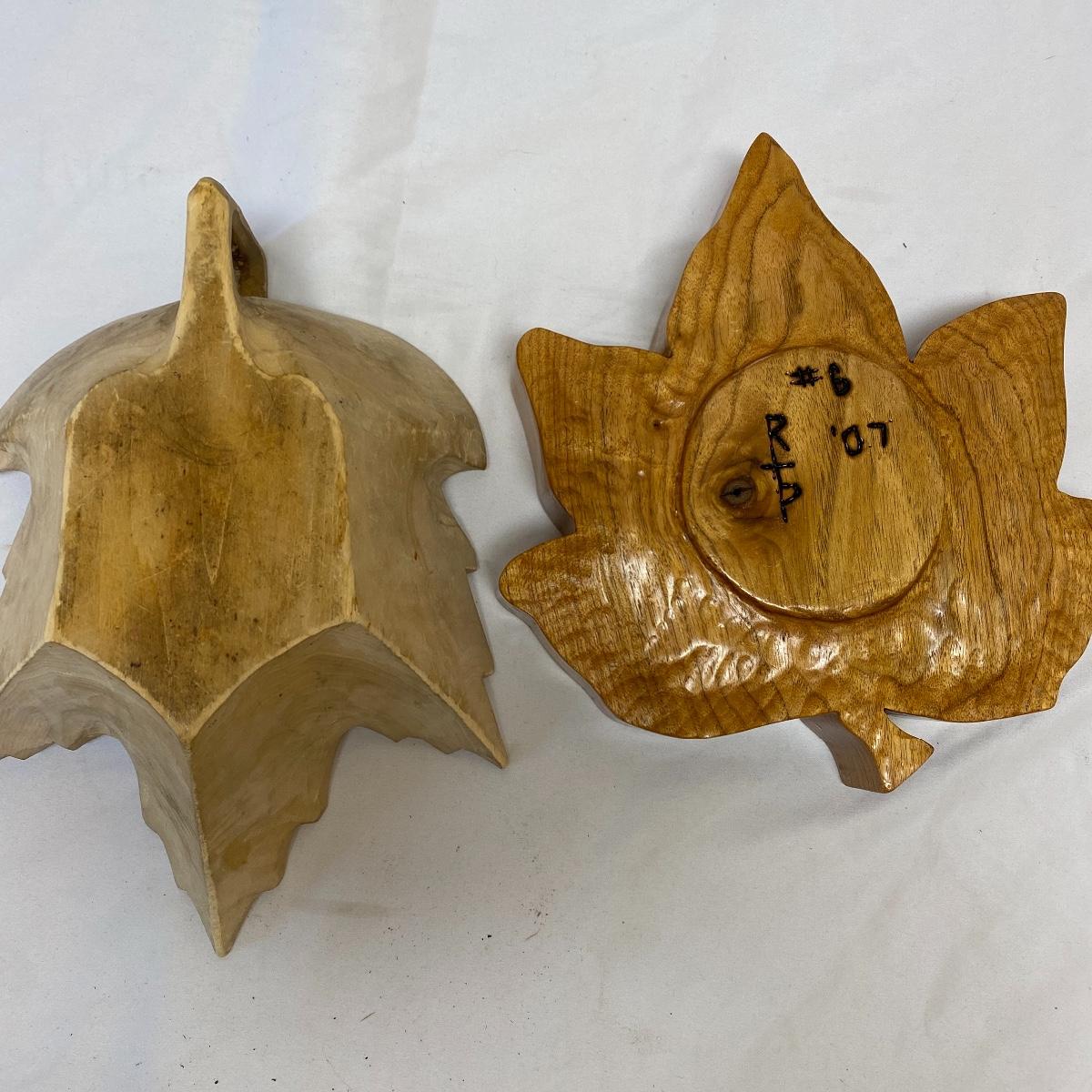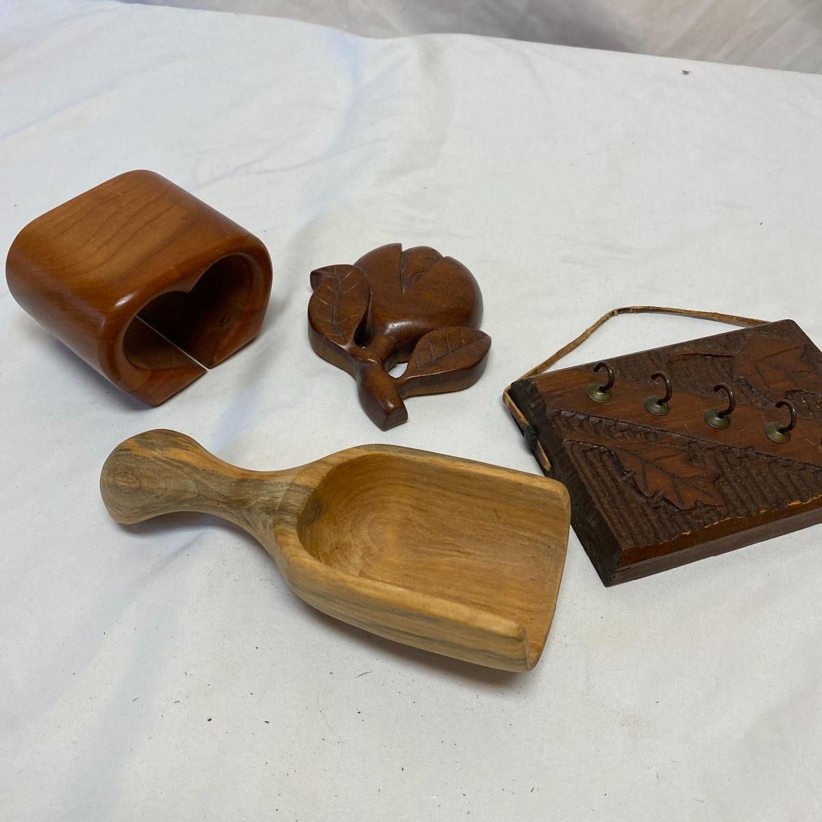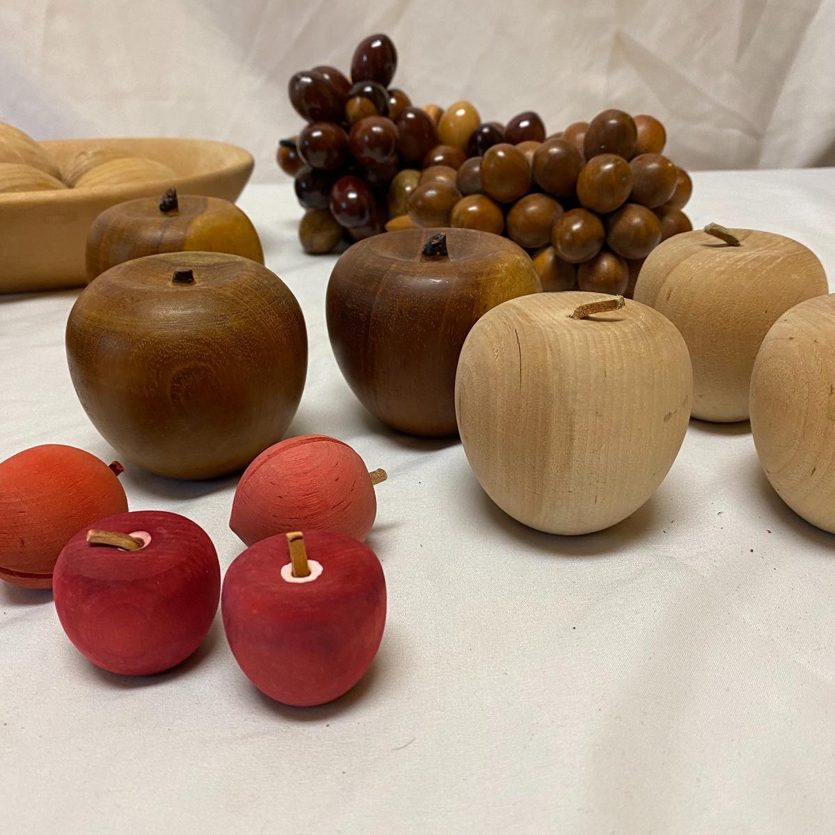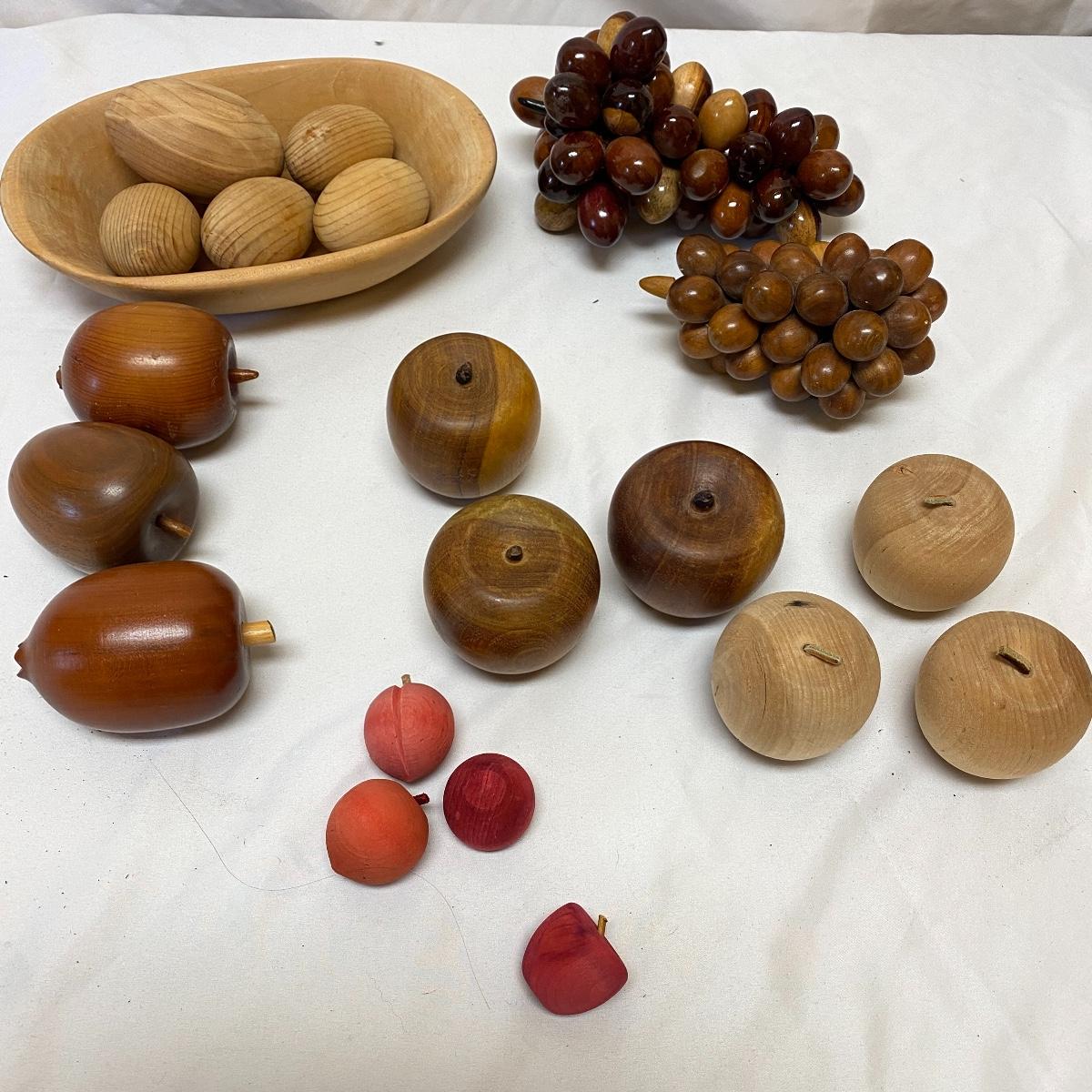 Great craftsmanship in these wooden pieces that include carved scoops, large wooden ladle (29” long), wooden fruit, carved maple leaf bowls, wooden candleholders and hooks. There is also a great selection of wooden fruit including grapes, apples and eggs. Some are unfinished wood. Photos of signed pieces included. Mirrored wall candle holder measures 5” x 5” x 19”.