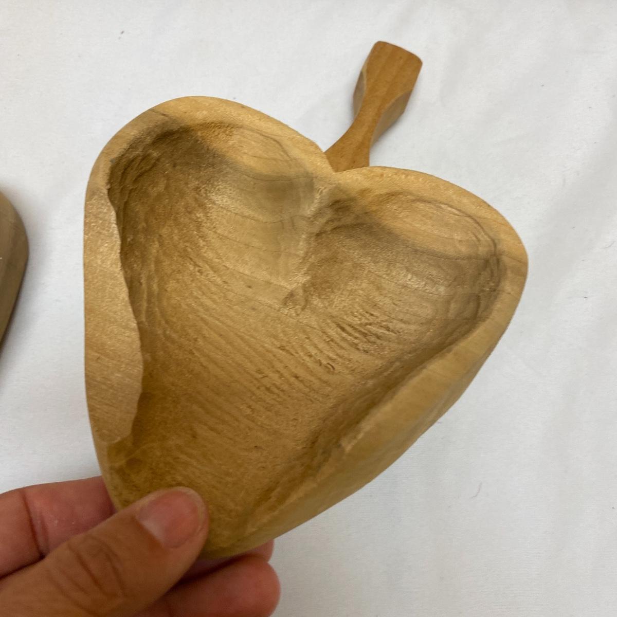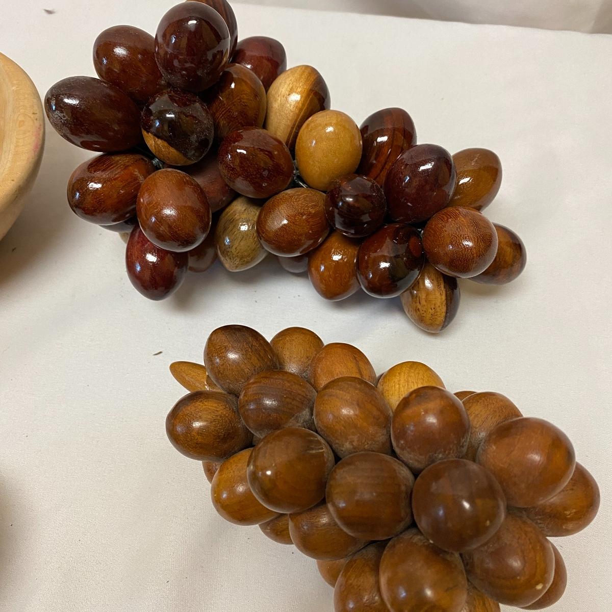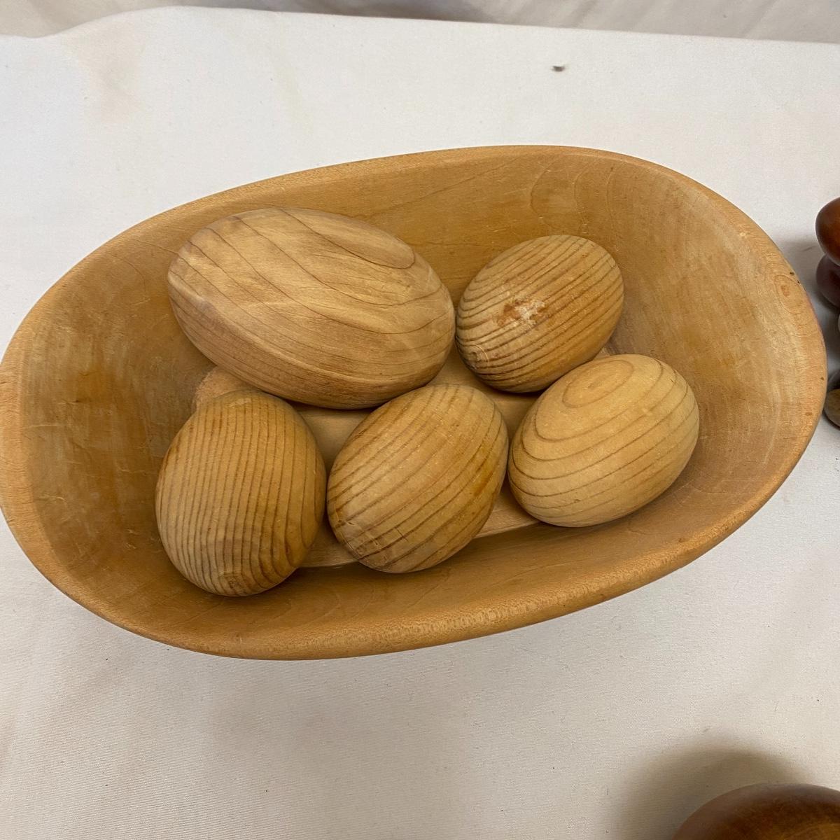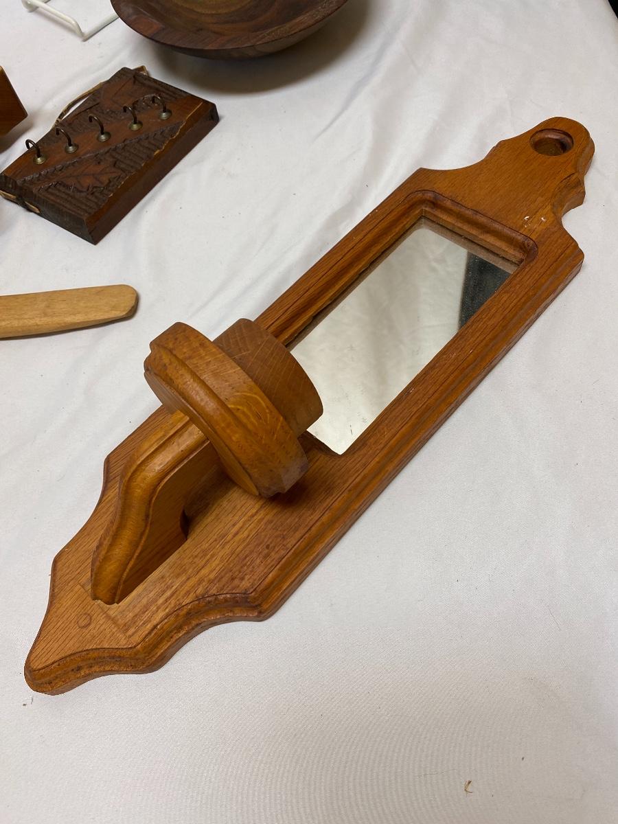 Great craftsmanship in these wooden pieces that include carved scoops, large wooden ladle (29” long), wooden fruit, carved maple leaf bowls, wooden candleholders and hooks. There is also a great selection of wooden fruit including grapes, apples and eggs. Some are unfinished wood. Photos of signed pieces included. Mirrored wall candle holder measures 5” x 5” x 19”.