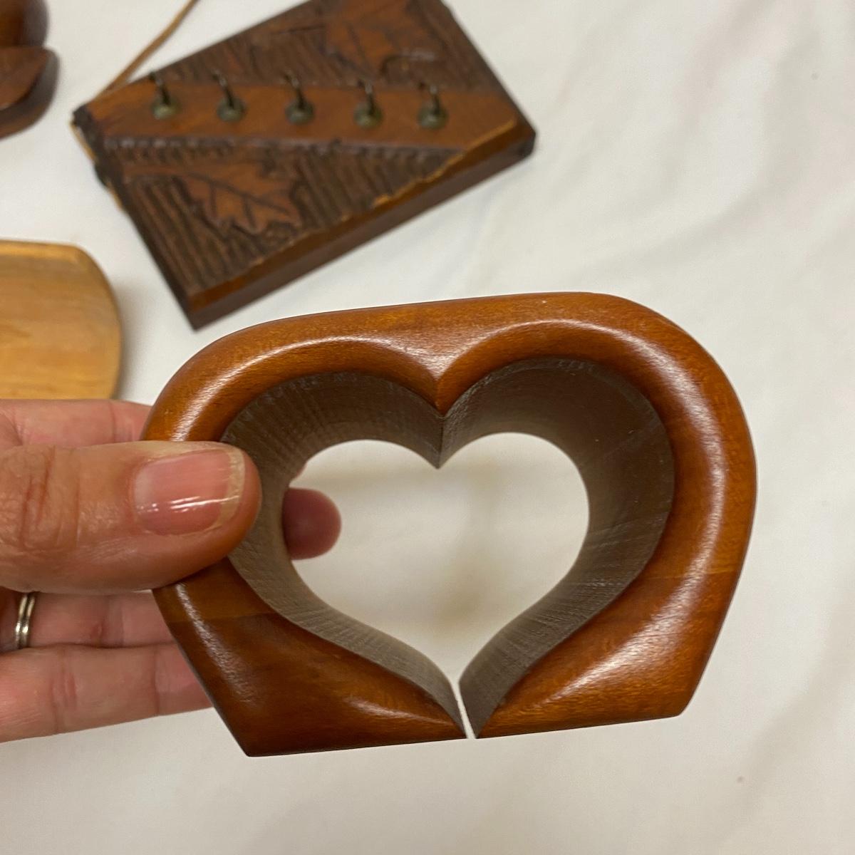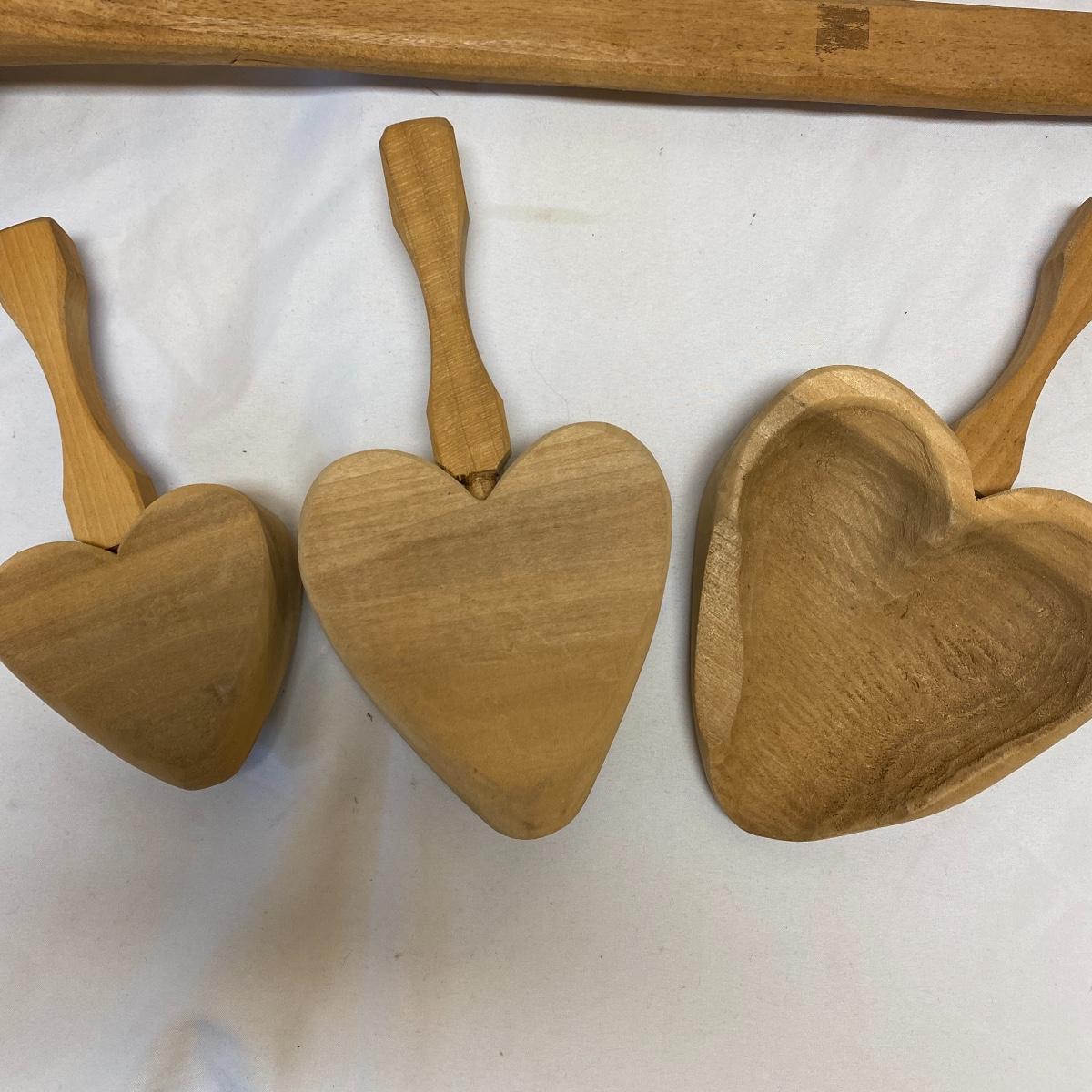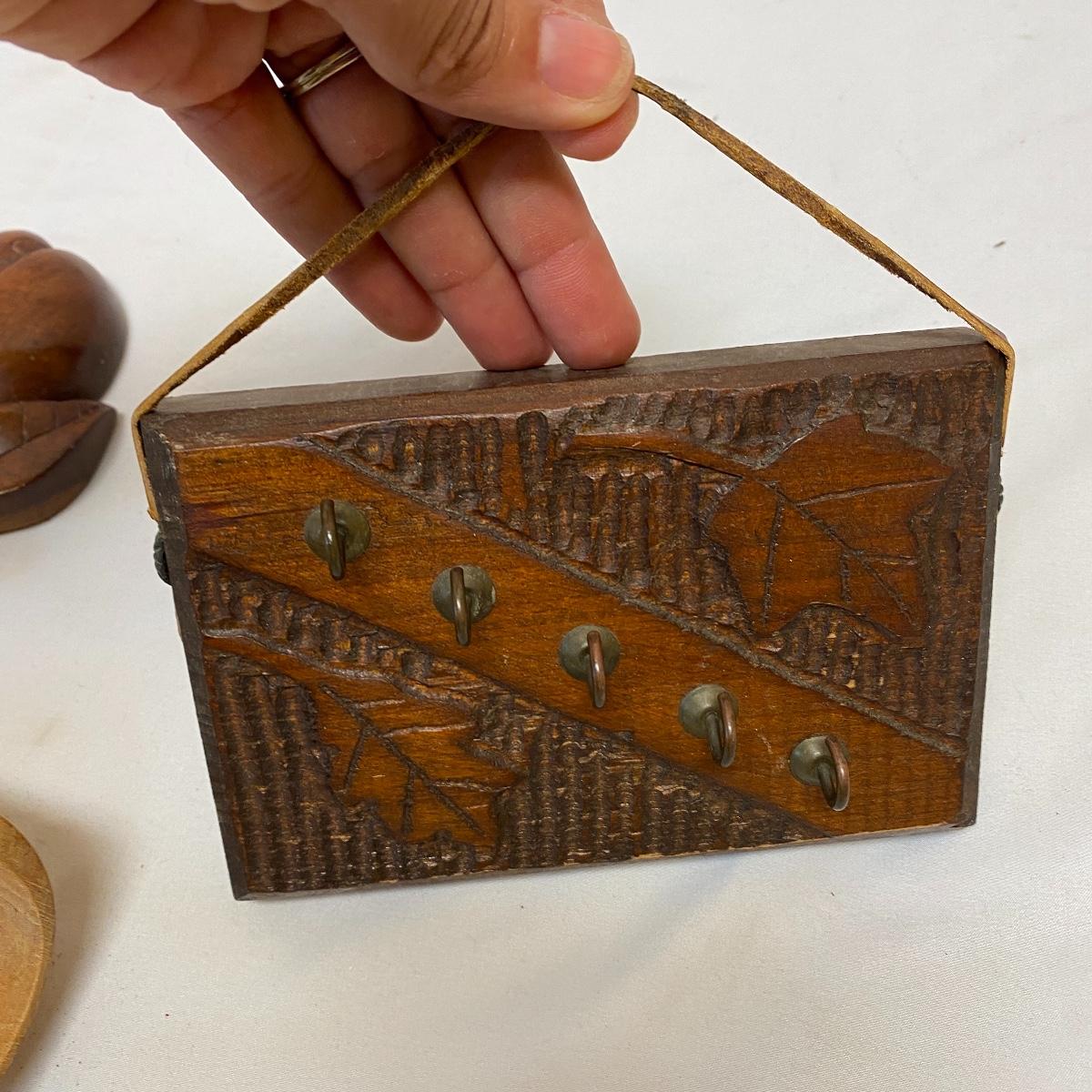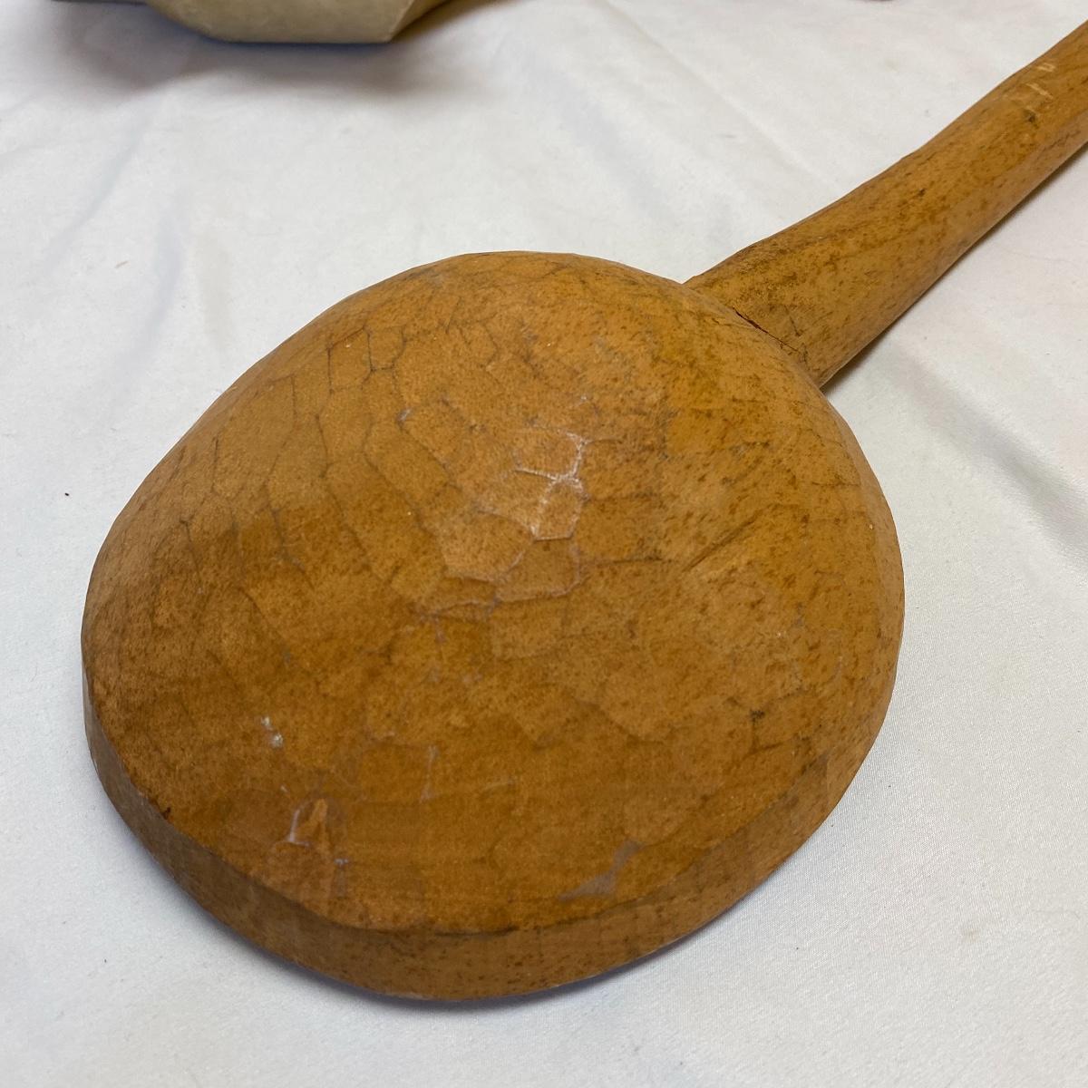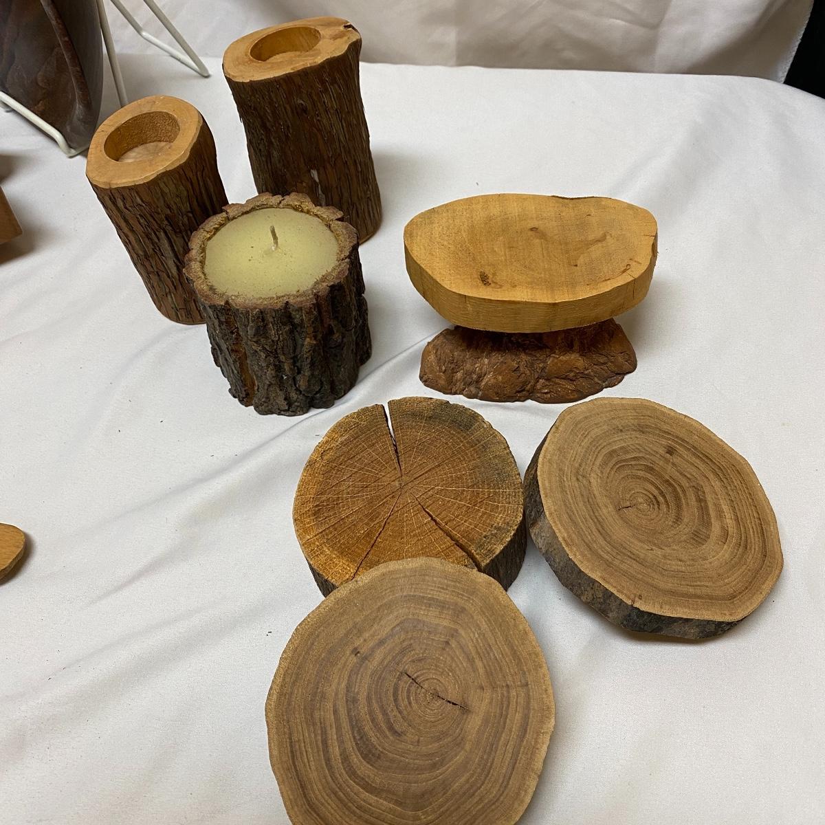 Great craftsmanship in these wooden pieces that include carved scoops, large wooden ladle (29” long), wooden fruit, carved maple leaf bowls, wooden candleholders and hooks. There is also a great selection of wooden fruit including grapes, apples and eggs. Some are unfinished wood. Photos of signed pieces included. Mirrored wall candle holder measures 5” x 5” x 19”.