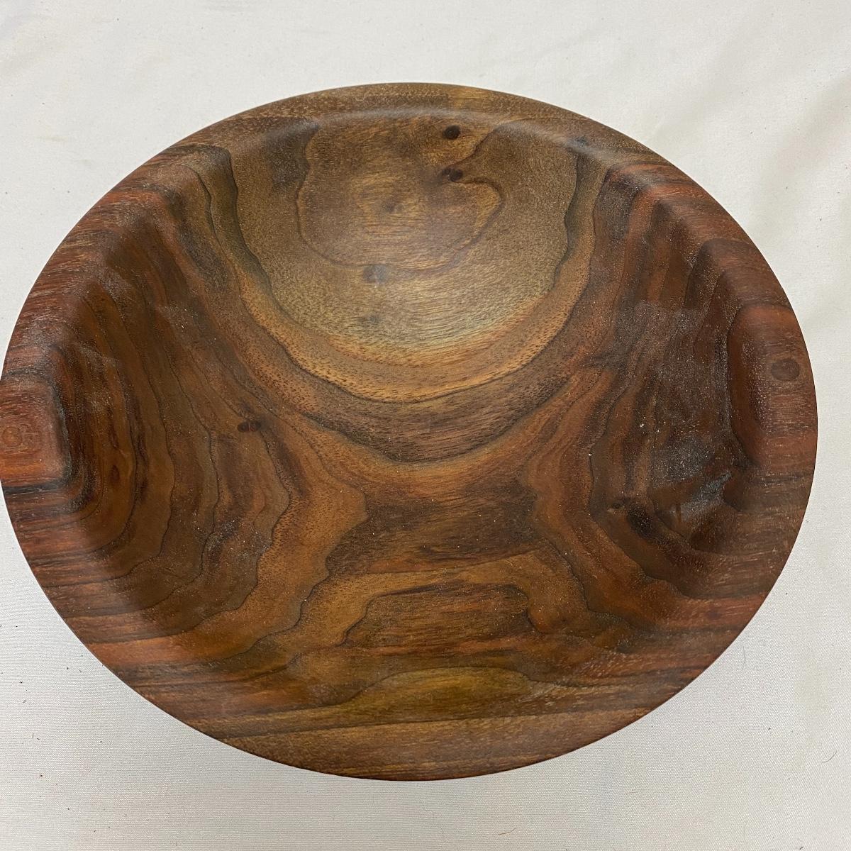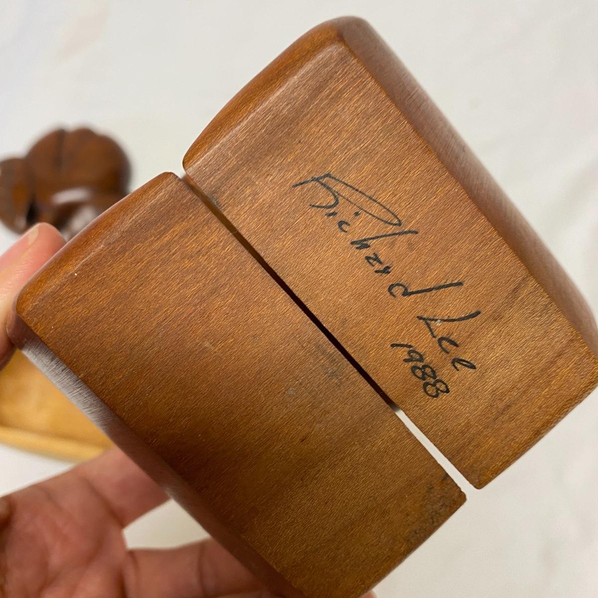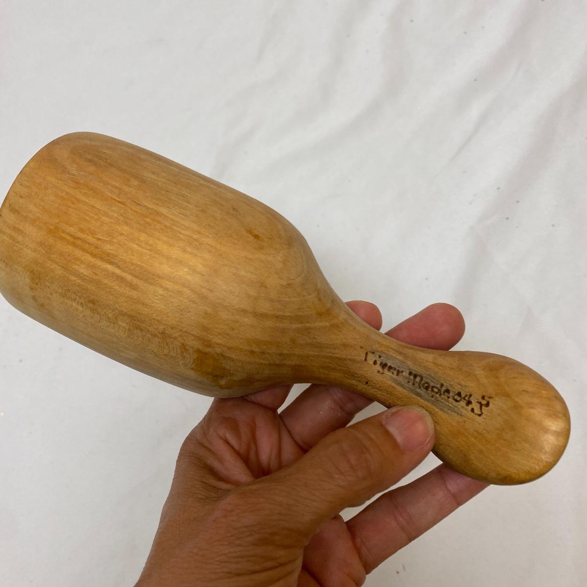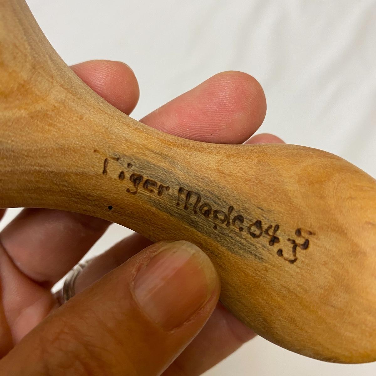 Great craftsmanship in these wooden pieces that include carved scoops, large wooden ladle (29” long), wooden fruit, carved maple leaf bowls, wooden candleholders and hooks. There is also a great selection of wooden fruit including grapes, apples and eggs. Some are unfinished wood. Photos of signed pieces included. Mirrored wall candle holder measures 5” x 5” x 19”.