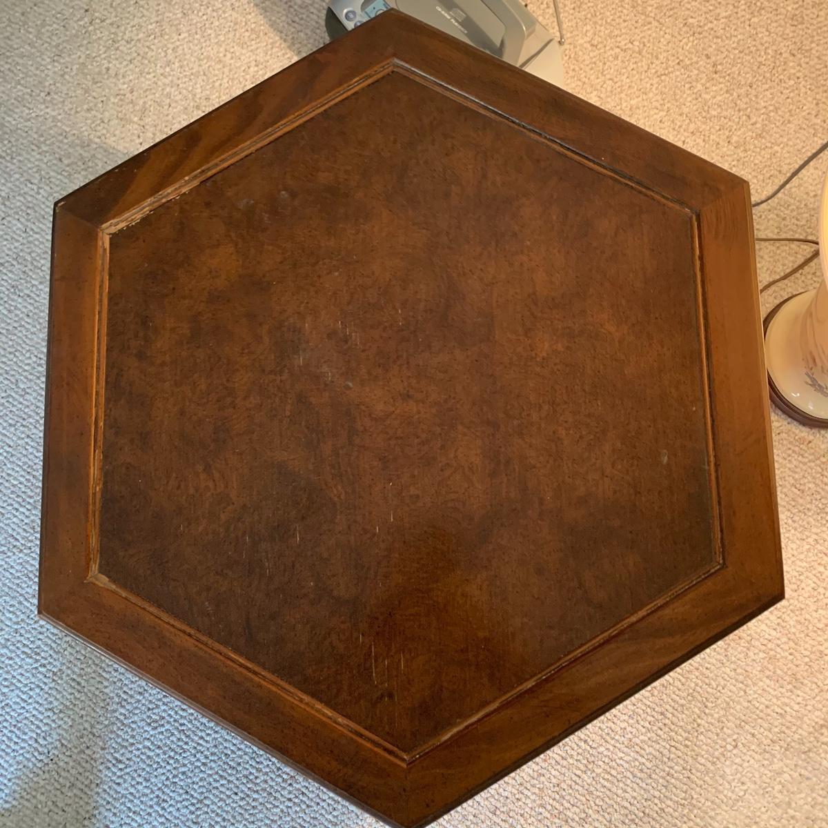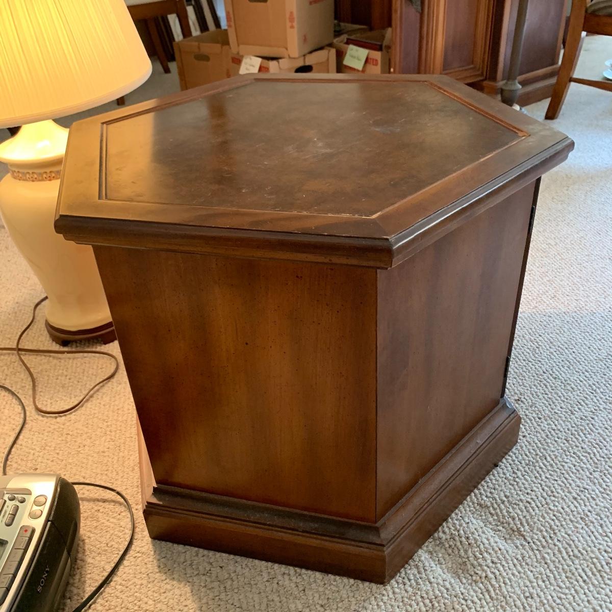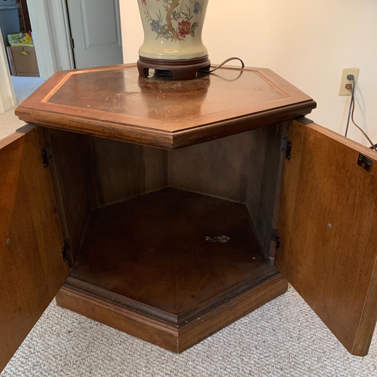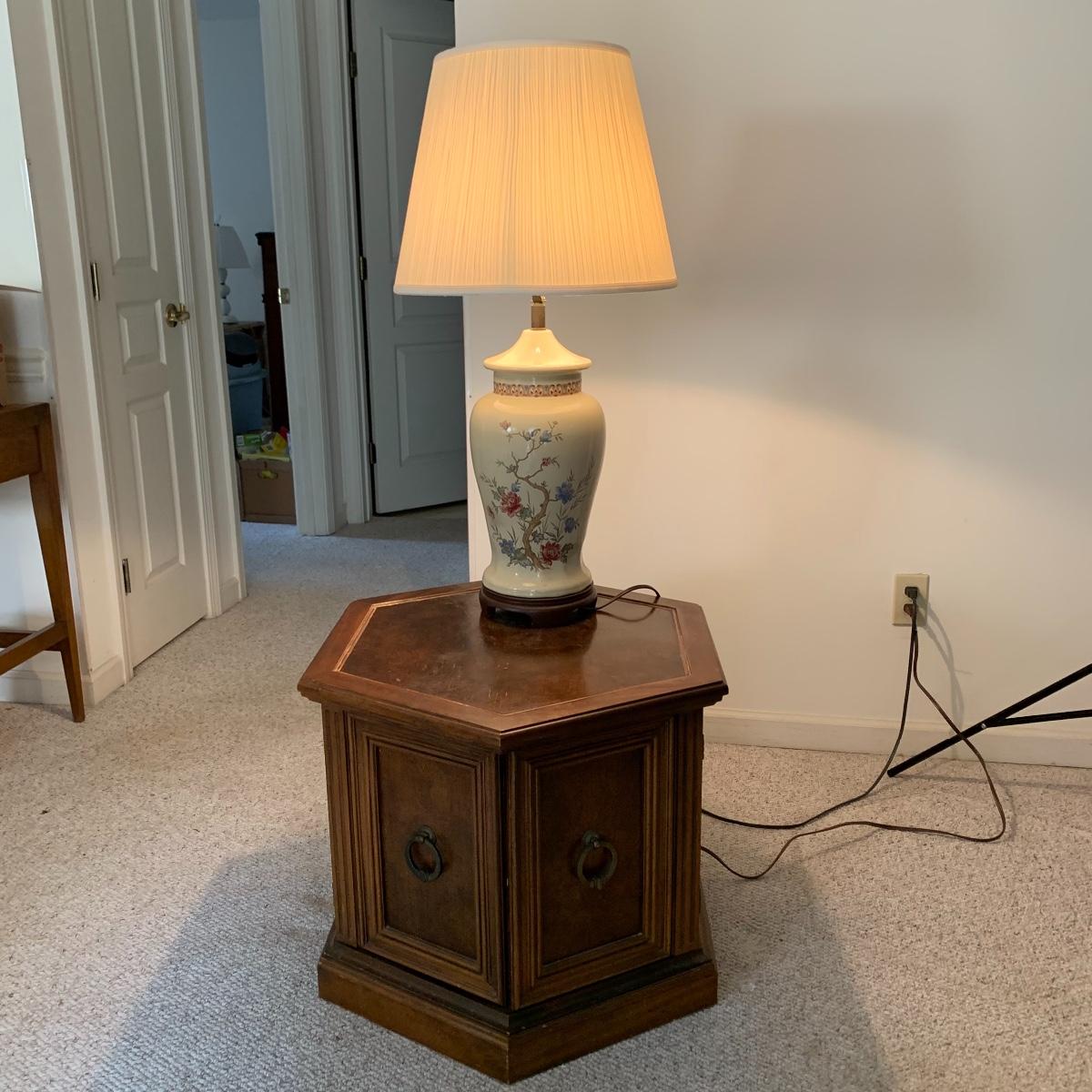 Add elegance to your home with this hexagon table and lamp. The lamp is cream colored and features a beautiful rose motif. It stands 34” tall and is 14” wide at the base of the shade. The table is made of sturdy dark stained wood and includes ample storage inside. This piece measures 20” tall X 24” wide. Local pickup only,