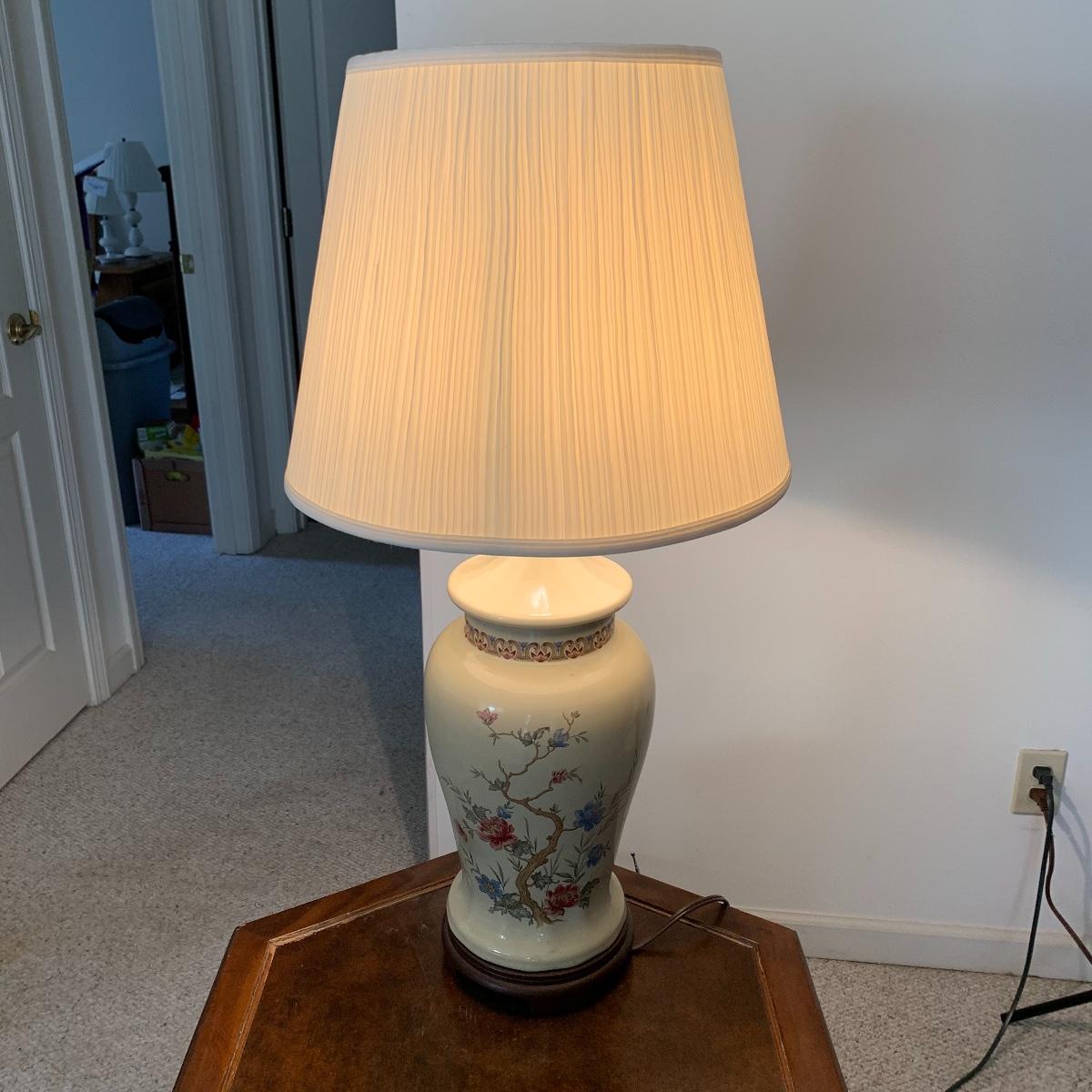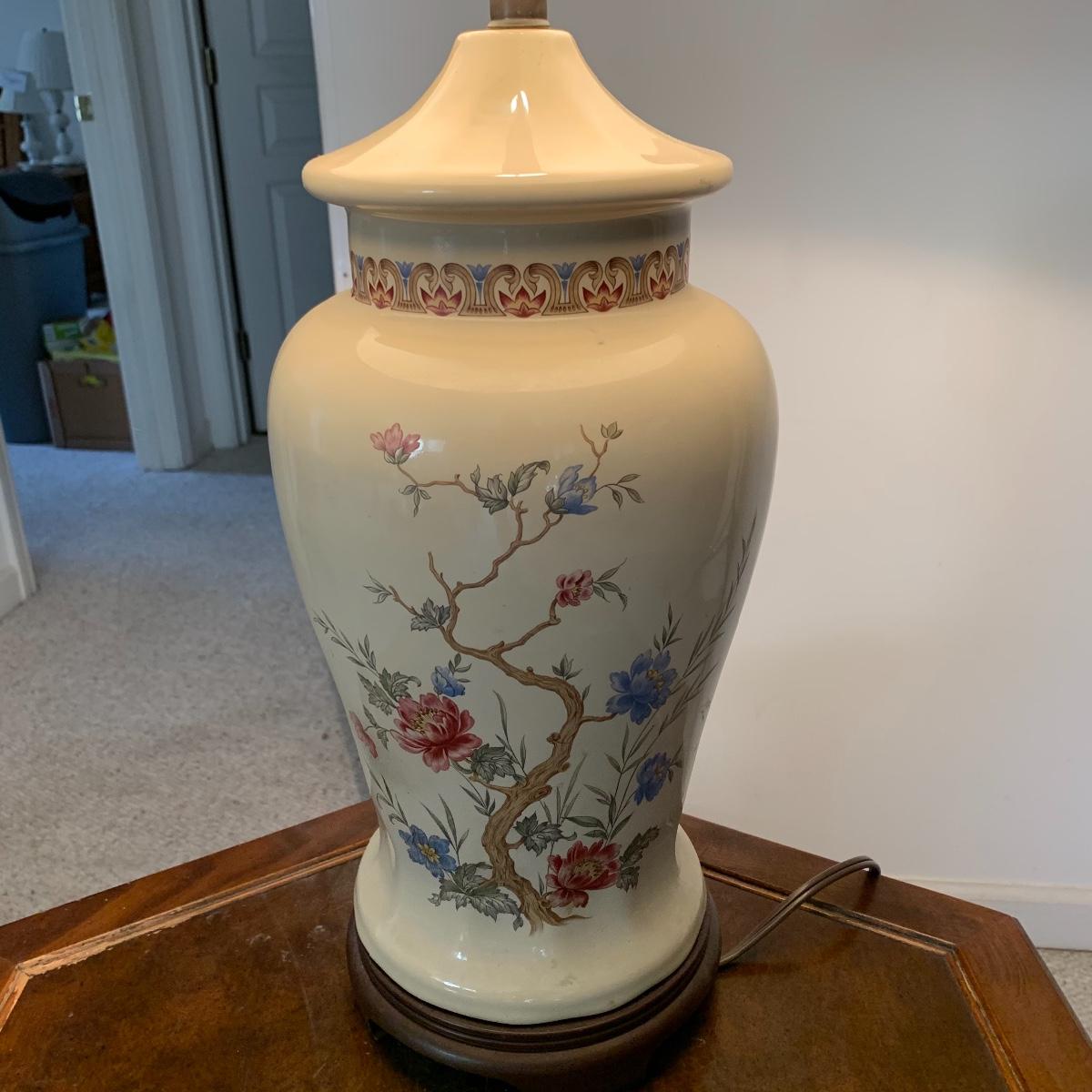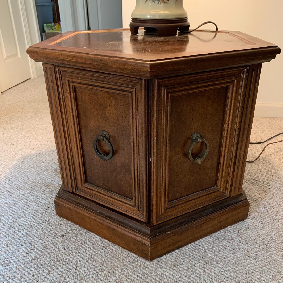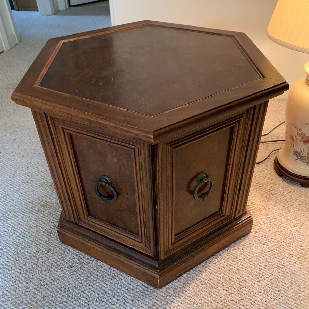 Add elegance to your home with this hexagon table and lamp. The lamp is cream colored and features a beautiful rose motif. It stands 34” tall and is 14” wide at the base of the shade. The table is made of sturdy dark stained wood and includes ample storage inside. This piece measures 20” tall X 24” wide. Local pickup only,