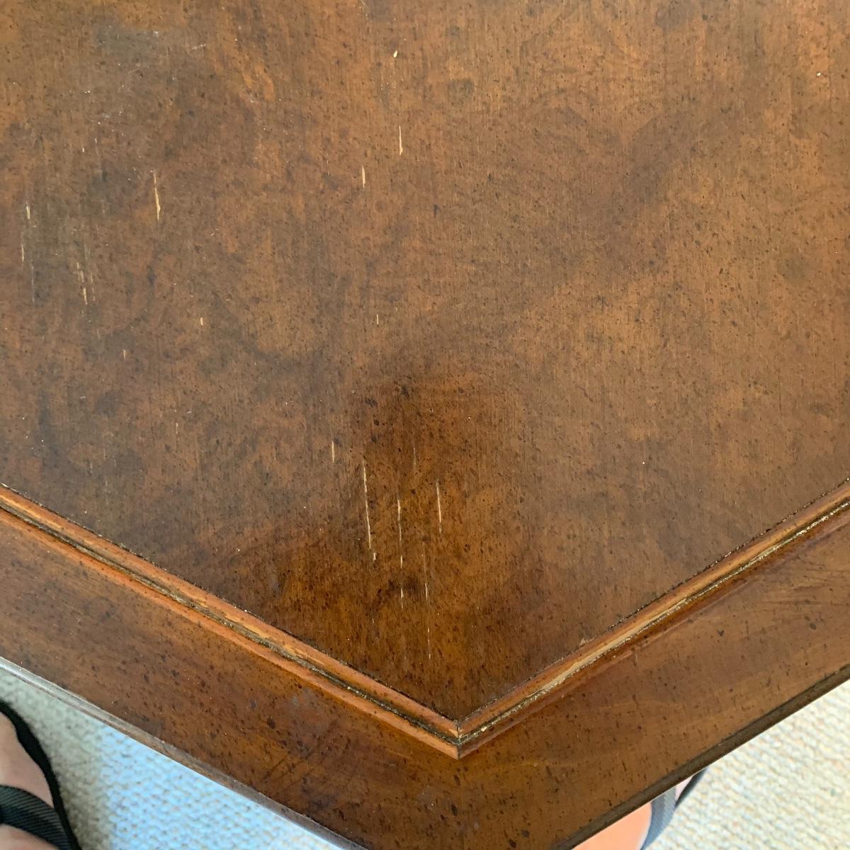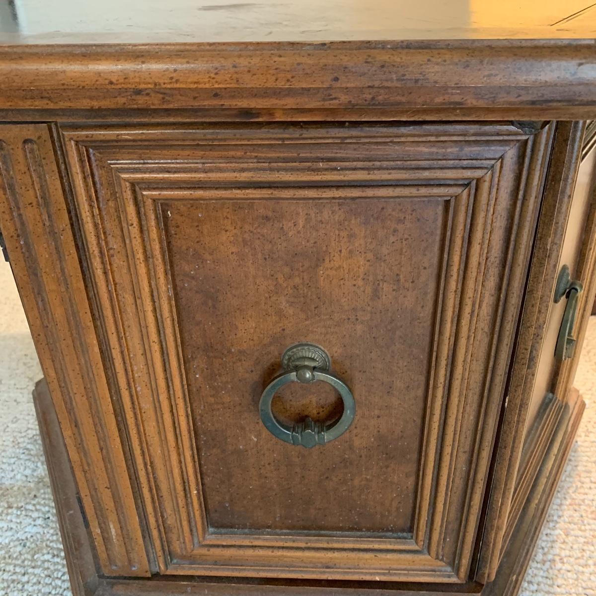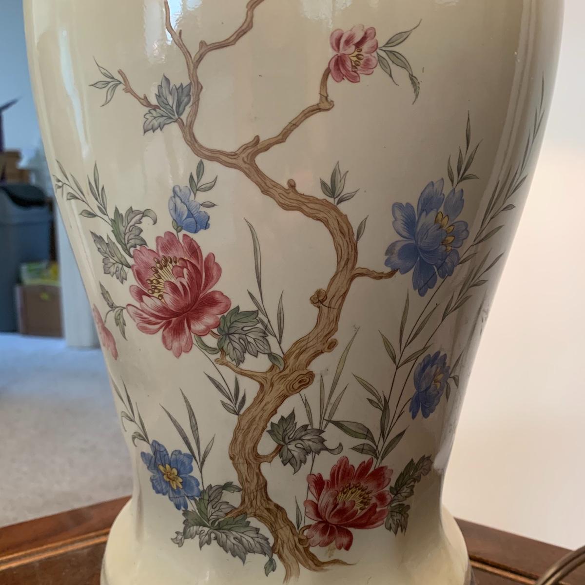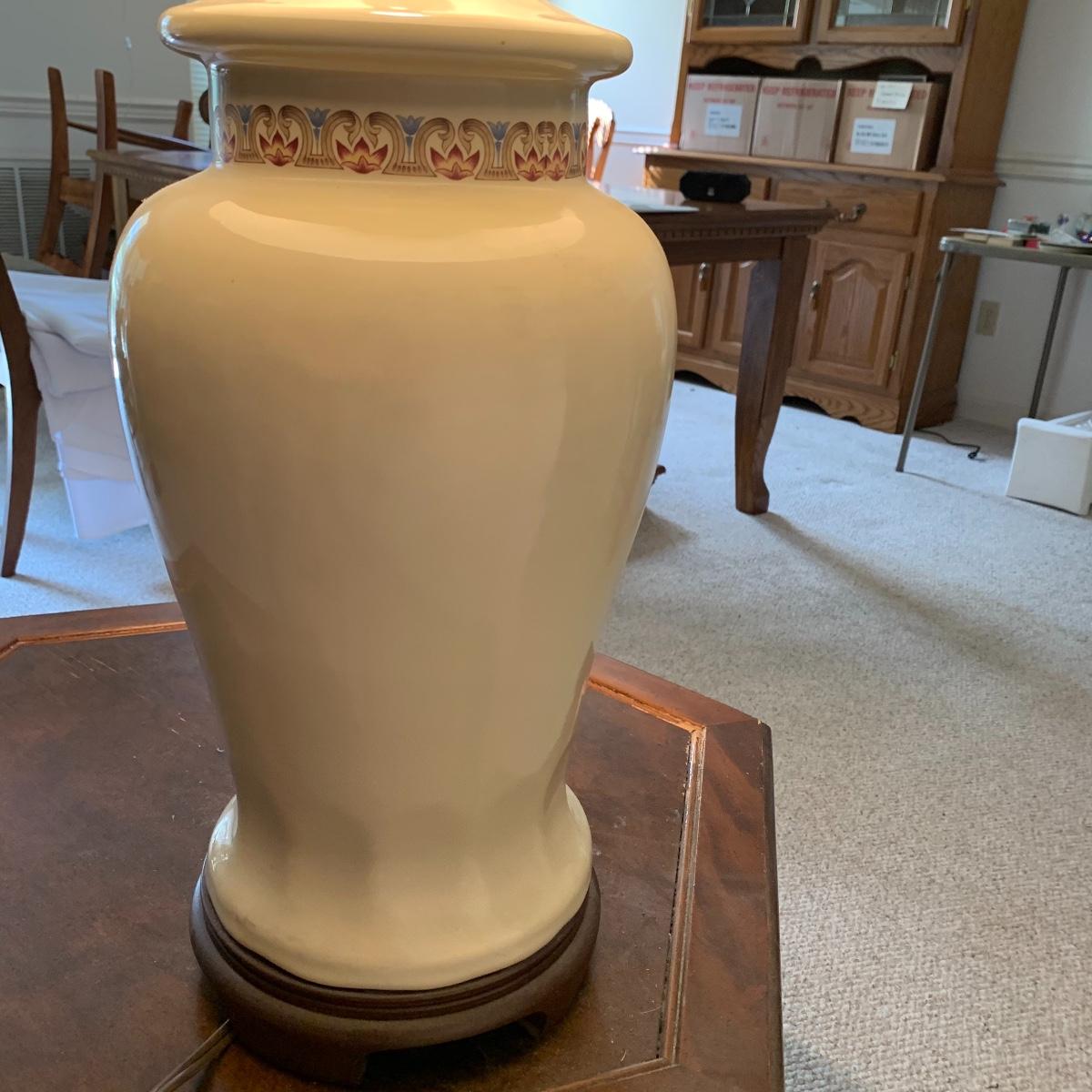 Add elegance to your home with this hexagon table and lamp. The lamp is cream colored and features a beautiful rose motif. It stands 34” tall and is 14” wide at the base of the shade. The table is made of sturdy dark stained wood and includes ample storage inside. This piece measures 20” tall X 24” wide. Local pickup only,