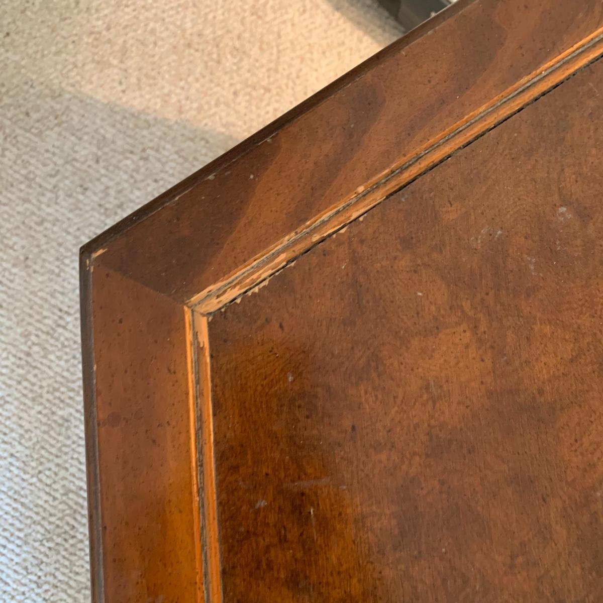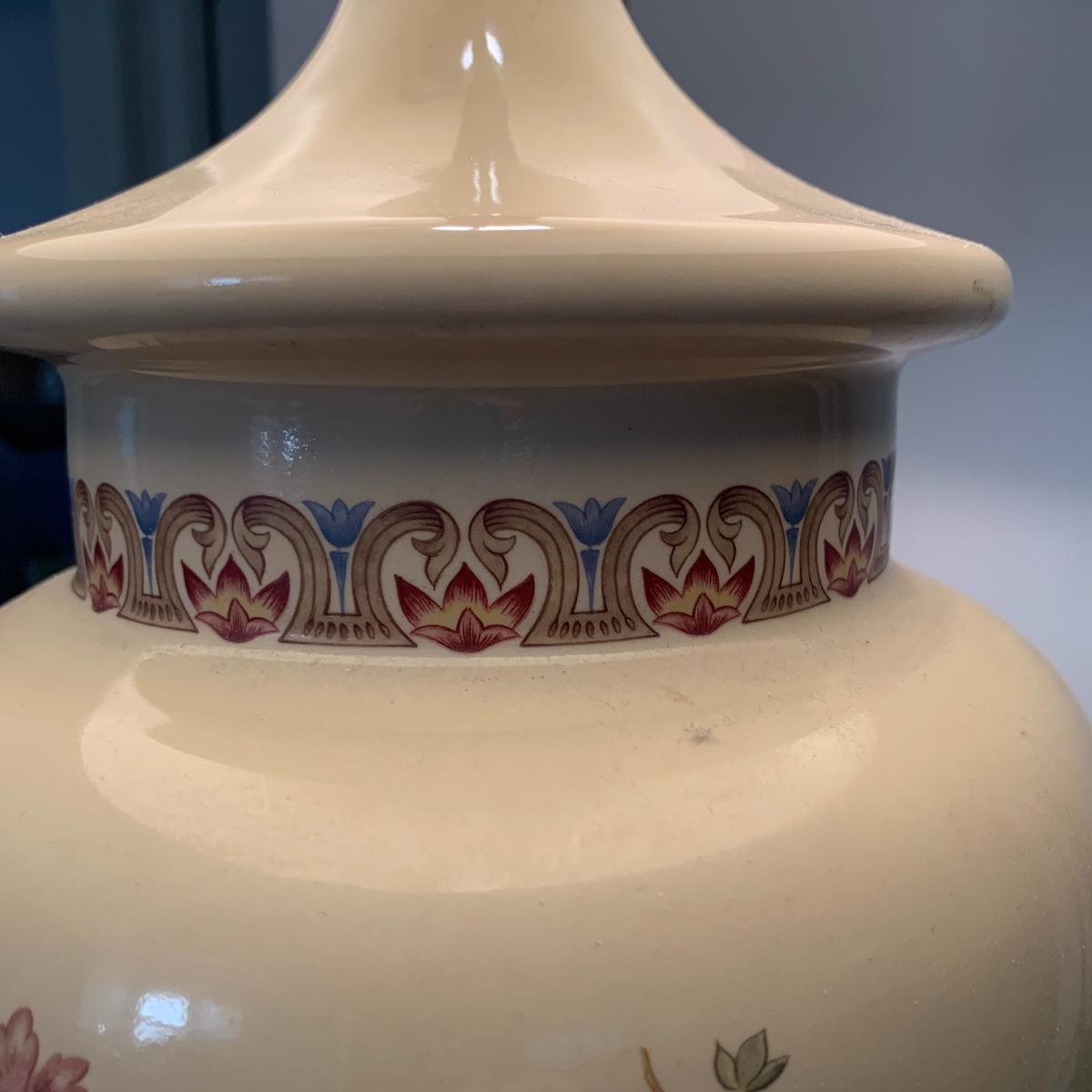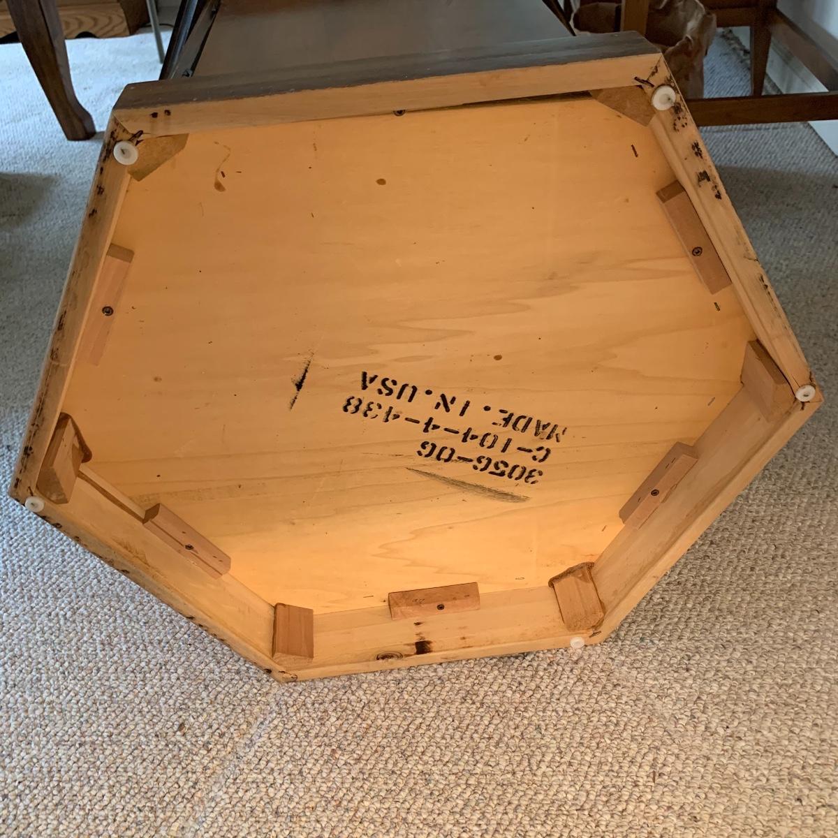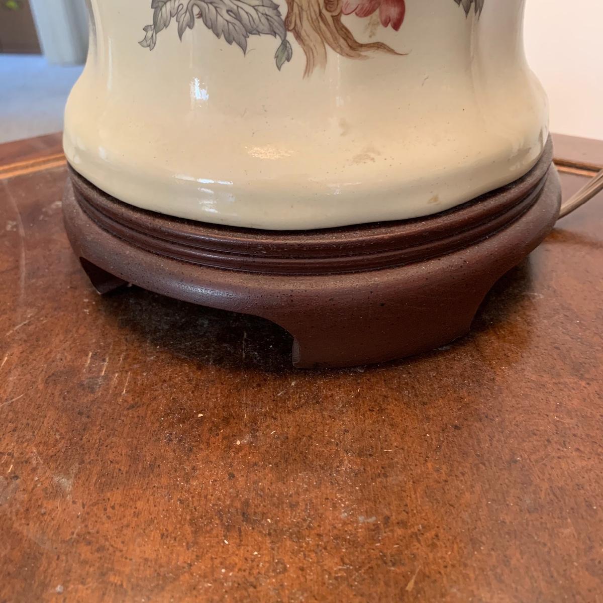 Add elegance to your home with this hexagon table and lamp. The lamp is cream colored and features a beautiful rose motif. It stands 34” tall and is 14” wide at the base of the shade. The table is made of sturdy dark stained wood and includes ample storage inside. This piece measures 20” tall X 24” wide. Local pickup only,