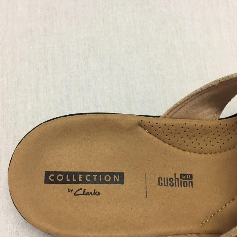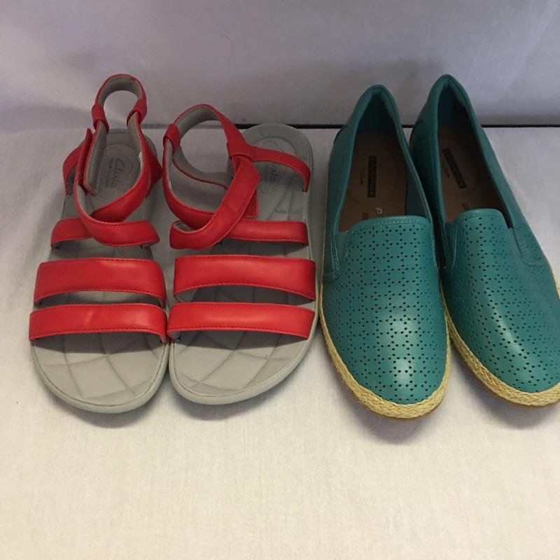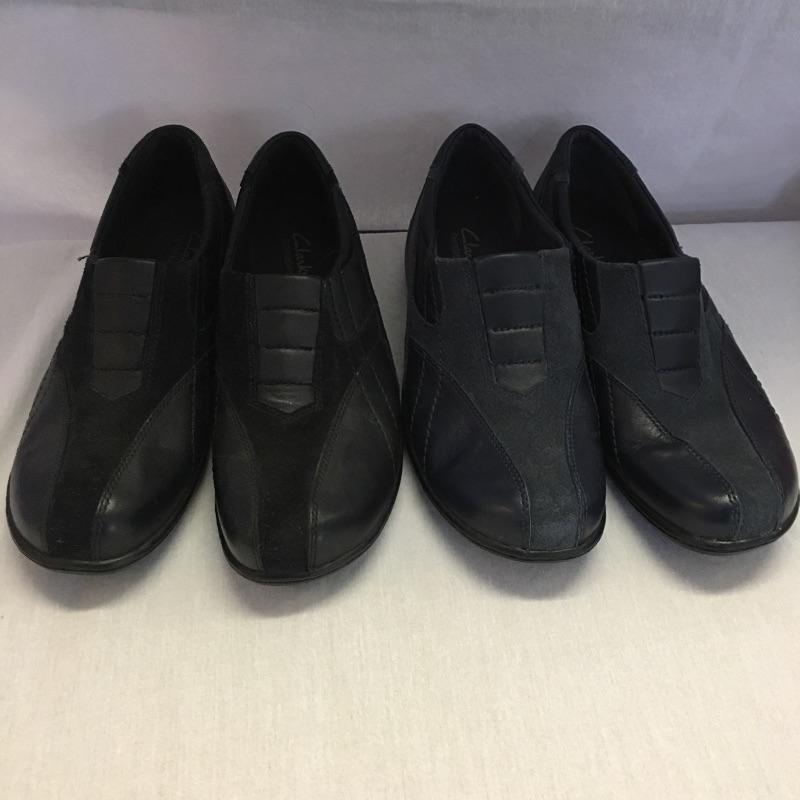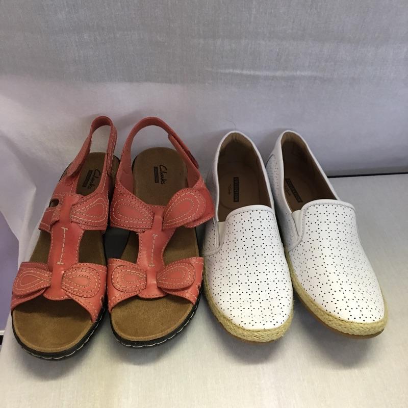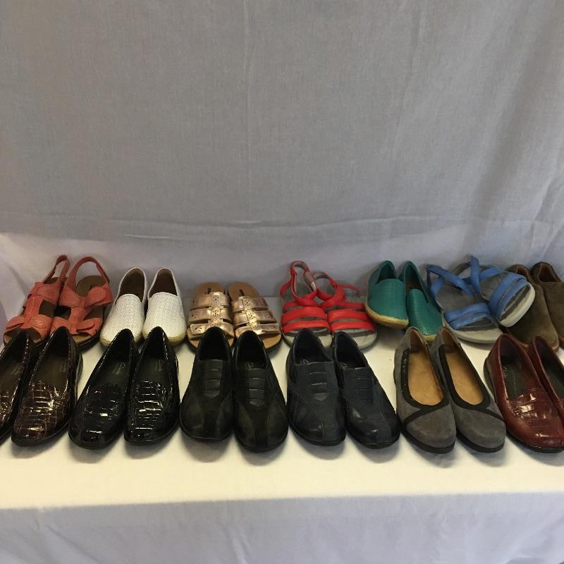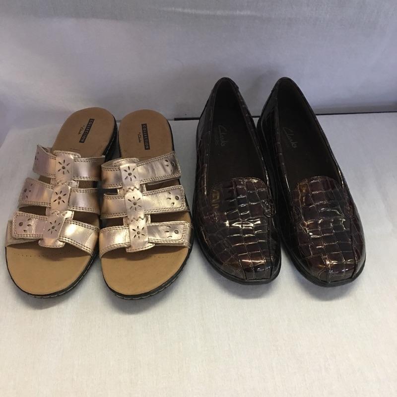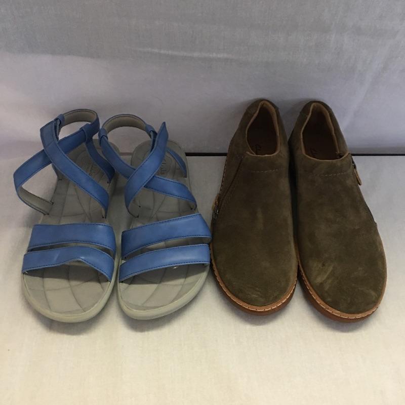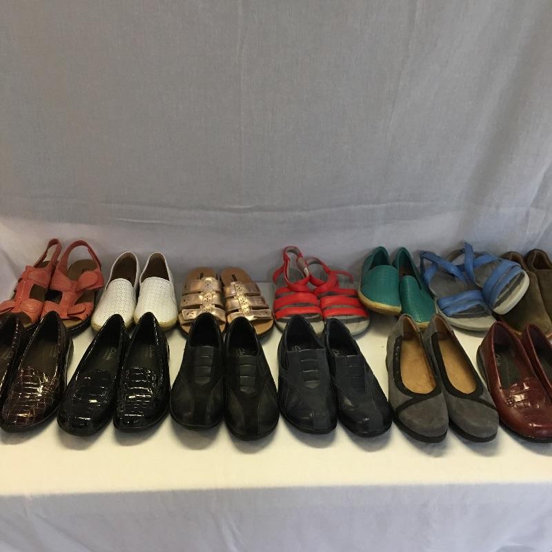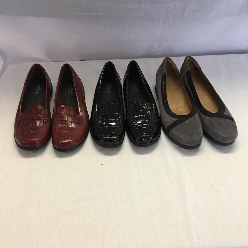 Thirteen pairs of ladies Clark's shoes in a variety of styles and colors. Most shoes are new and still have sticker on bottom of shoe and marked size eight.