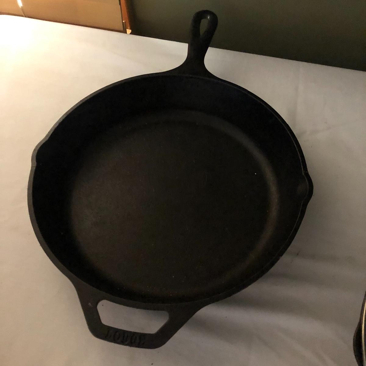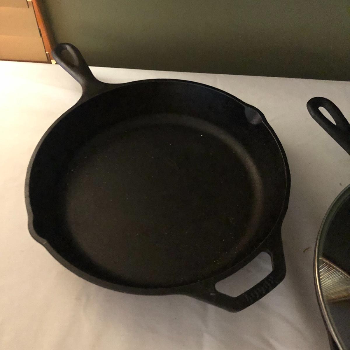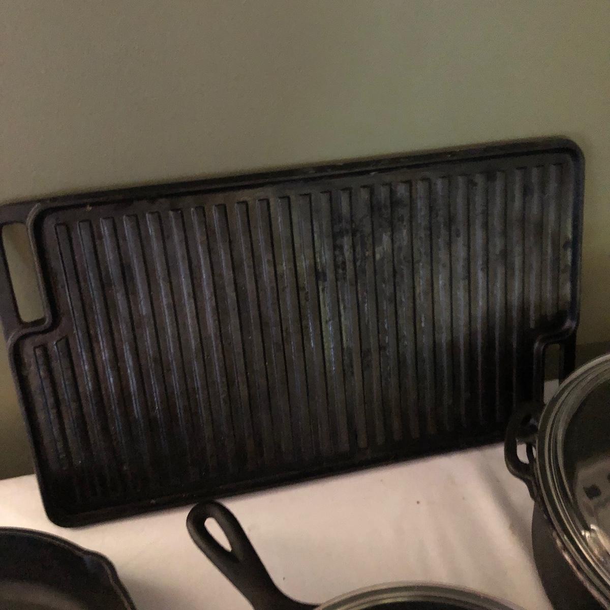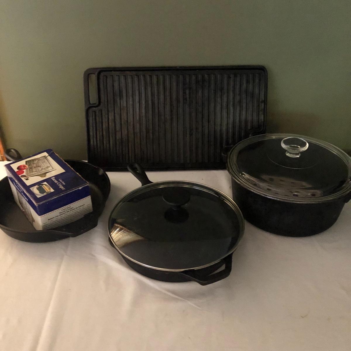 Enjoy cooking with this cast iron lot! It includes two Lodge 10.5 “ skillets (one with lid), one 5 quart pot (with lid), one griddle and one bacon crisper. Local pick up only.