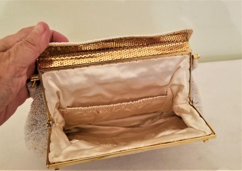 Lovely vintage beaded evening bag - missing a few little beads in one place - see photo. Very Clean - satin interior. Beaded all over - even the bottom - a sign of quality. Measures 9" x 7" not counting the handle.