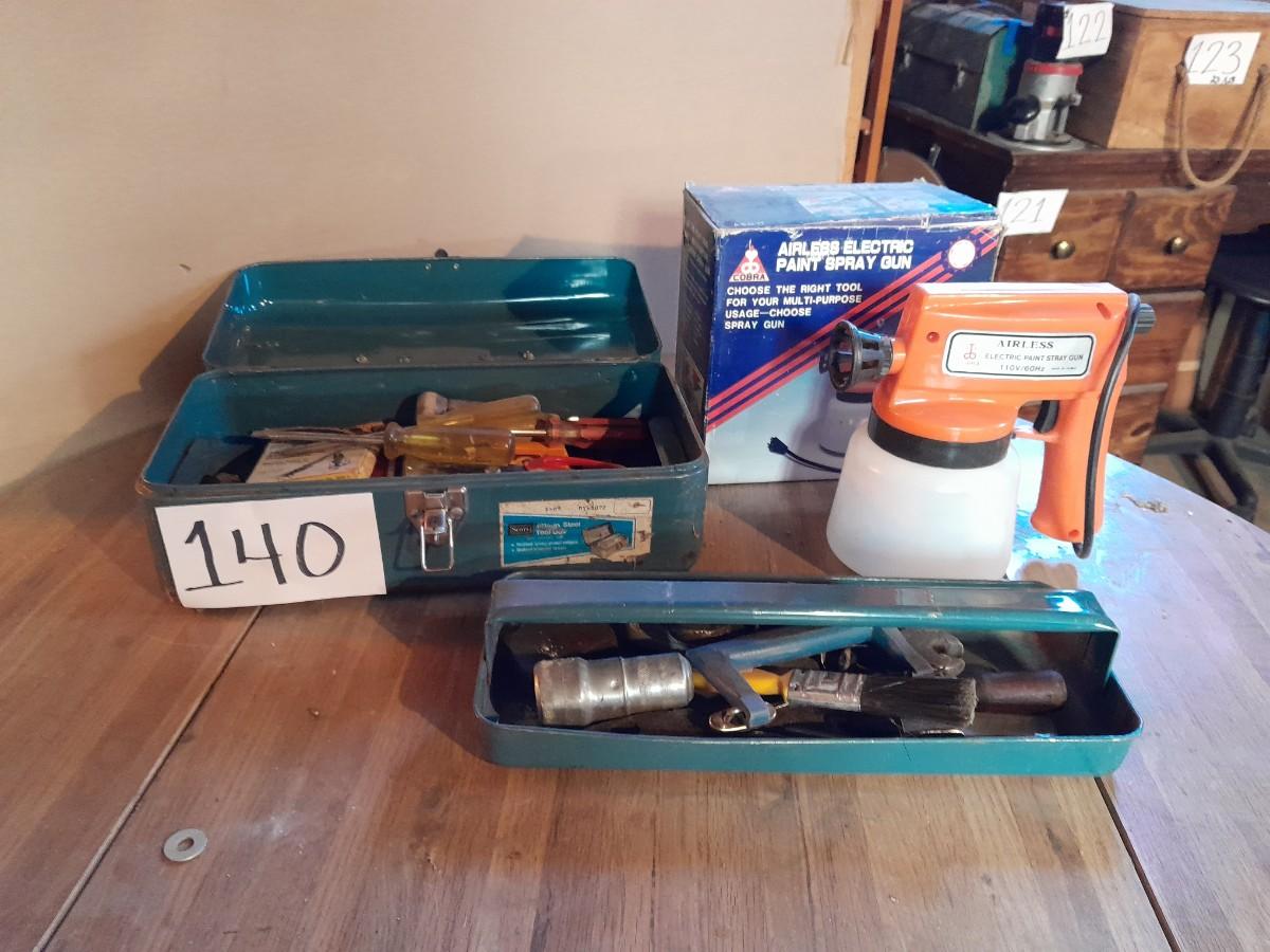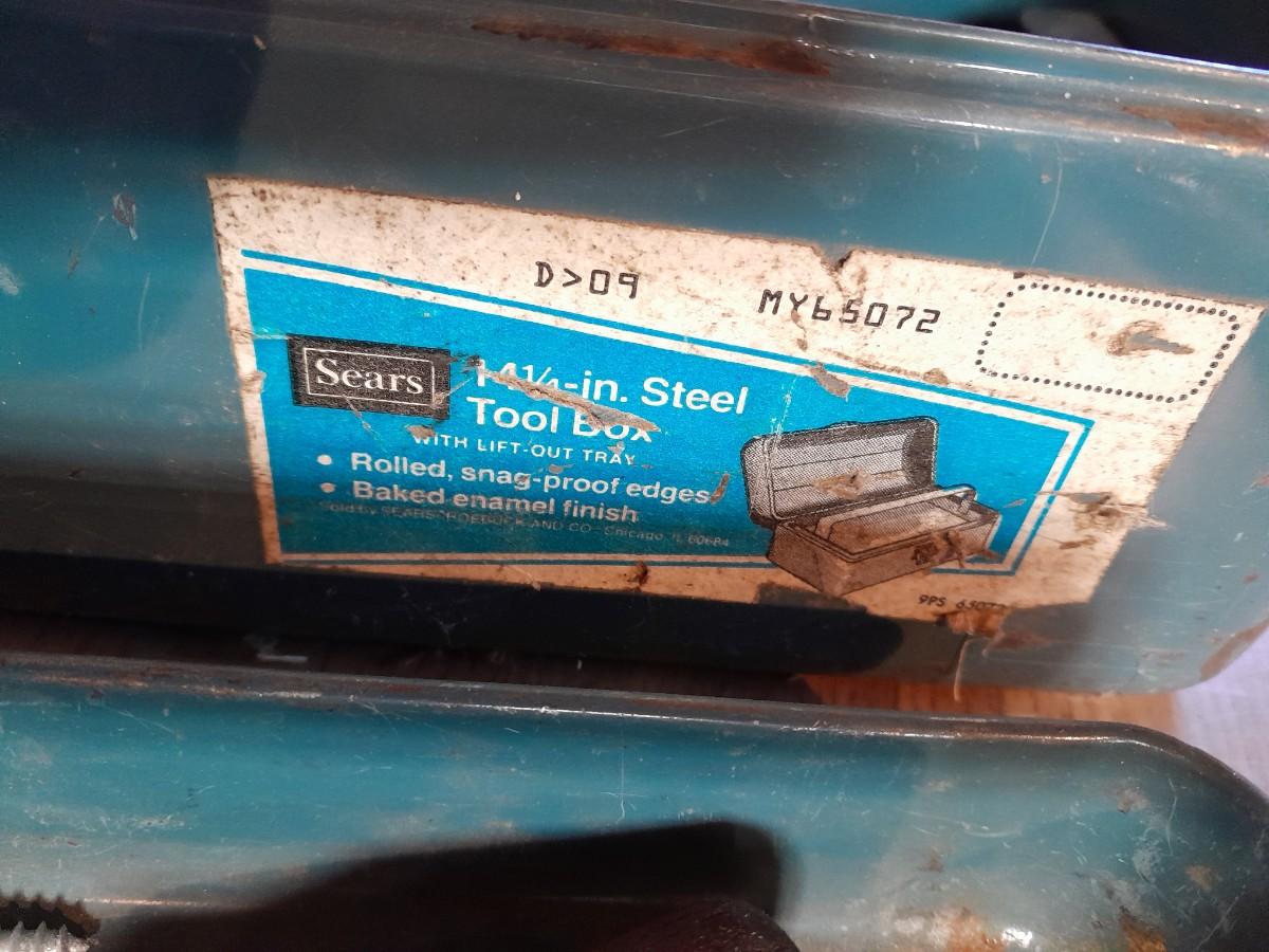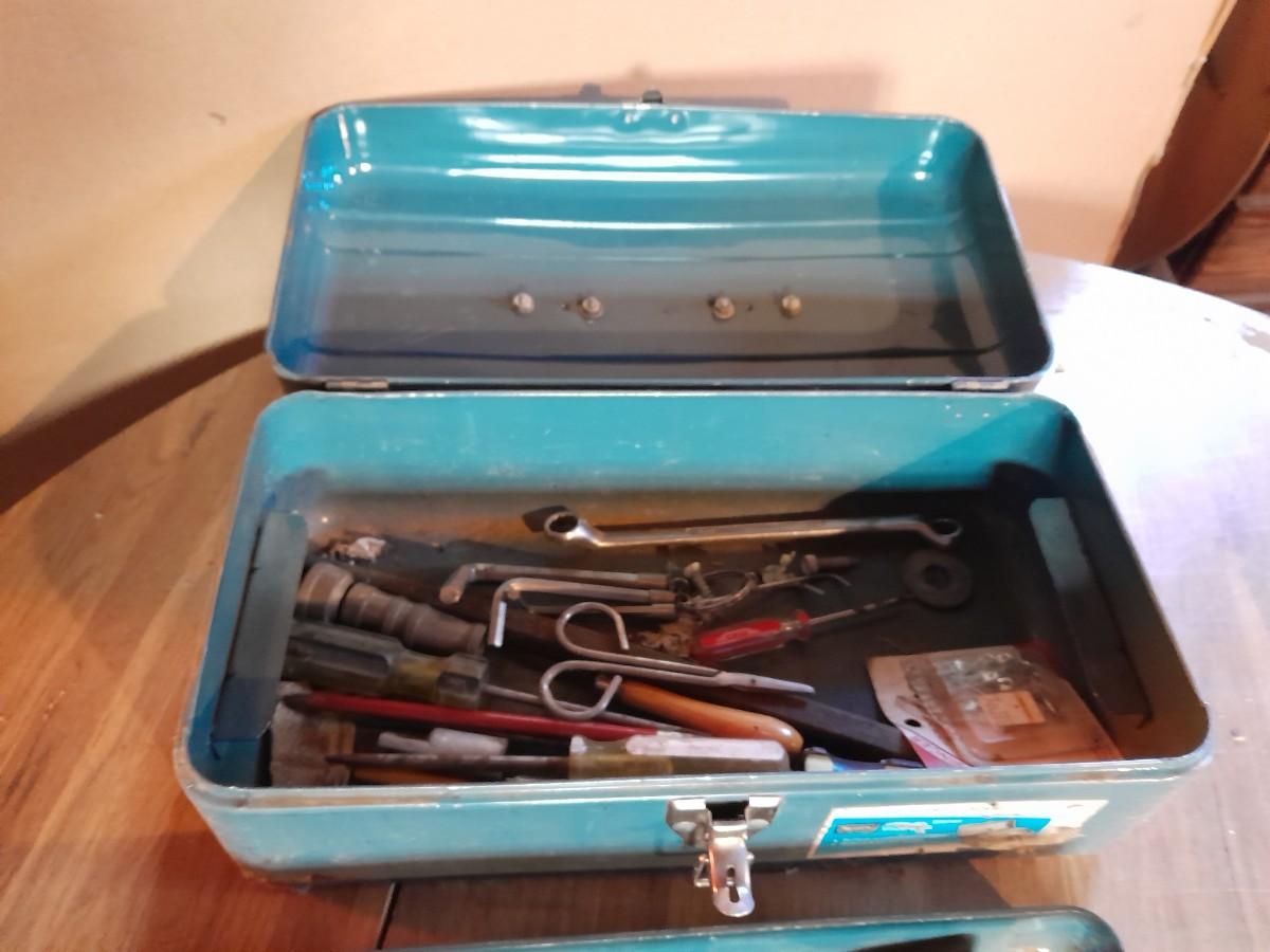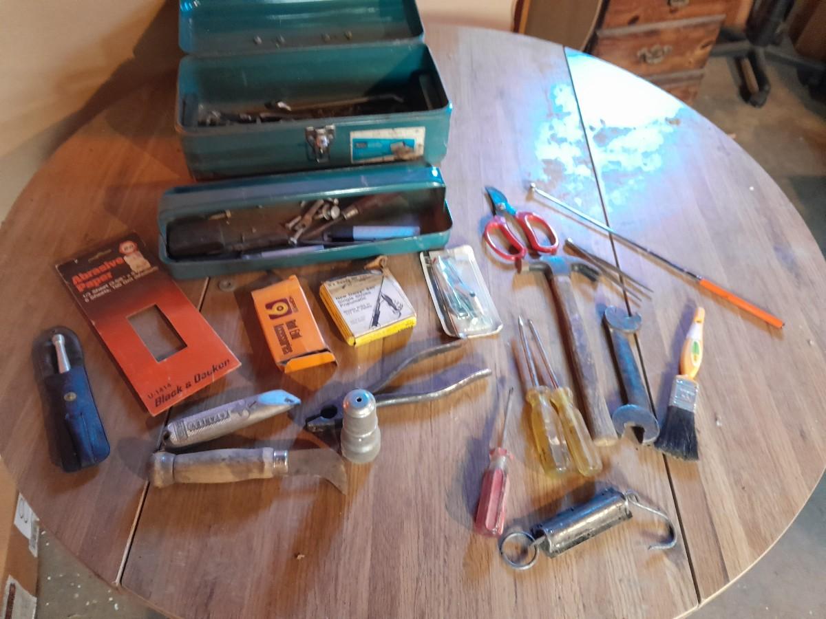 METAL TOOLBOX WITH HAND TOOLS, AND PAINTING SUPPLIES (toolbox handle is broken, but is included for easy repair)