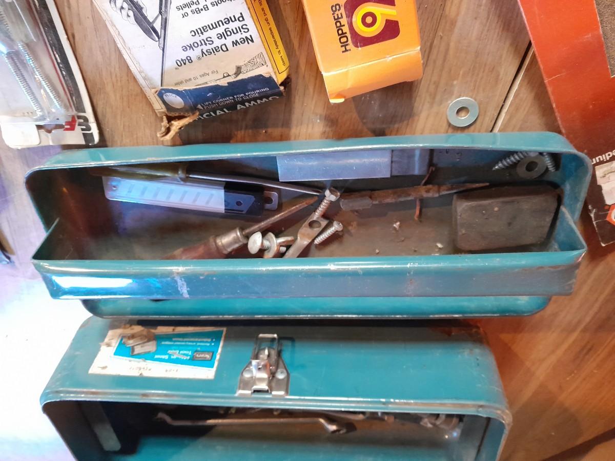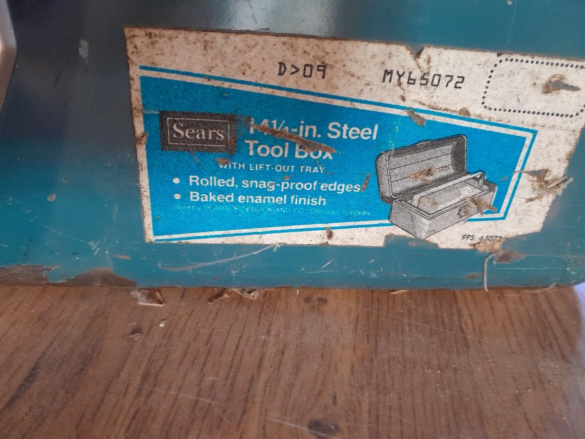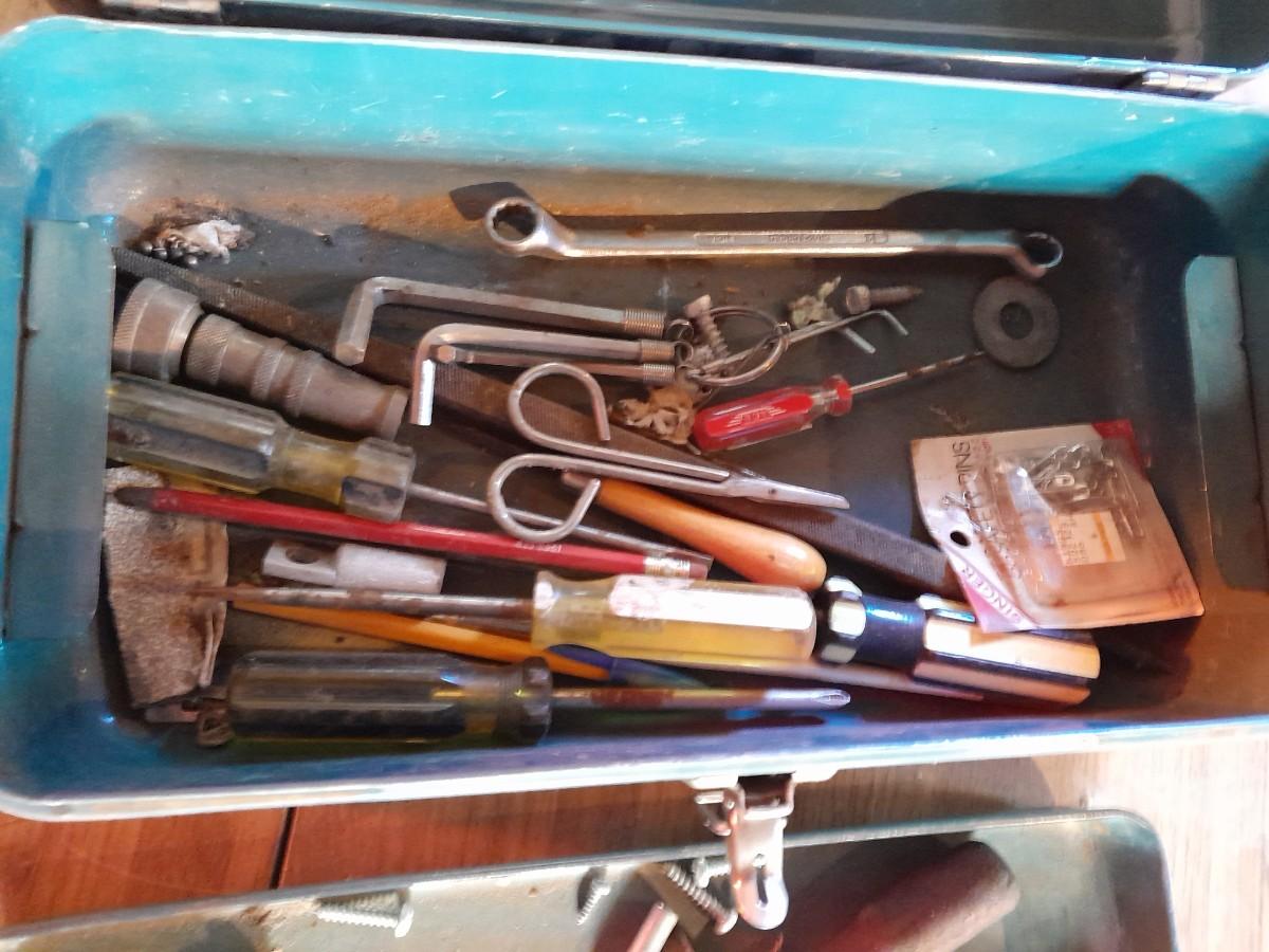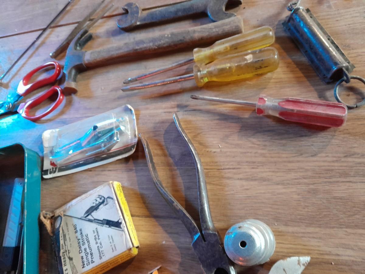 METAL TOOLBOX WITH HAND TOOLS, AND PAINTING SUPPLIES (toolbox handle is broken, but is included for easy repair)