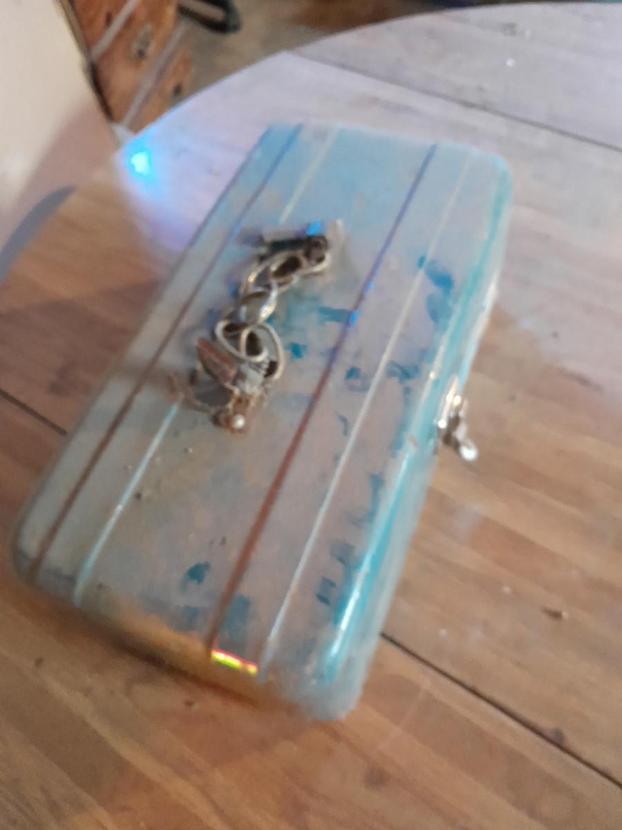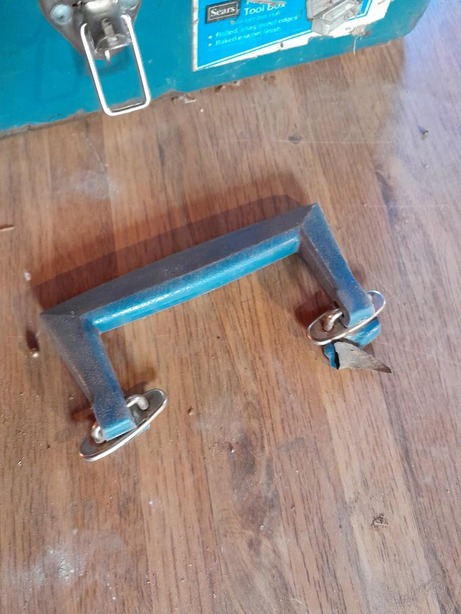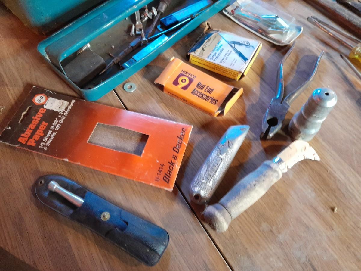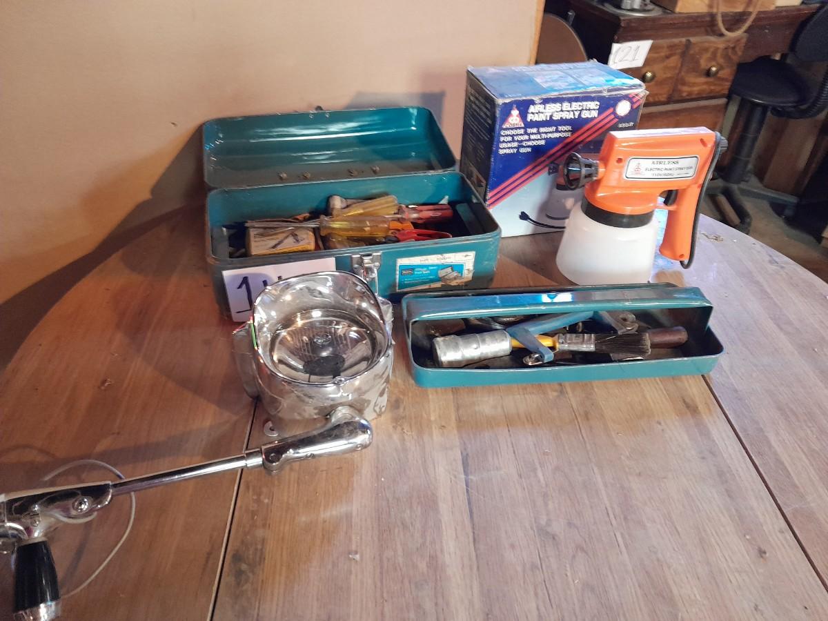 METAL TOOLBOX WITH HAND TOOLS, AND PAINTING SUPPLIES (toolbox handle is broken, but is included for easy repair)