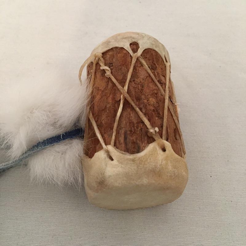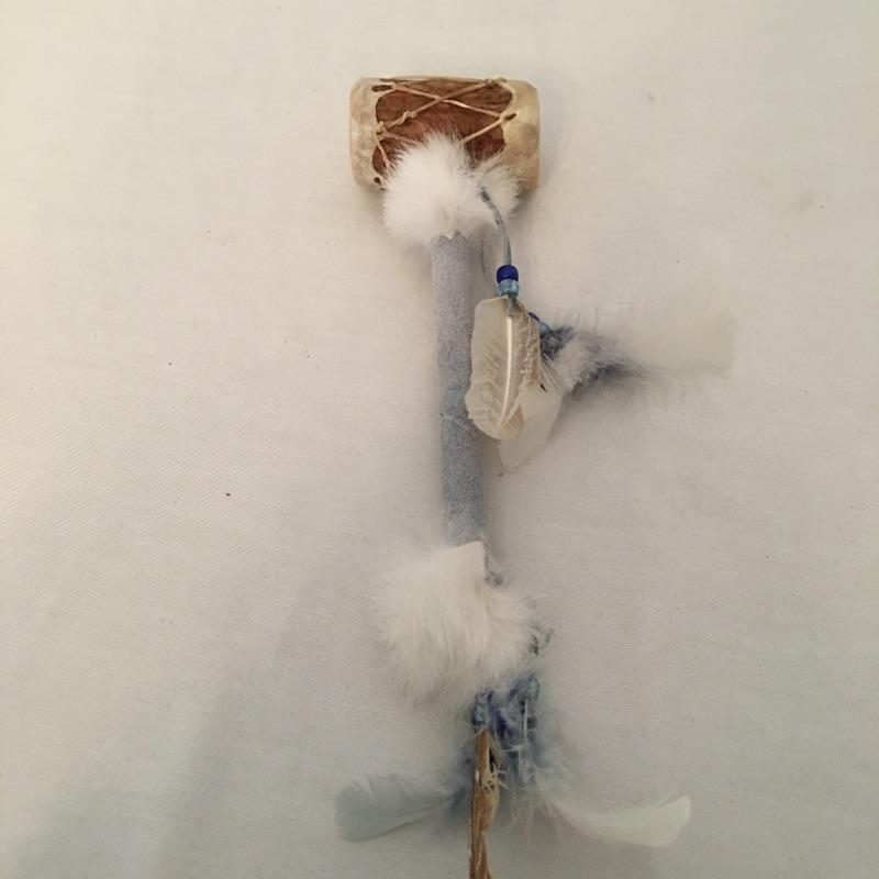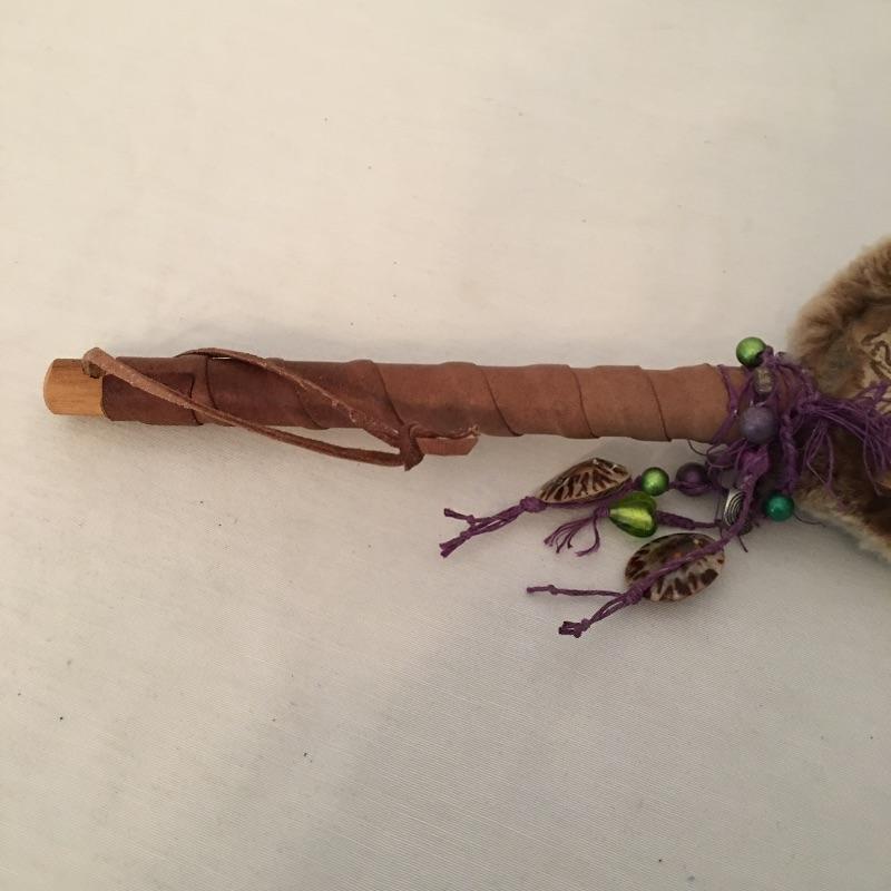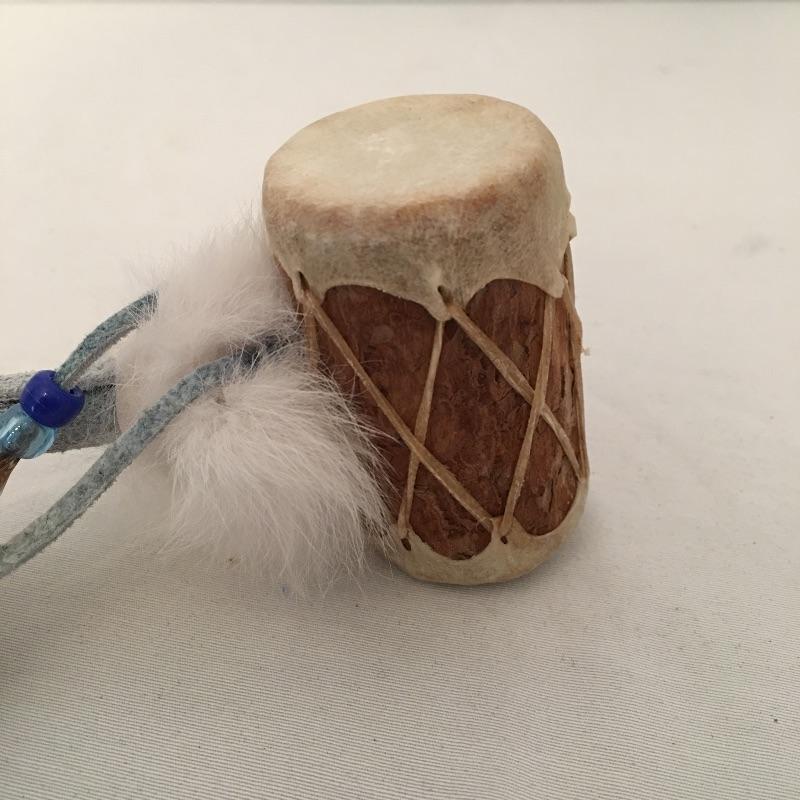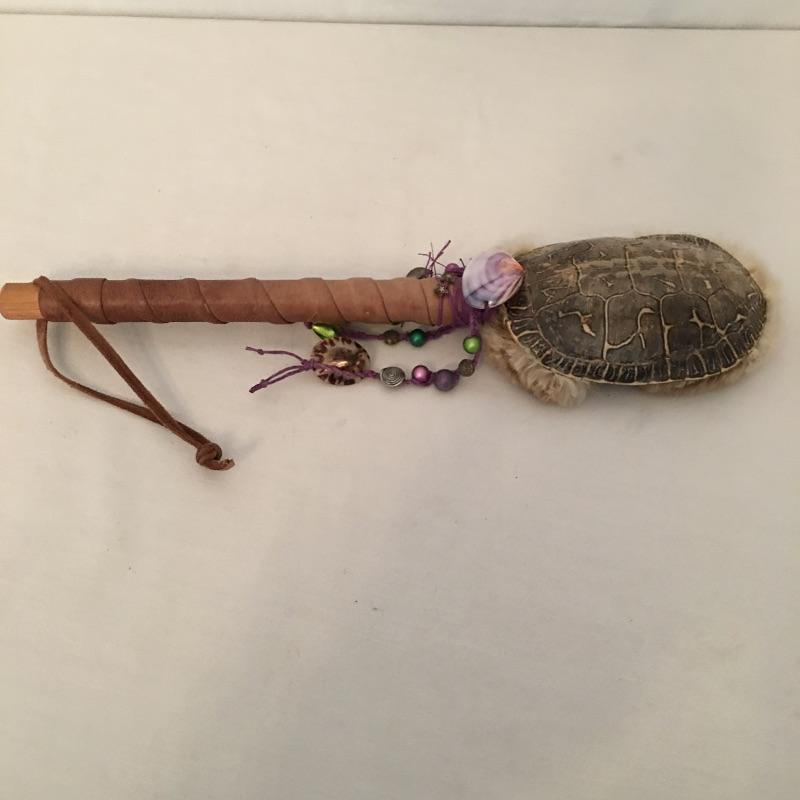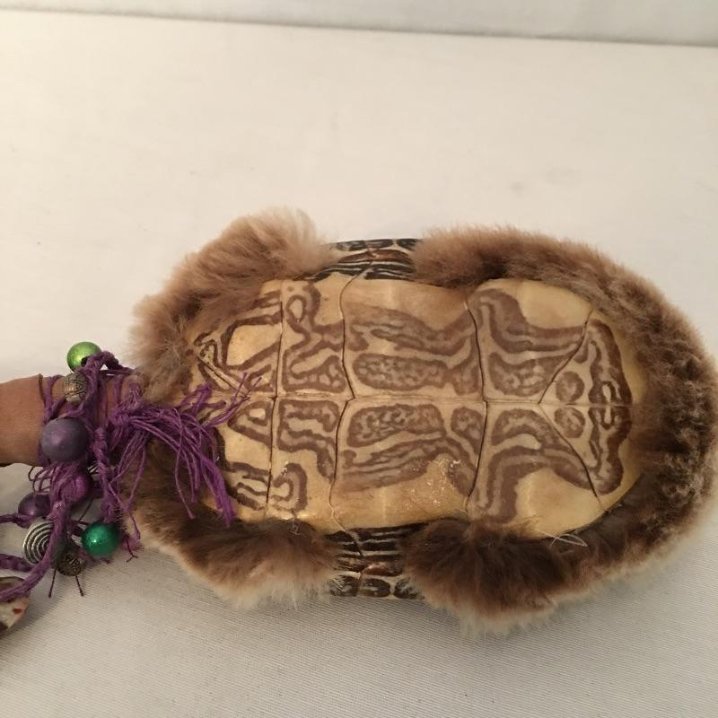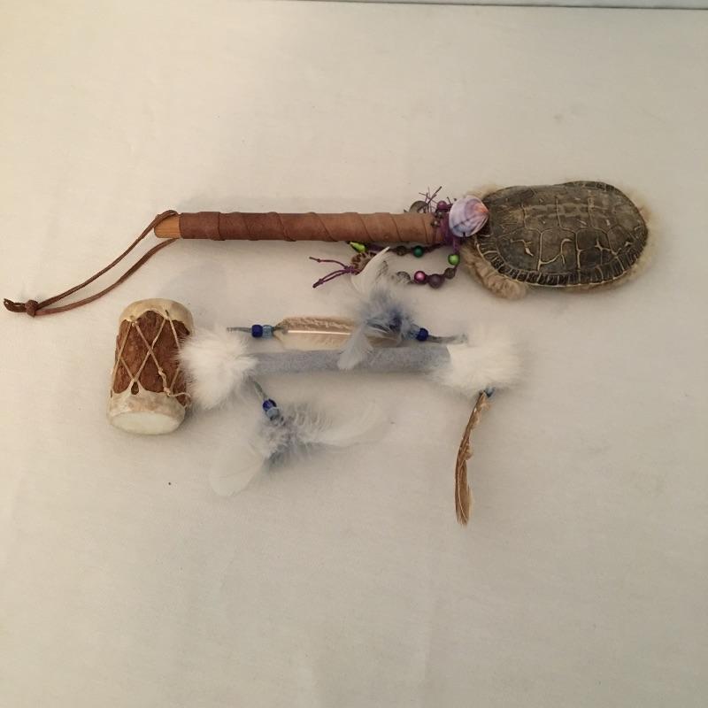 Amazing, unique finds here that include a Native American rattle that appears to be made from a turtle shell with a wooden handle and a rattle shaped like a drum with a wooden handle. and feathers