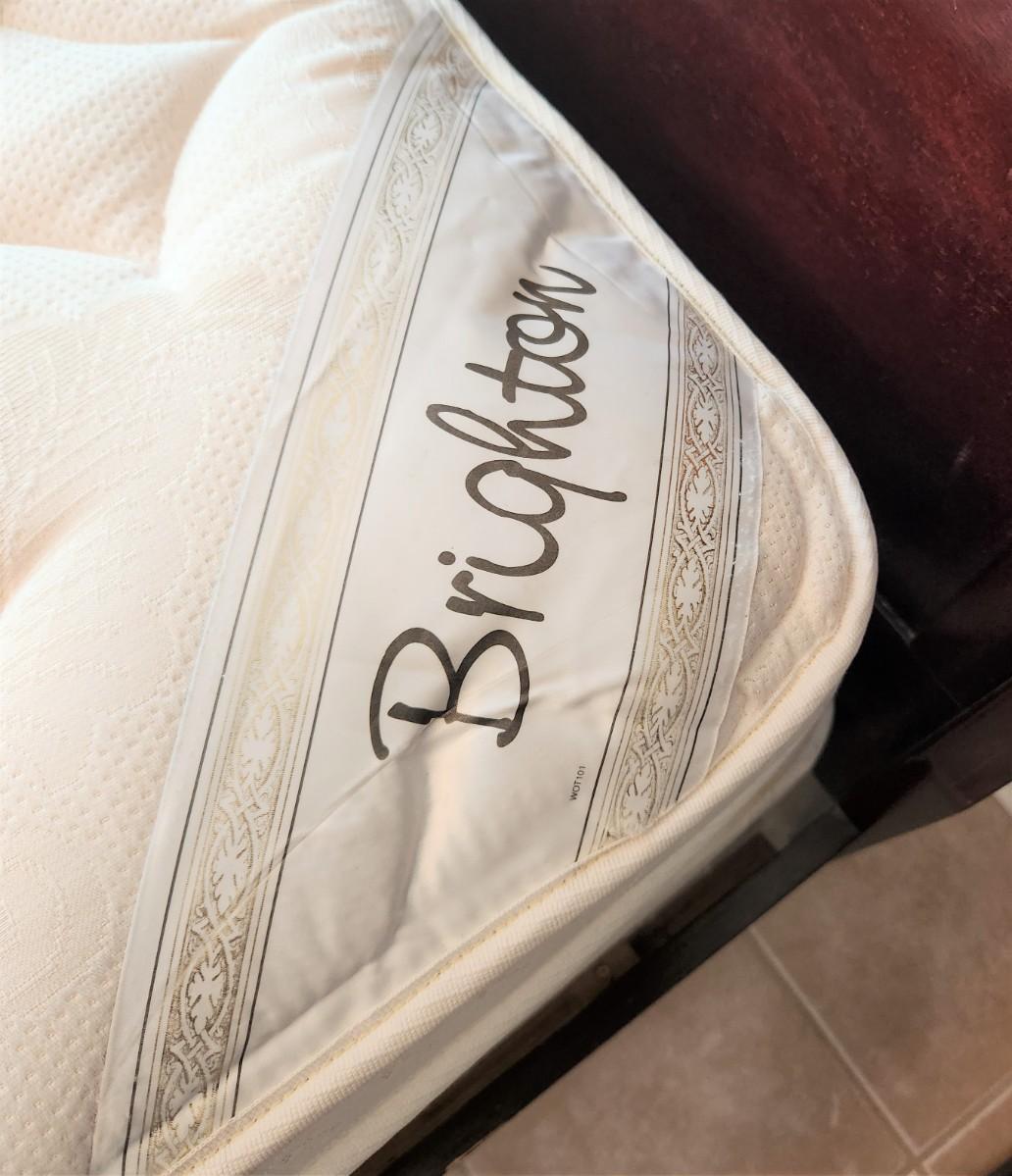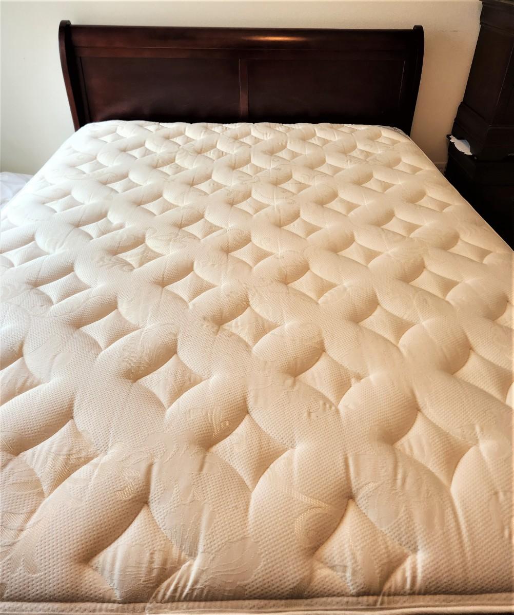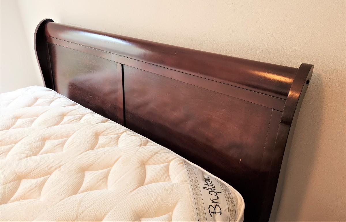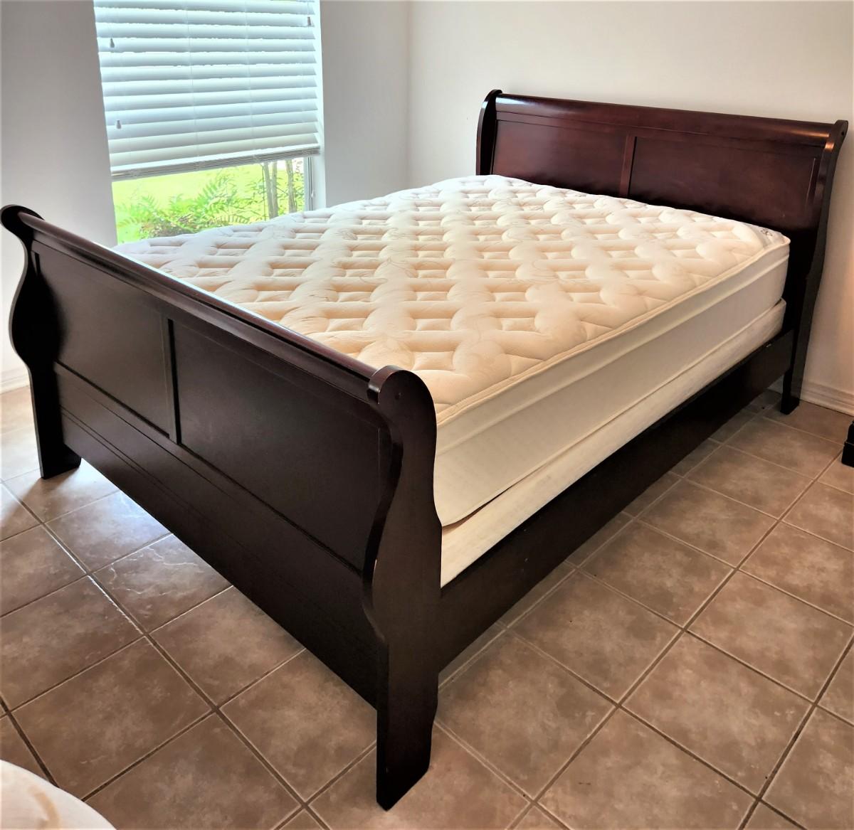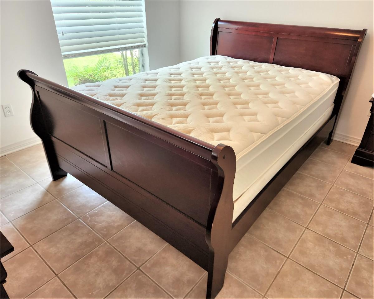 Super clean Contemporary queen size bed with great pillowtop mattress set - like new! Mahogany finish, no maker noted. Headboard is 63" across, 44" tall, foot board is 34" tall.