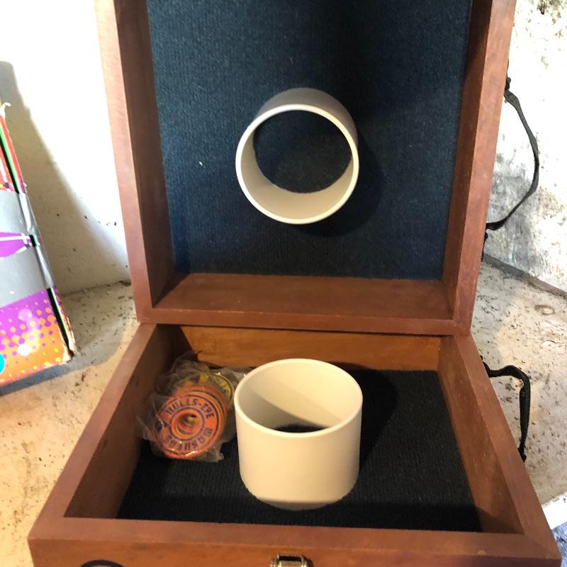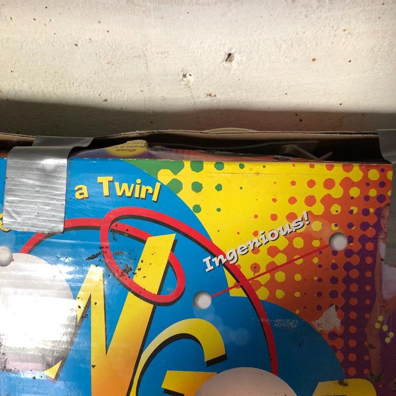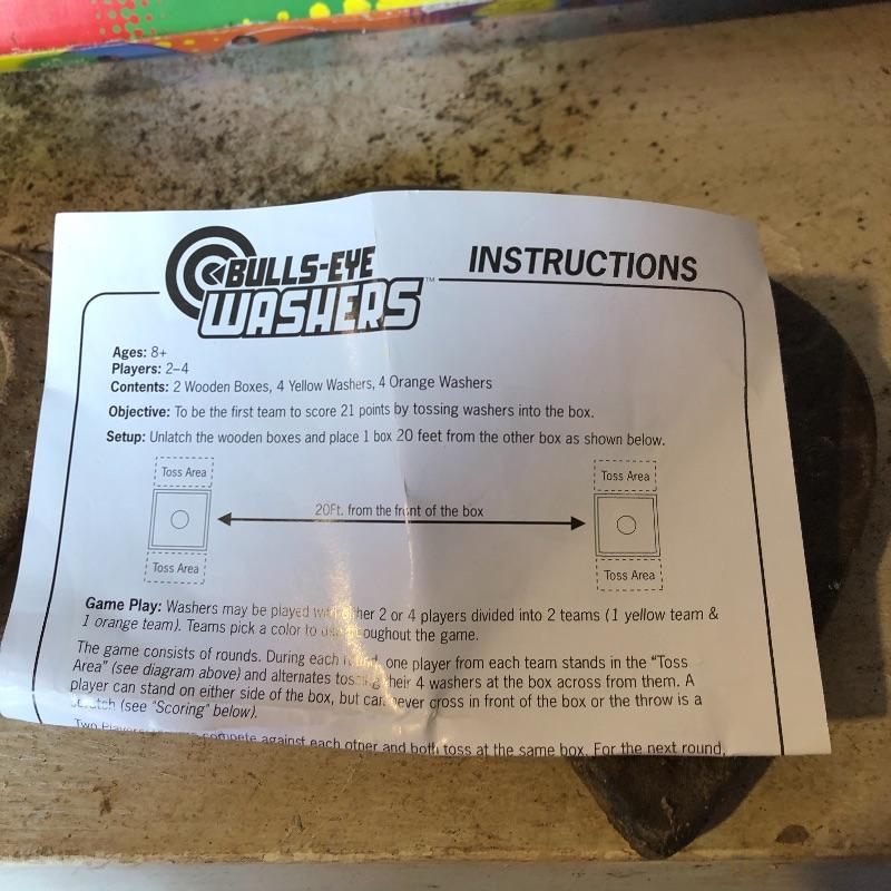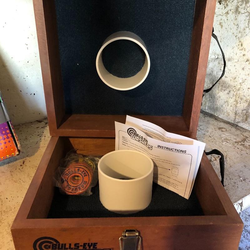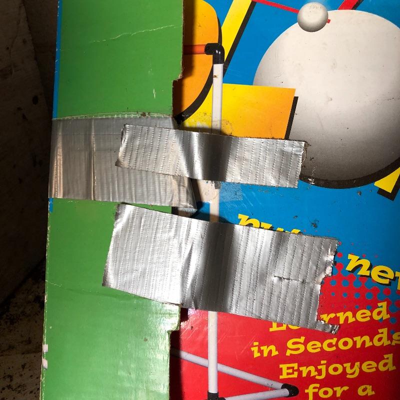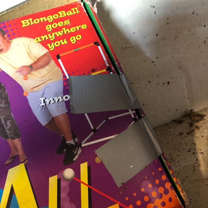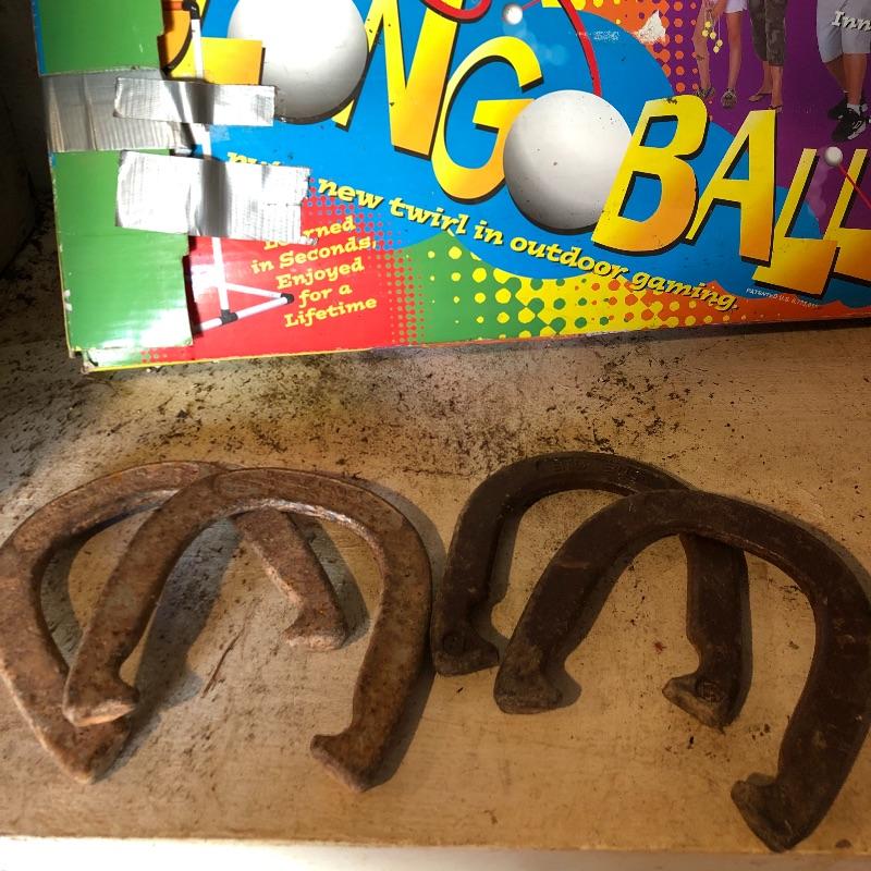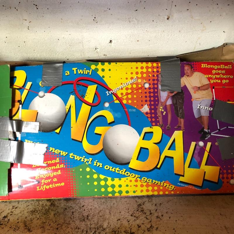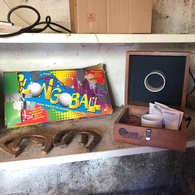 This lot includes several outdoor games that will guarantee fun for the whole family. It includes horseshoes for tossing, Bulls-Eye Washers in the original box with instructions, and Blong Ball, a game of tossing ping pong balls attached to strings. The box is duct taped together but appears to include all the necessary pieces. Local pickup only.