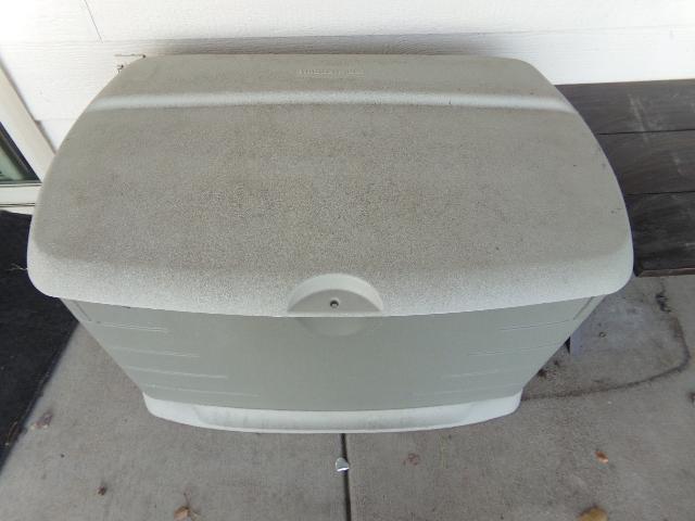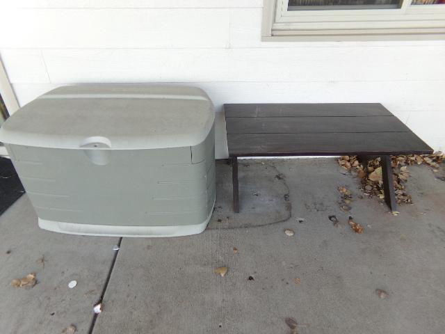 PLASTIC OUTDOOR STORAGE CHEST AND SMALL TABLE. THEY NEED TO BE CLEANED DUE TO THEM BEING OUTSIDE. BUT THEY ARE IN GOOD CONDITION.