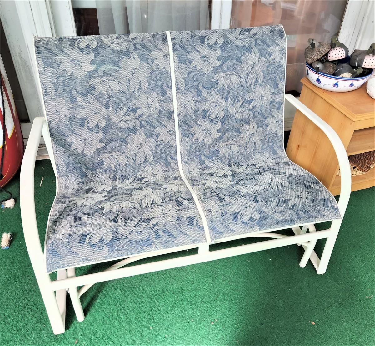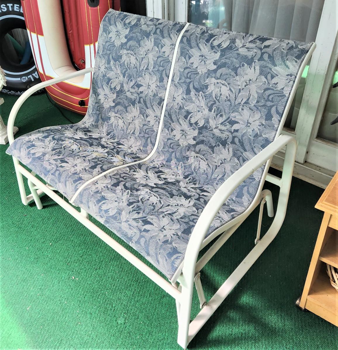 Good contemporary two seater glider - patio or deck - smooth action. 33" tall, 44" across, 29" deep.